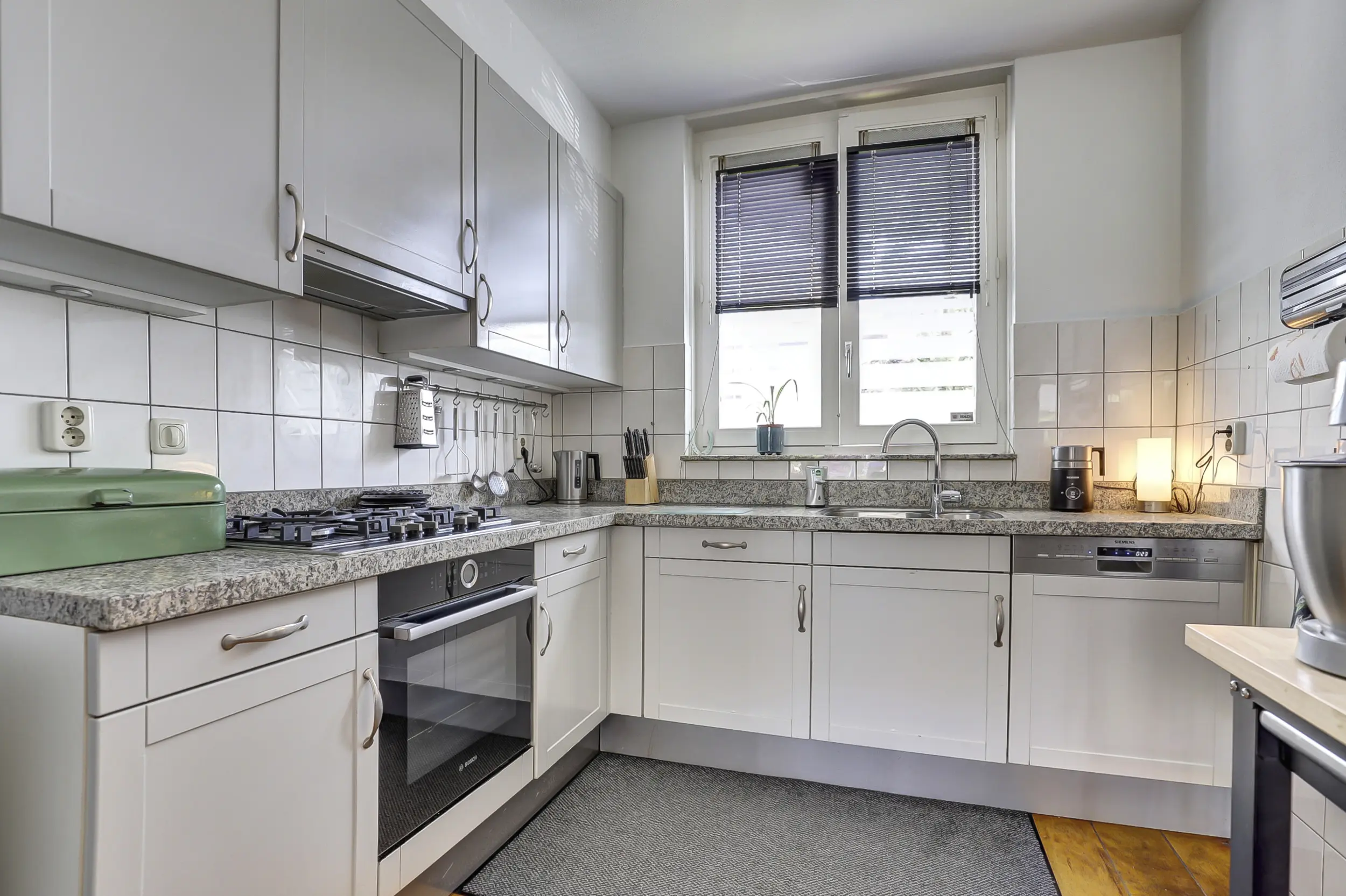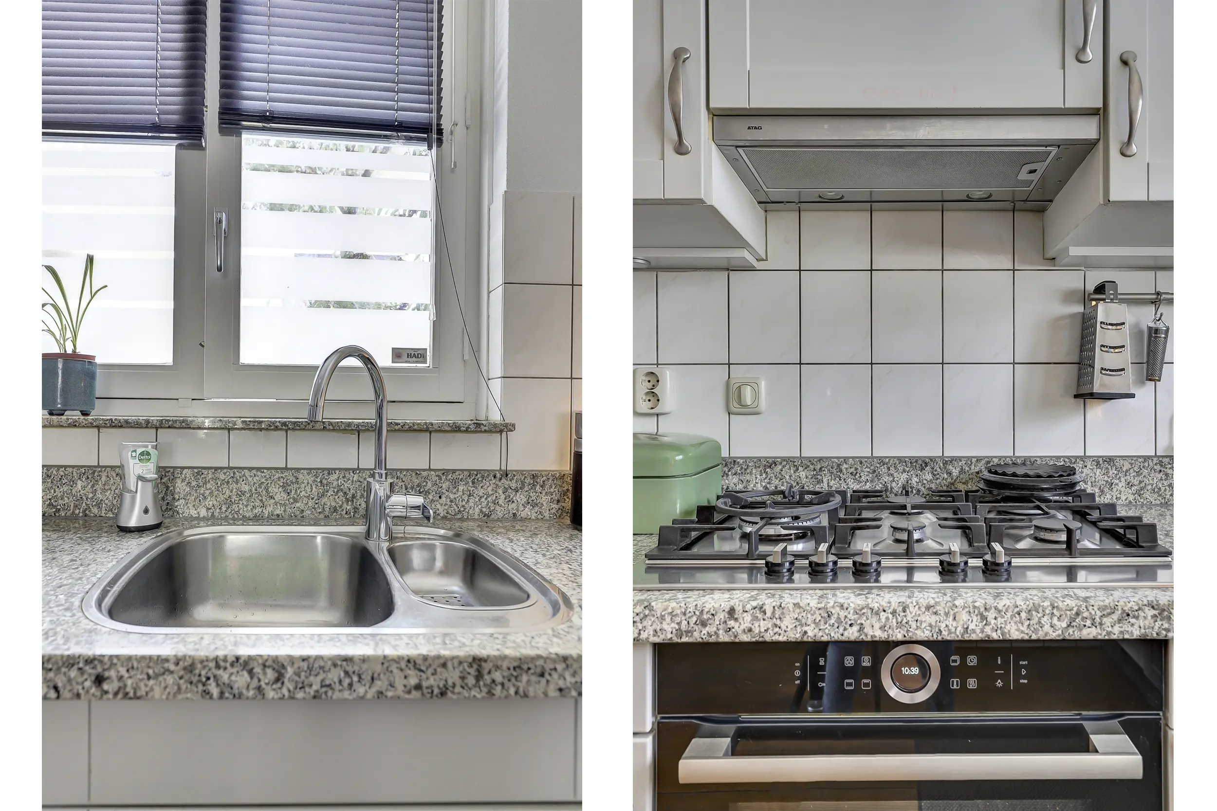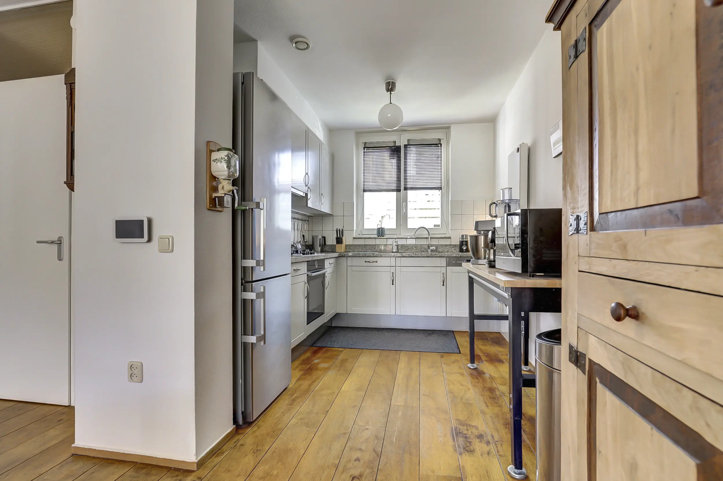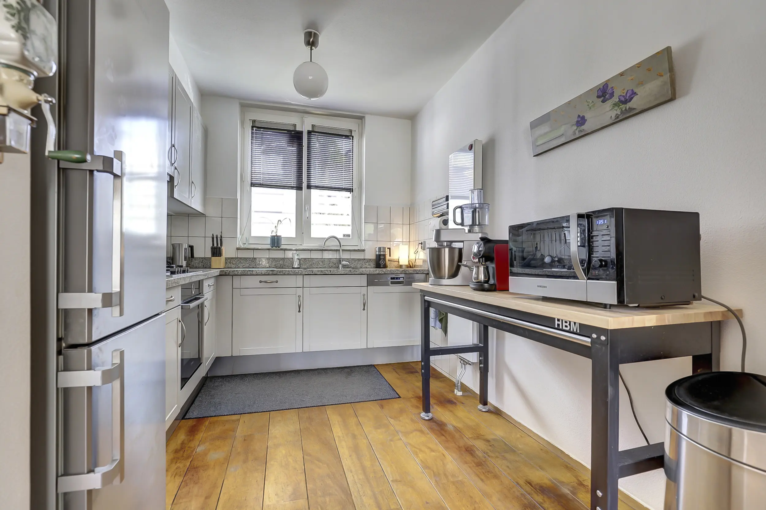 De lichte, open keuken is aan de voorzijde gelegen en opgesteld in een L-vorm met een granieten werkblad. De keuken is uitgerust met een geïntegreerde gaskookplaat met vijf branders, waaronder een krachtige wokbrander, een combi-oven, afzuigkap en vaatwasser. De koel-/vriescombinatie kan desgewenst achterblijven.
