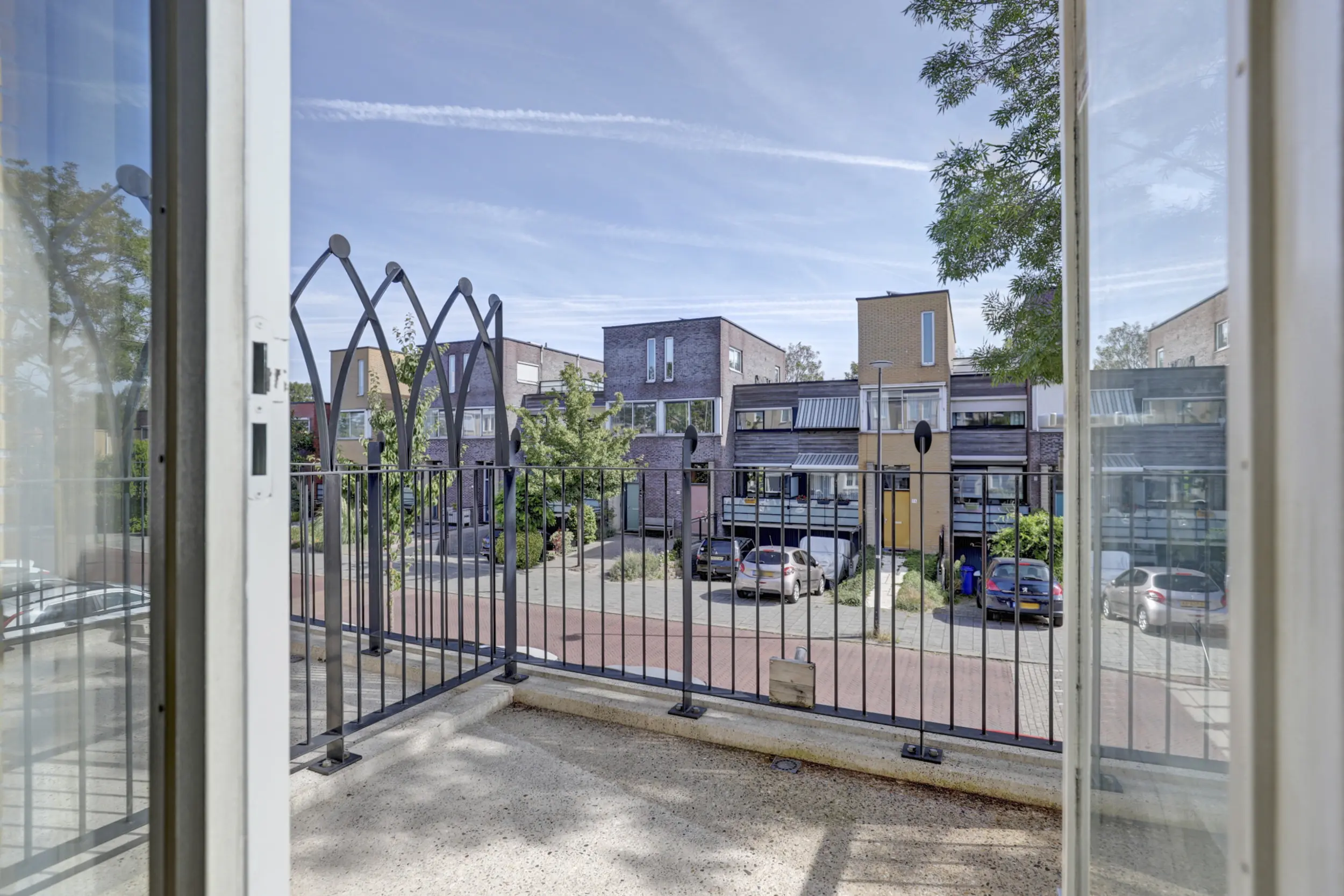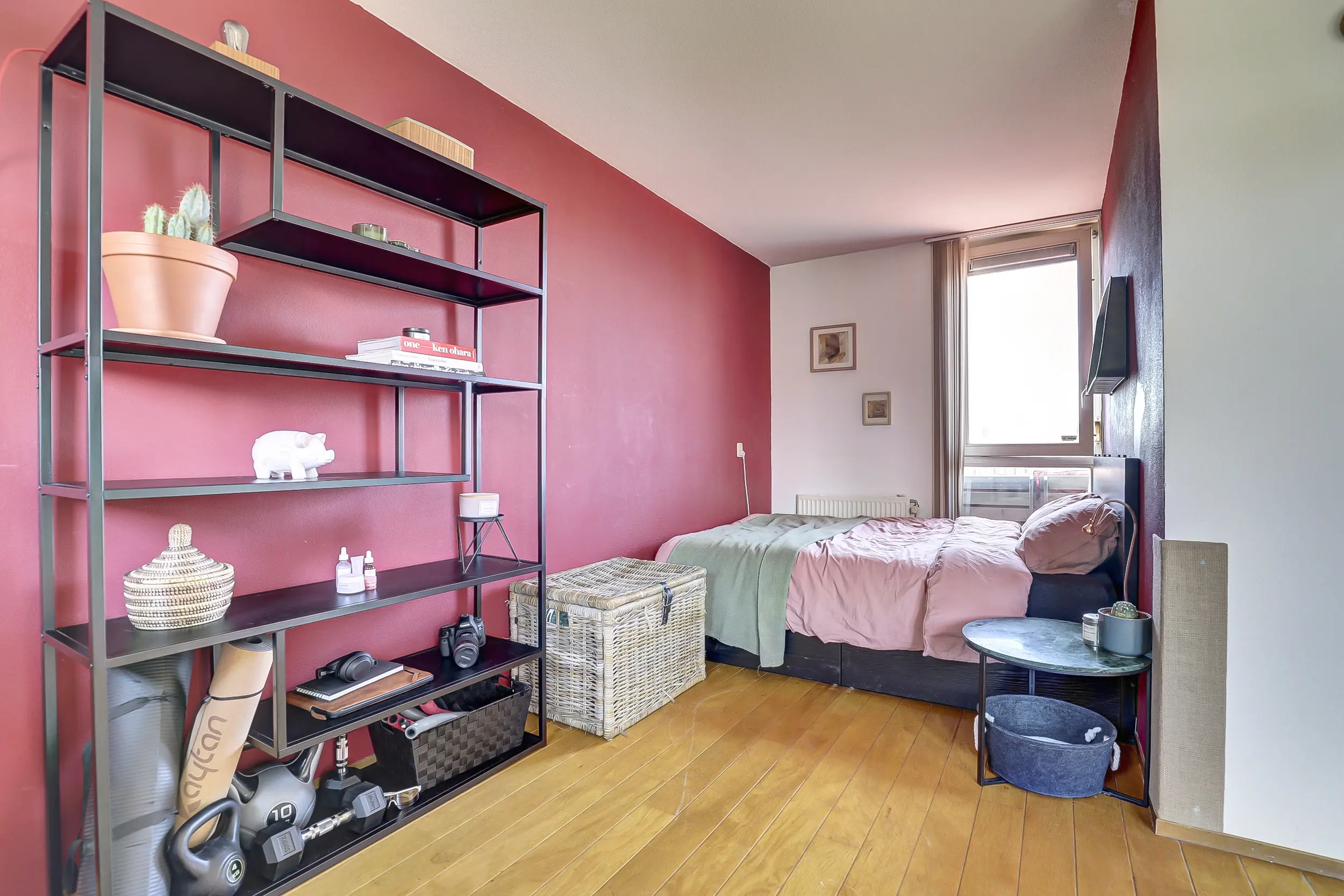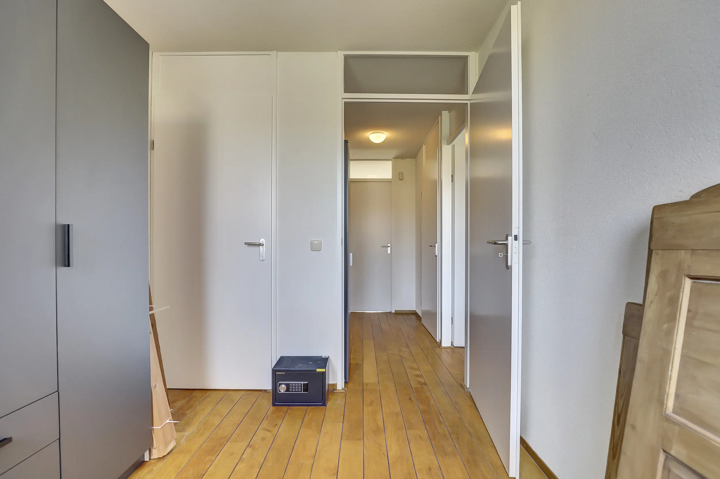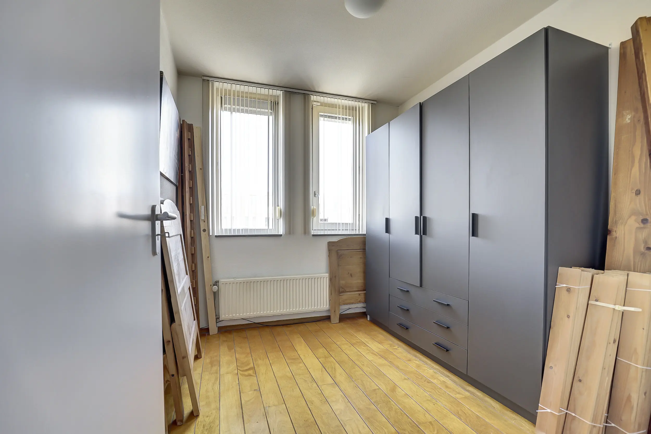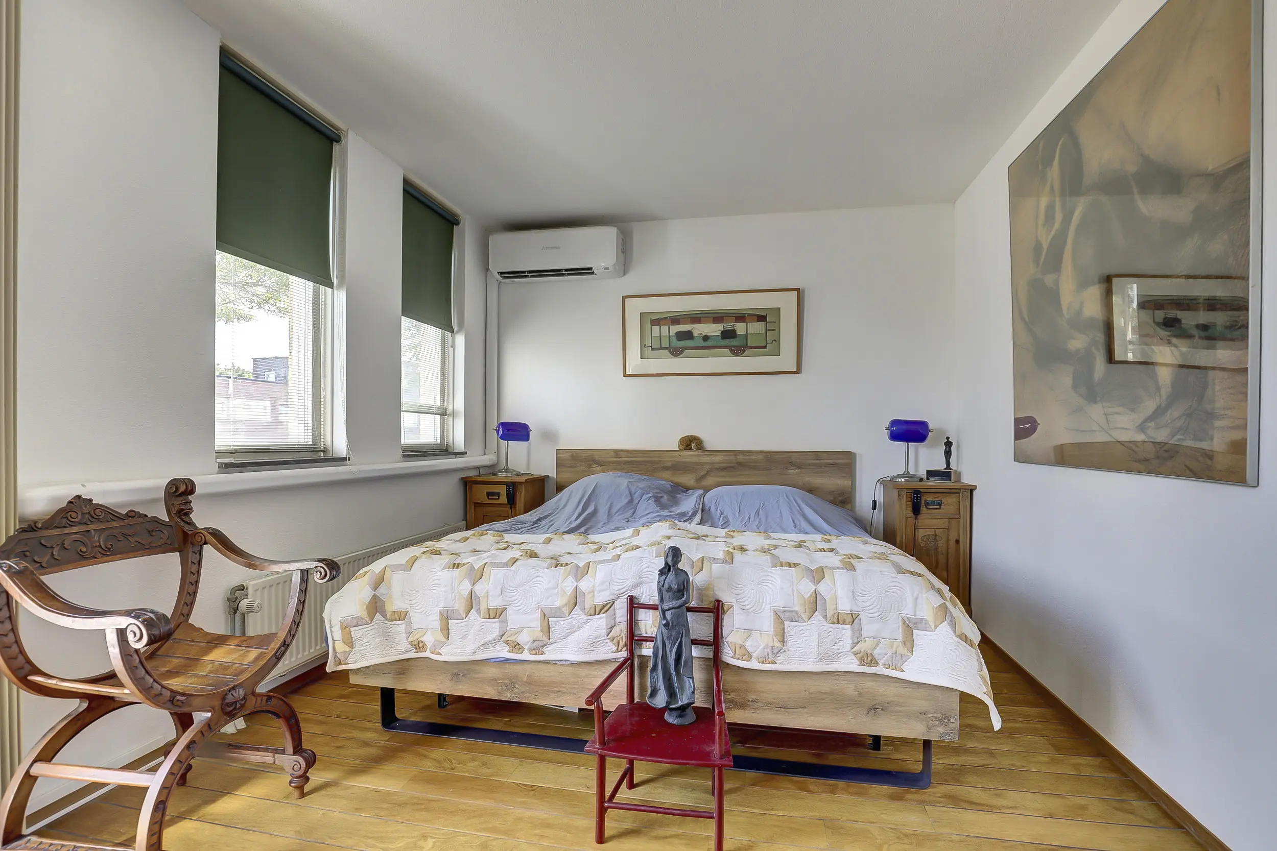 Ruime overloop. De hoofdslaapkamer bevindt zich aan de voorzijde en beslaat de volledige breedte van de woning. Via dubbele deuren heeft u toegang tot het ruime balkon, met een leuk uitzicht over de straat.