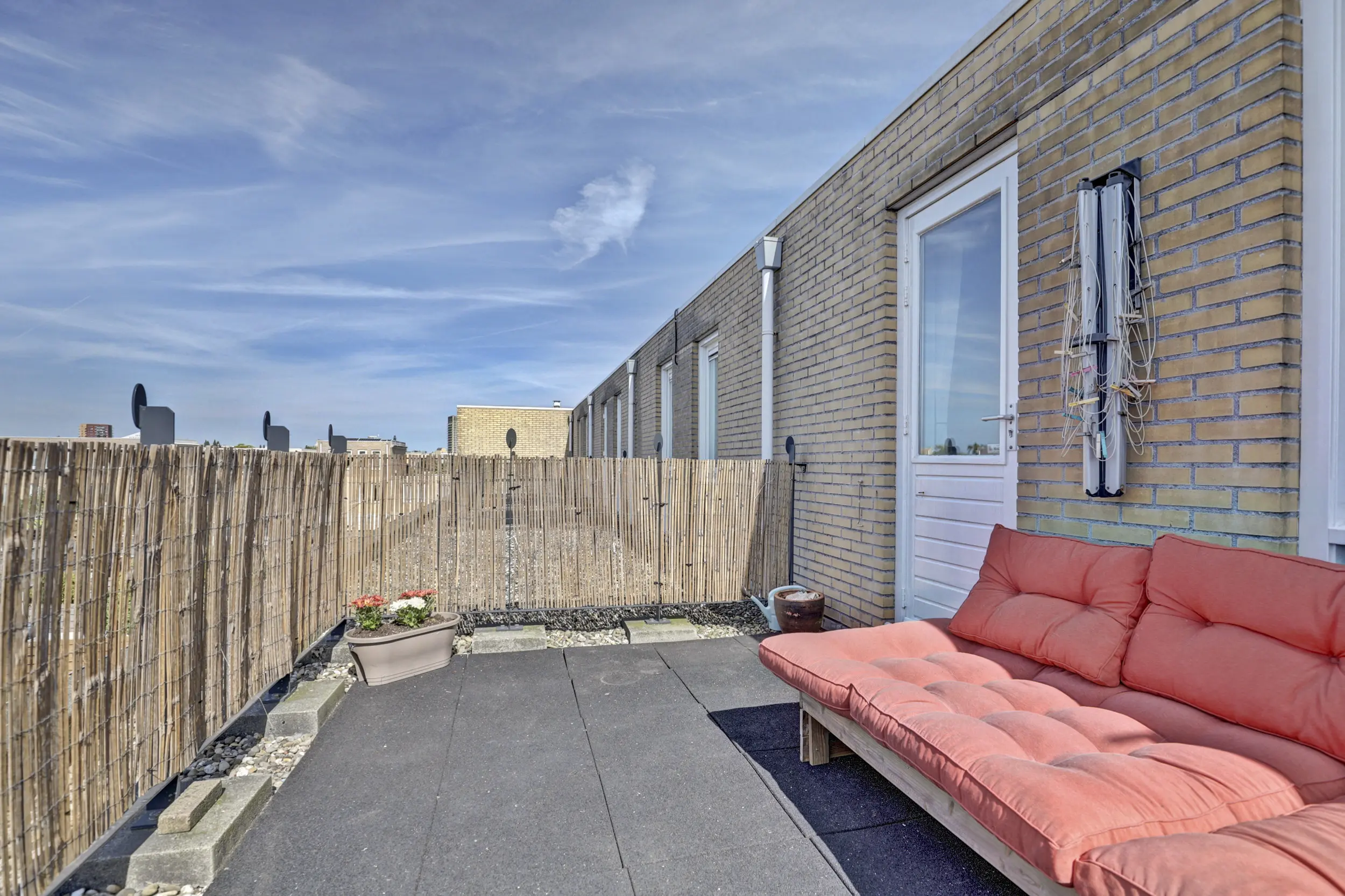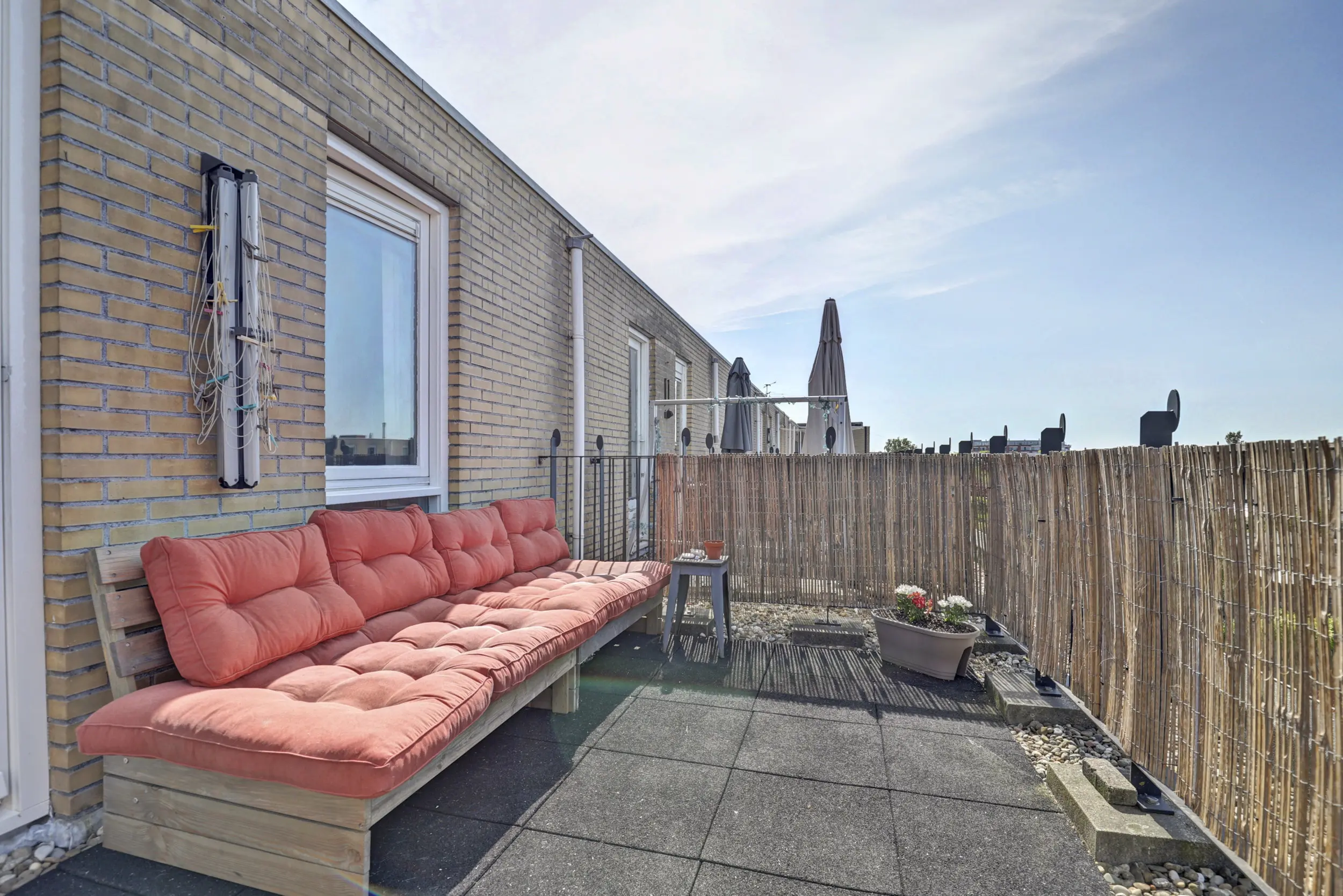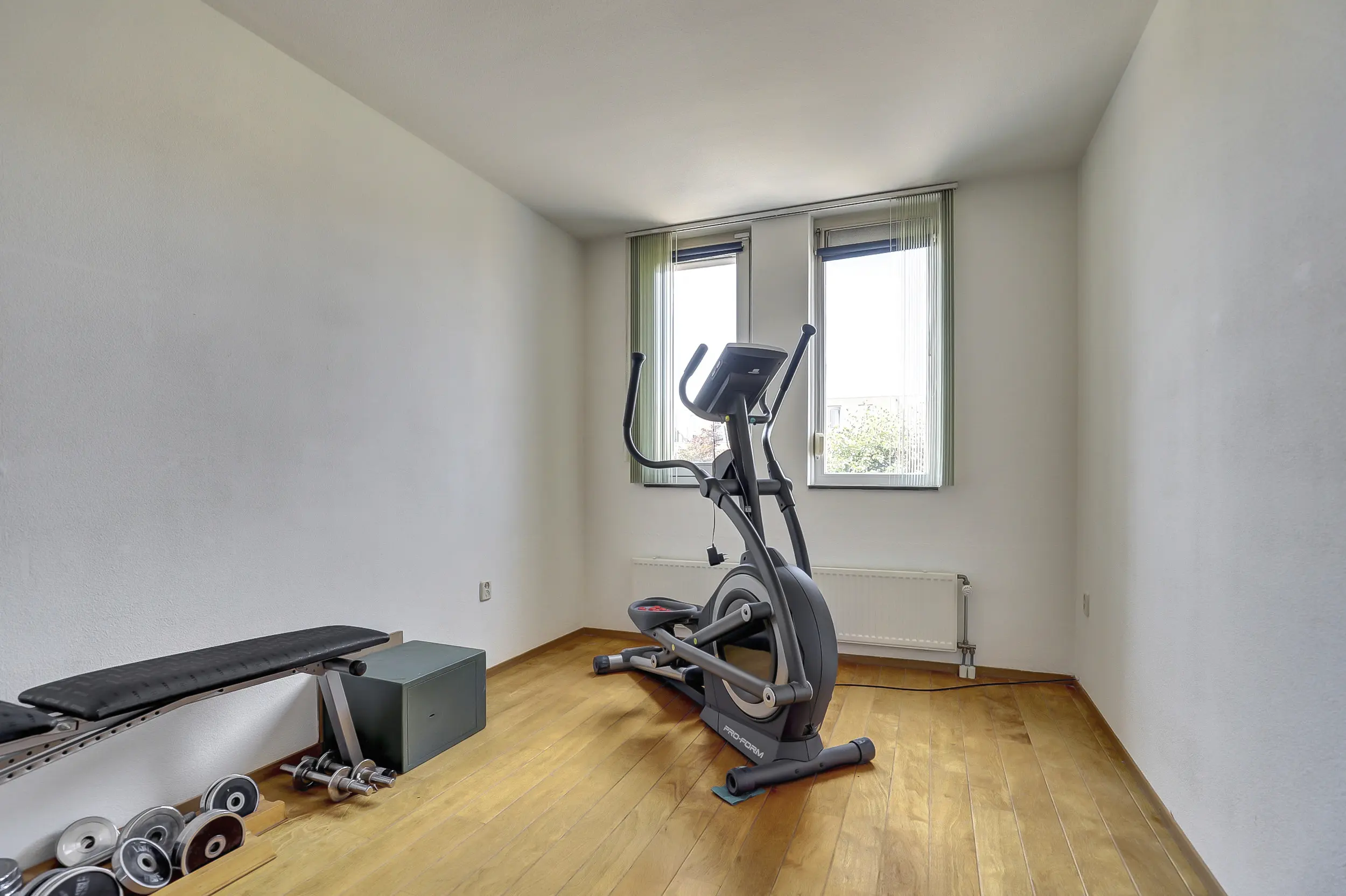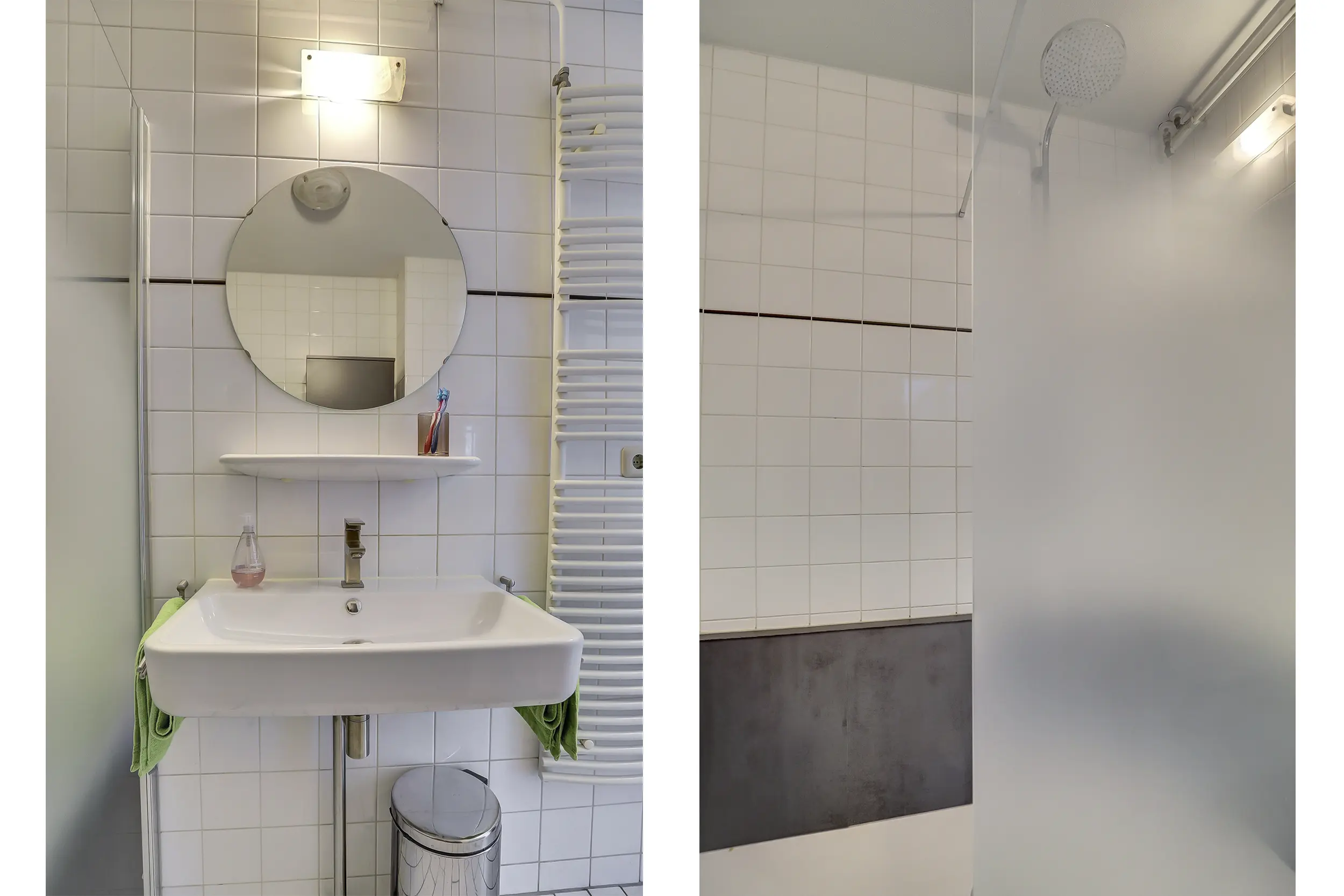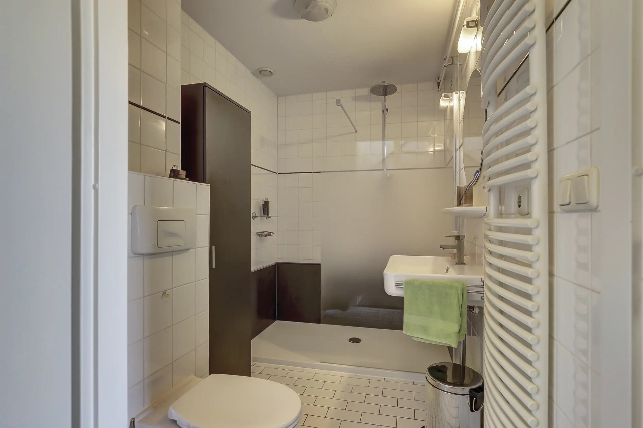 Aan de achterzijde bevinden zich twee slaapkamers. De lichte badkamer ligt tussen deze kamers in en is voorzien van een ruime inloopdouche met Rainshower, een wastafel, tweede wandcloset en een handdoekenradiator.