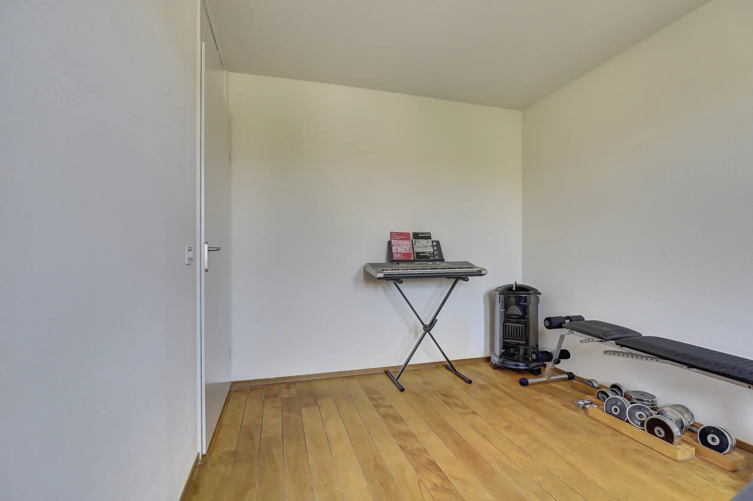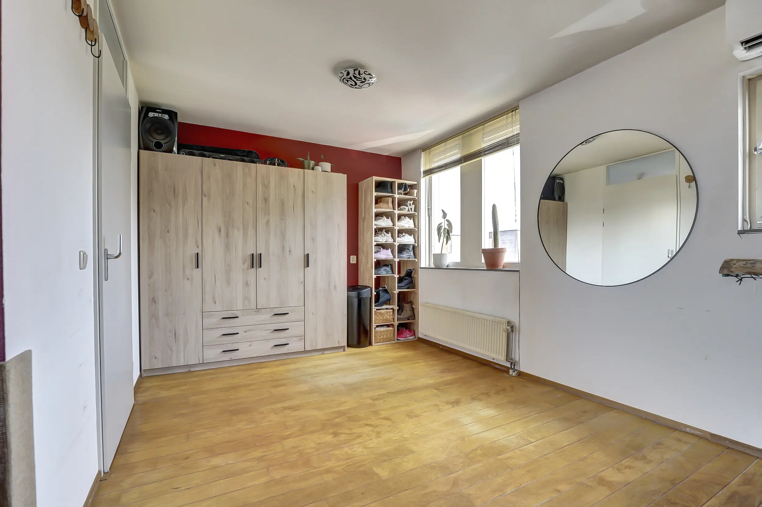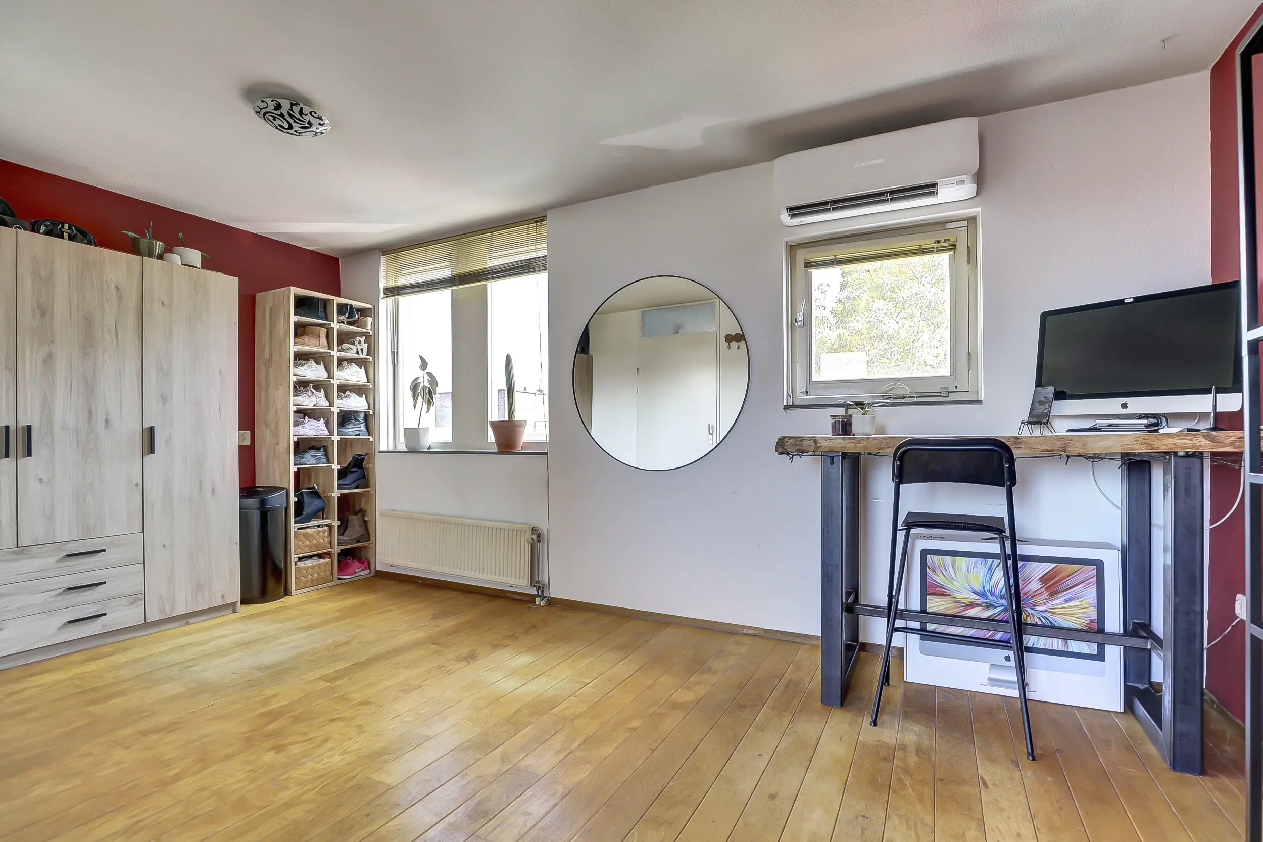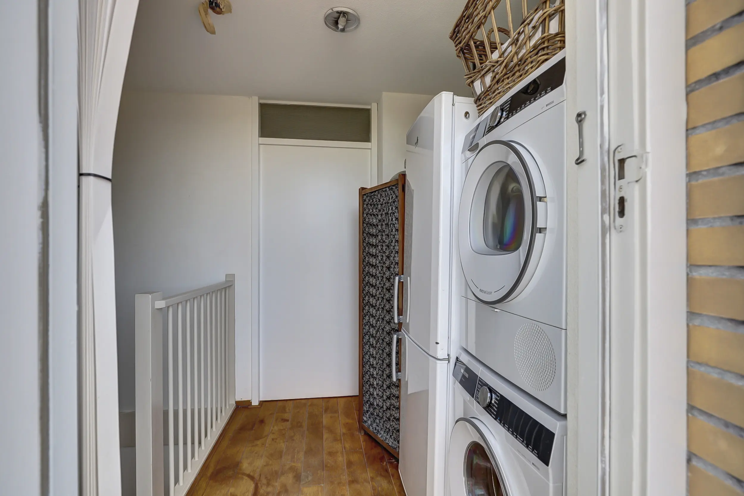 Ruime overloop met opstelplaats voor de wasmachine, de cv-combiketel (Intergas HRE, 2016) en de unit voor de mechanische ventilatie. Toegang tot het dakterras op het zuidwesten.Er bestaat de mogelijkheid om deze verdieping verder uit te breiden. Op deze etage bevindt zich een grote slaapkamer in L-vorm.