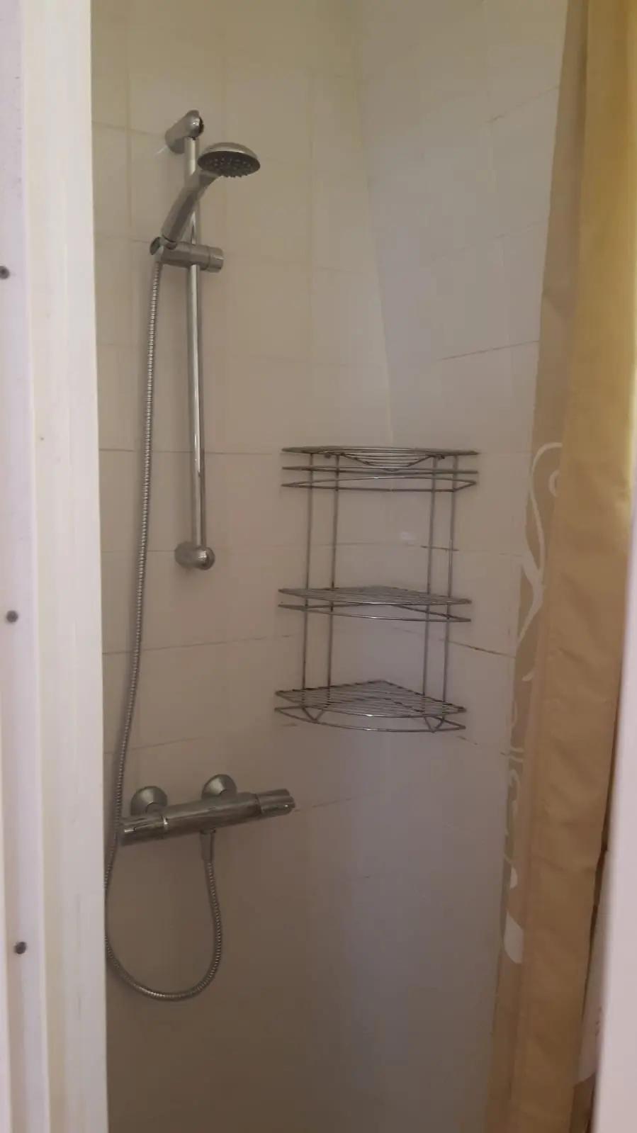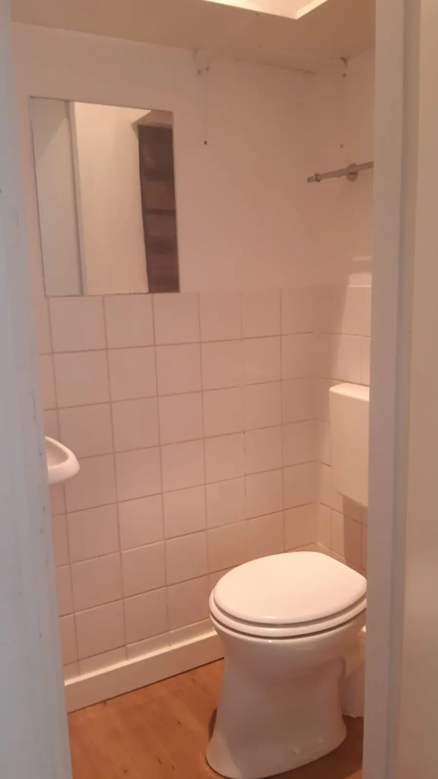 Entrance, spacious living-dining room with laminate flooring and kitchenette including plastic countertop, induction hob with extractor hood and fridge, spacious separate bedroom, modern shower and separate modern toilet