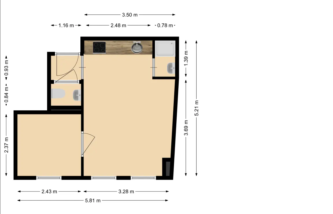 Entree, ruime woon- eetkamer vv laminaat met kitchenette o.a. vv kunststof aanrecht, inductie kookplaat met afzuigkap en koelkast, afgescheiden royale slaapkamer, moderne douche en afzonderlijk modern toilet