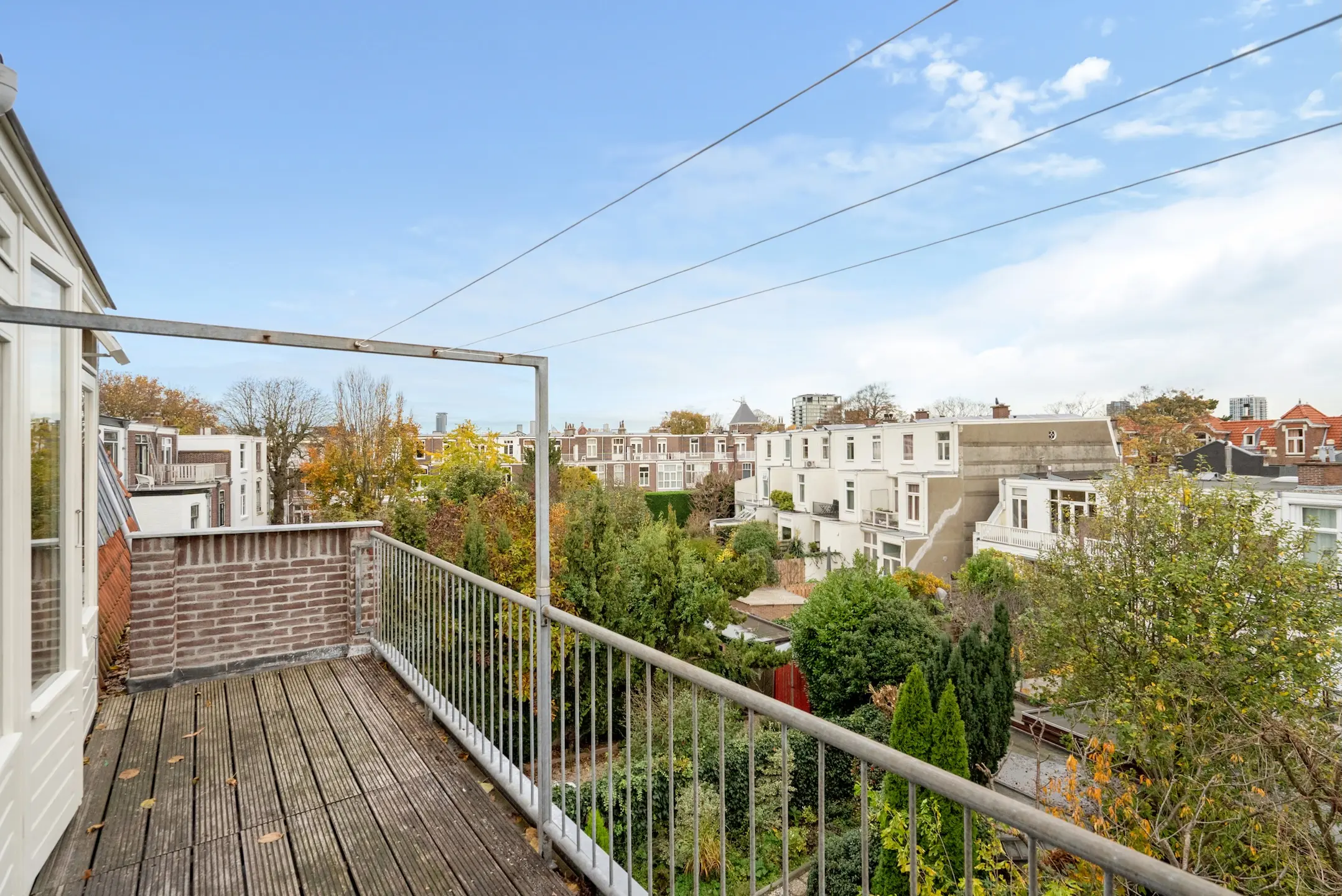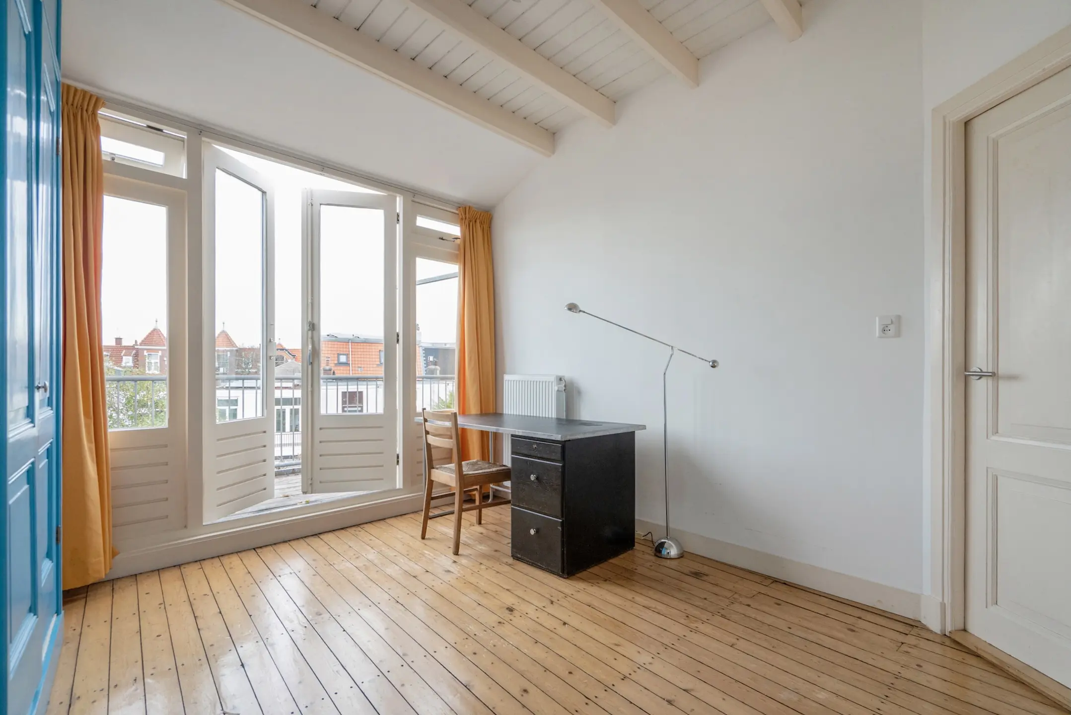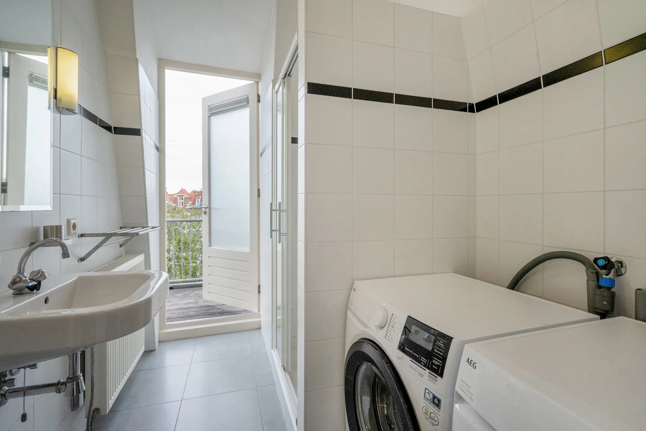 Tweede verdieping: overloop met een groot dakraam waardoor veel natuurlijk licht in het trappenhuis, gezellige slaapkamer aan de voorzijde met uitzicht op de straat, voorzijkamer, grote achterkamer met dubbele deuren naar het balkon over de volledige breedte van de woning. Tweede badkamer met een doucheruimte, wastafel, opstelplaats van de wasmachine en wasdroger en een deur naar het balkon. Separaat 3e toilet. Tussengelegen (berg)kamer met de opstelplaats van de cv-combi ketel (Nefit HR 107, cw 6), de elektrische boiler en de omvormer van de zonnepanelen.