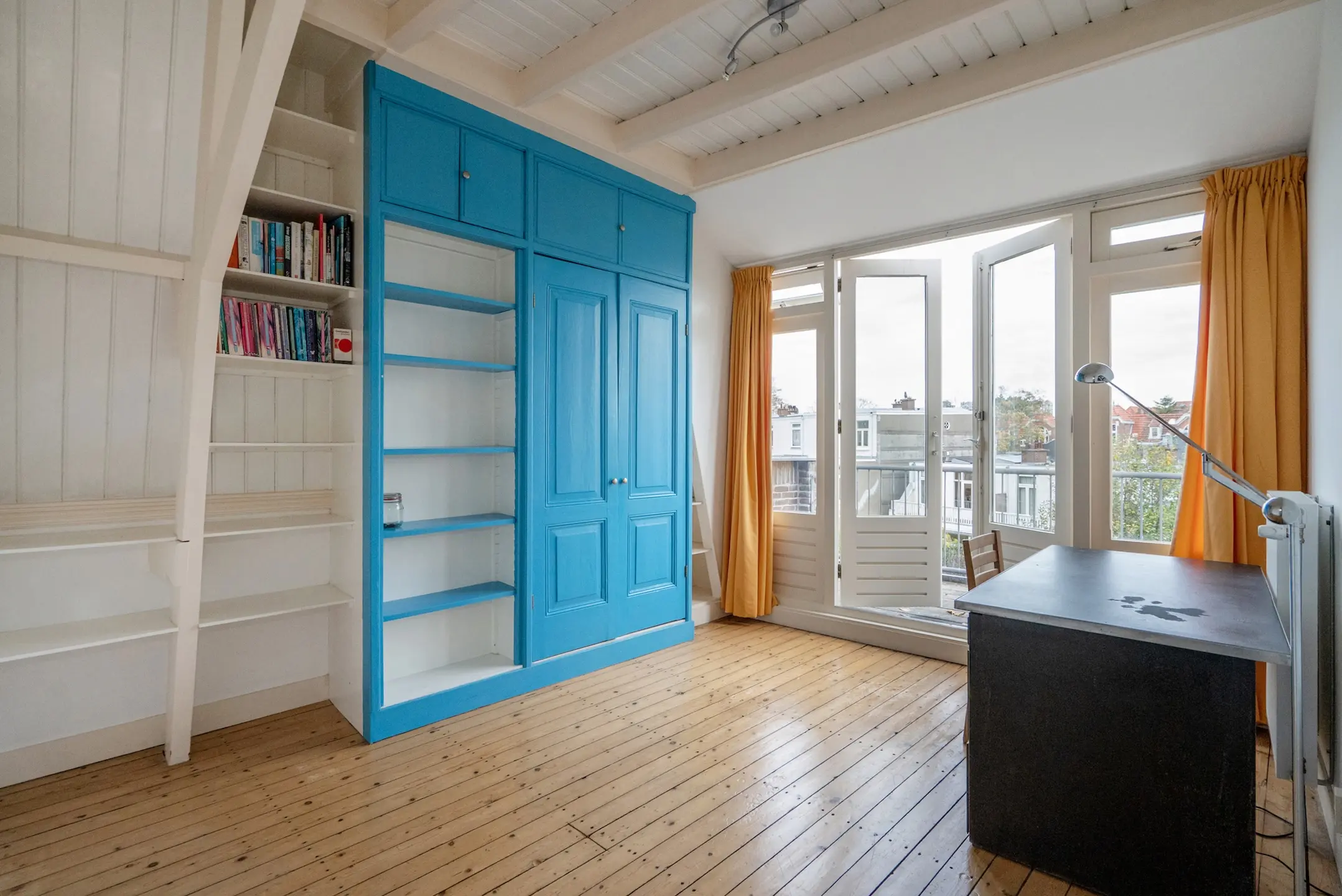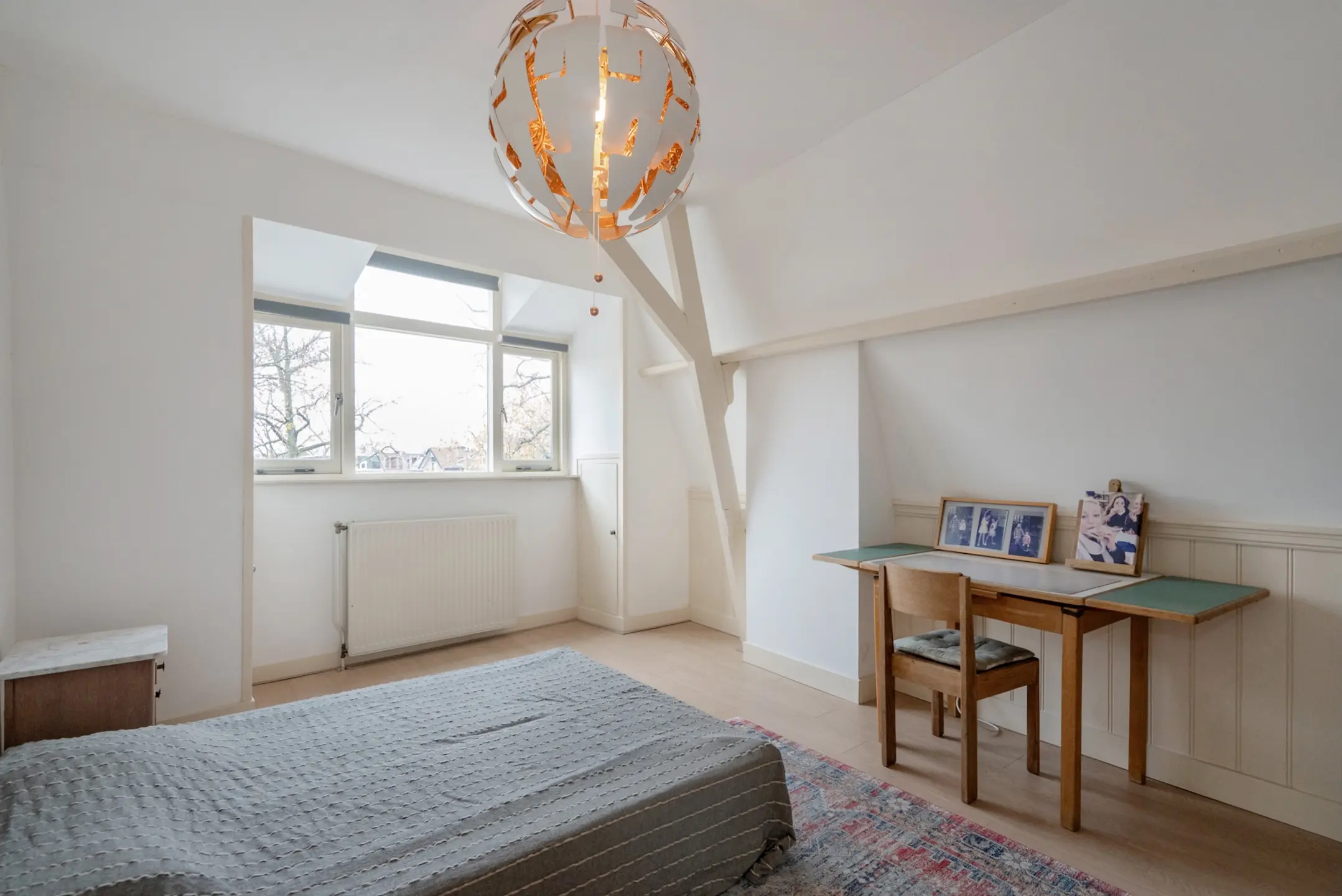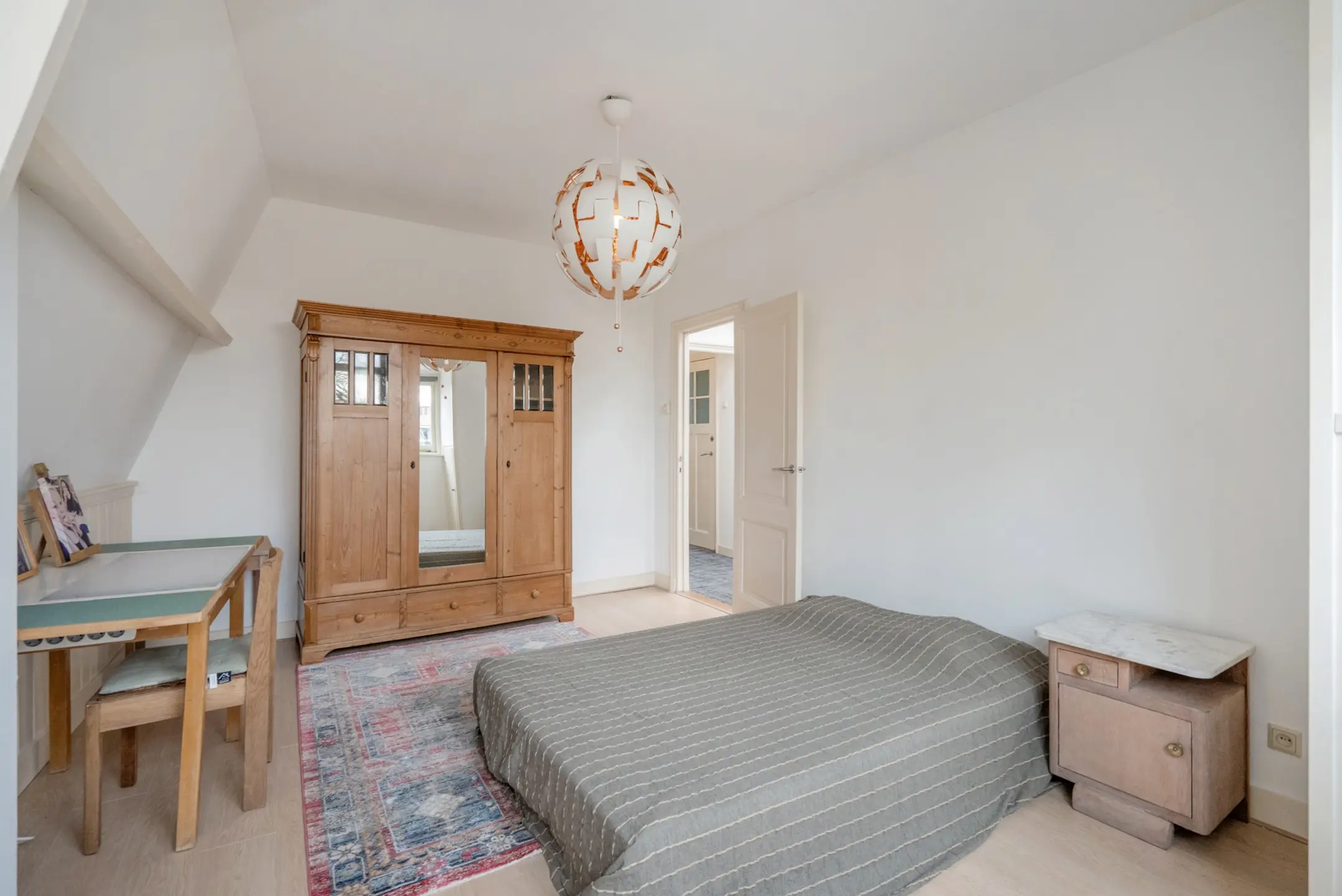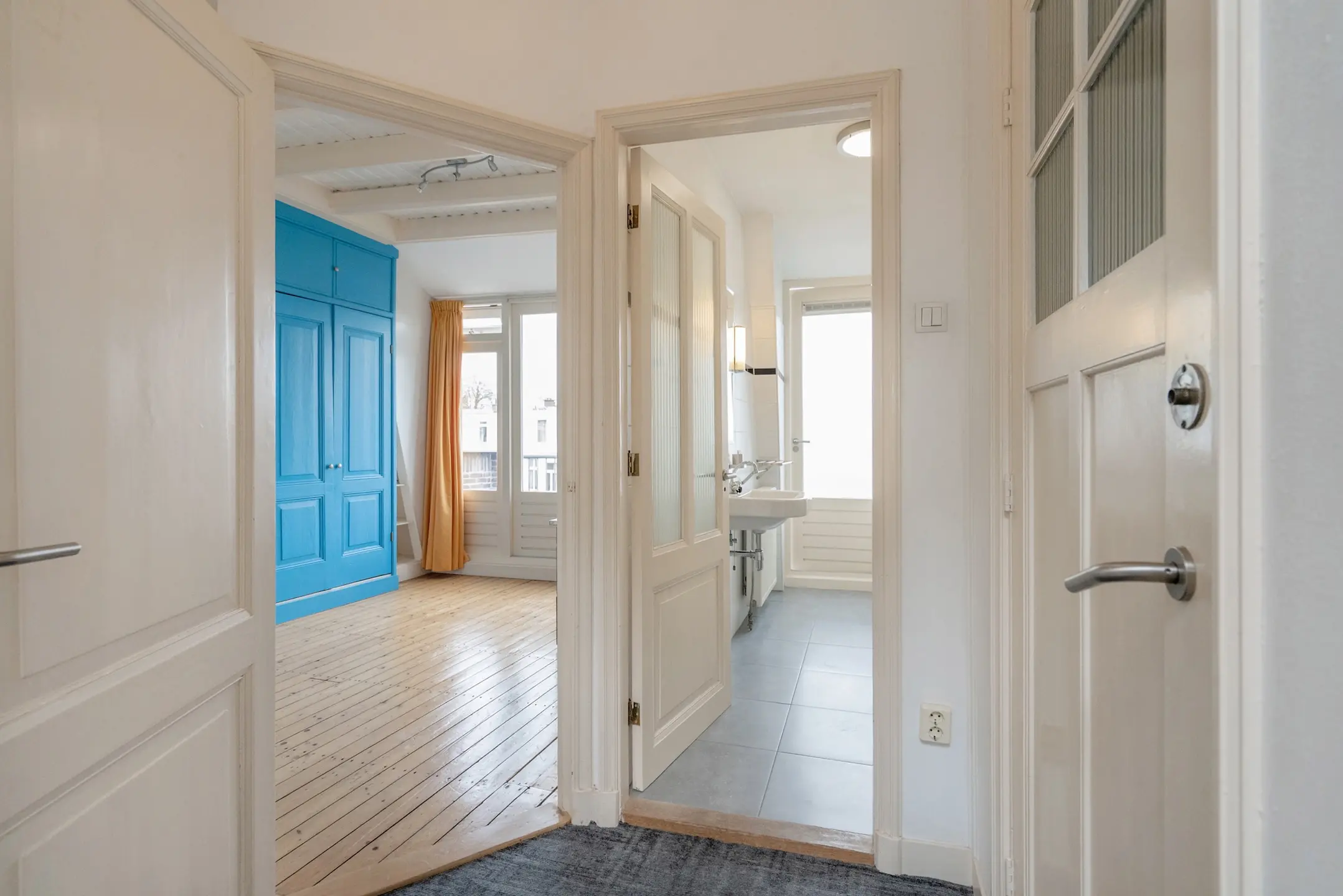 Tweede verdieping: overloop met een groot dakraam waardoor veel natuurlijk licht in het trappenhuis, gezellige slaapkamer aan de voorzijde met uitzicht op de straat, voorzijkamer, grote achterkamer met dubbele deuren naar het balkon over de volledige breedte van de woning. Tweede badkamer met een doucheruimte, wastafel, opstelplaats van de wasmachine en wasdroger en een deur naar het balkon. Separaat 3e toilet. Tussengelegen (berg)kamer met de opstelplaats van de cv-combi ketel (Nefit HR 107, cw 6), de elektrische boiler en de omvormer van de zonnepanelen.