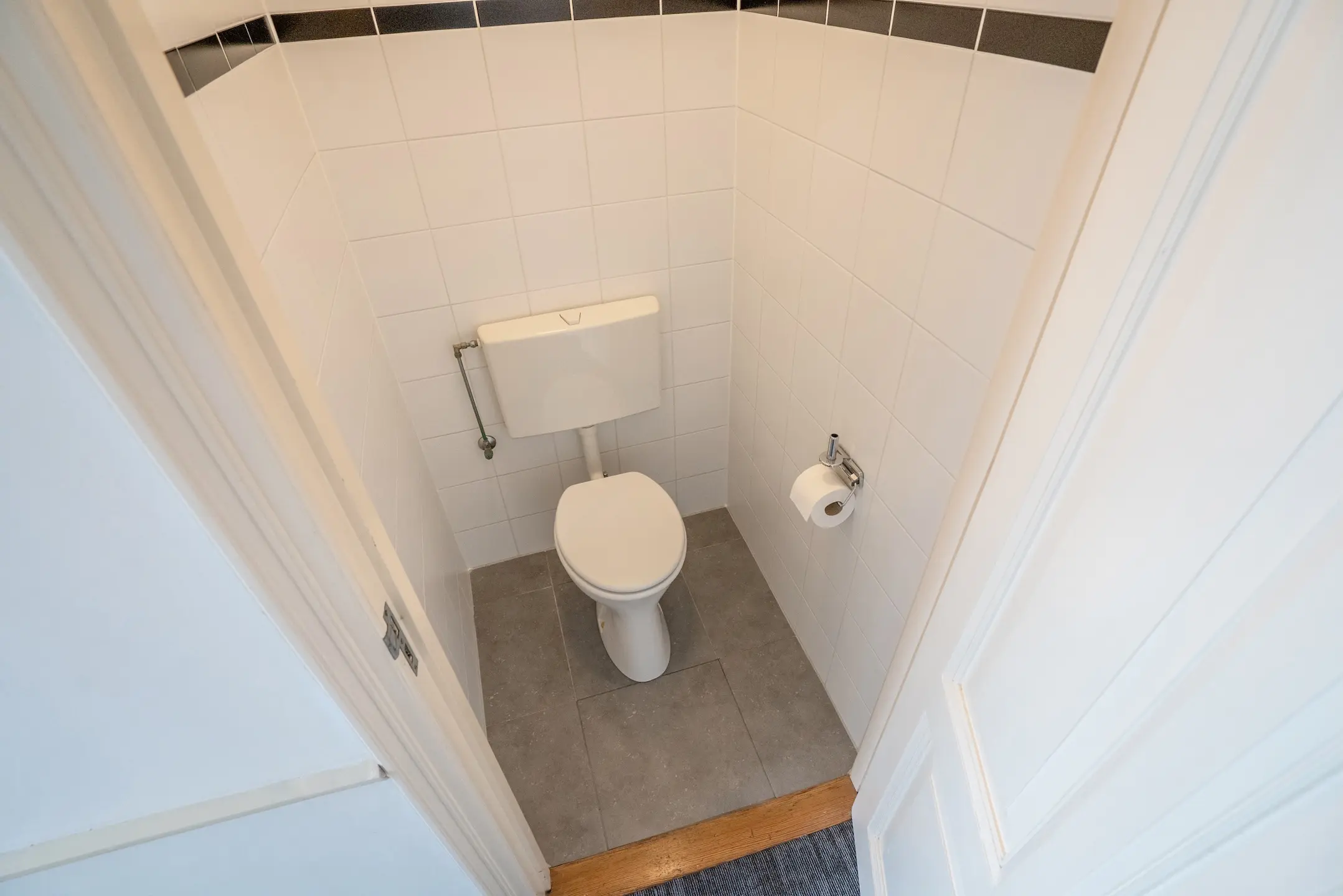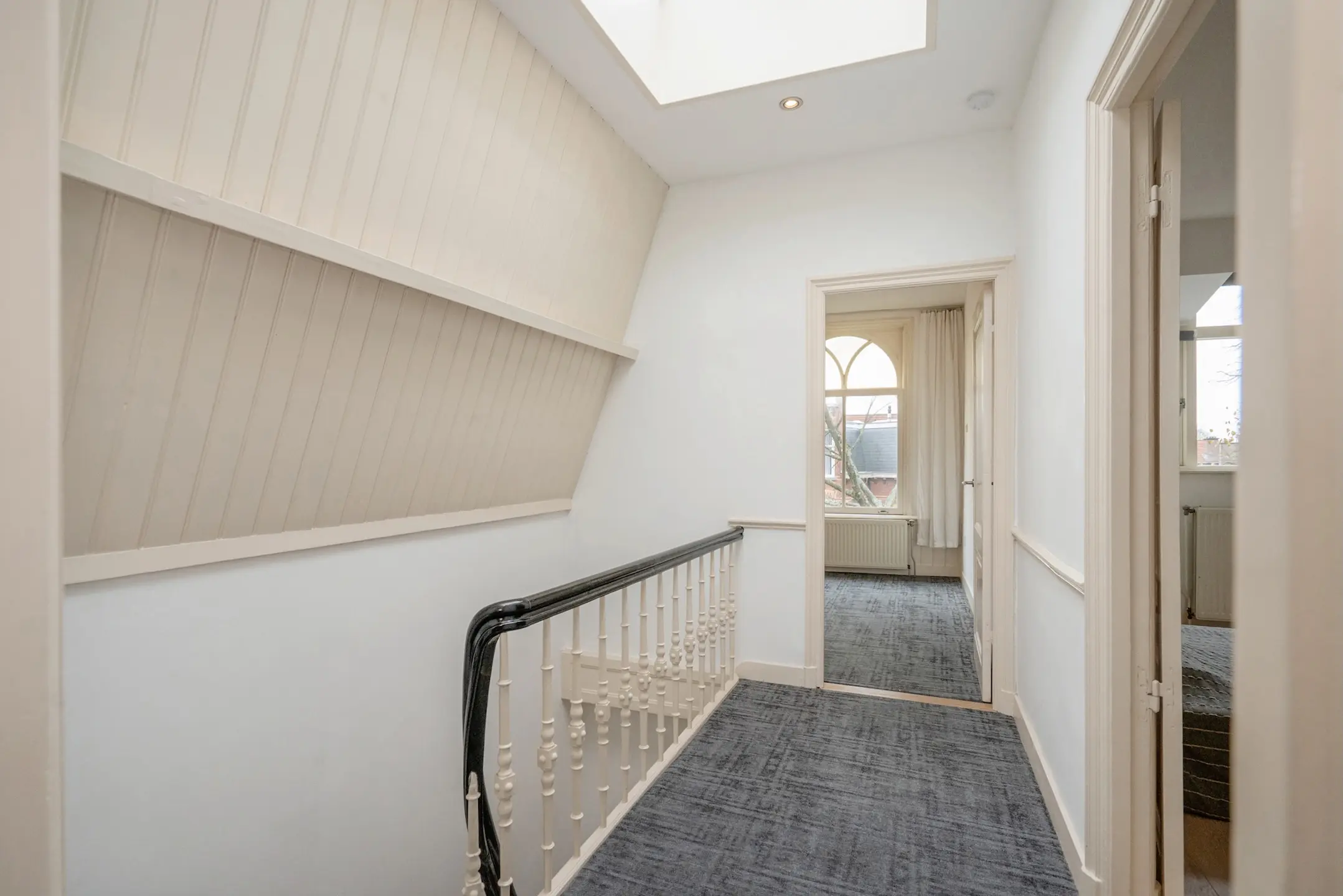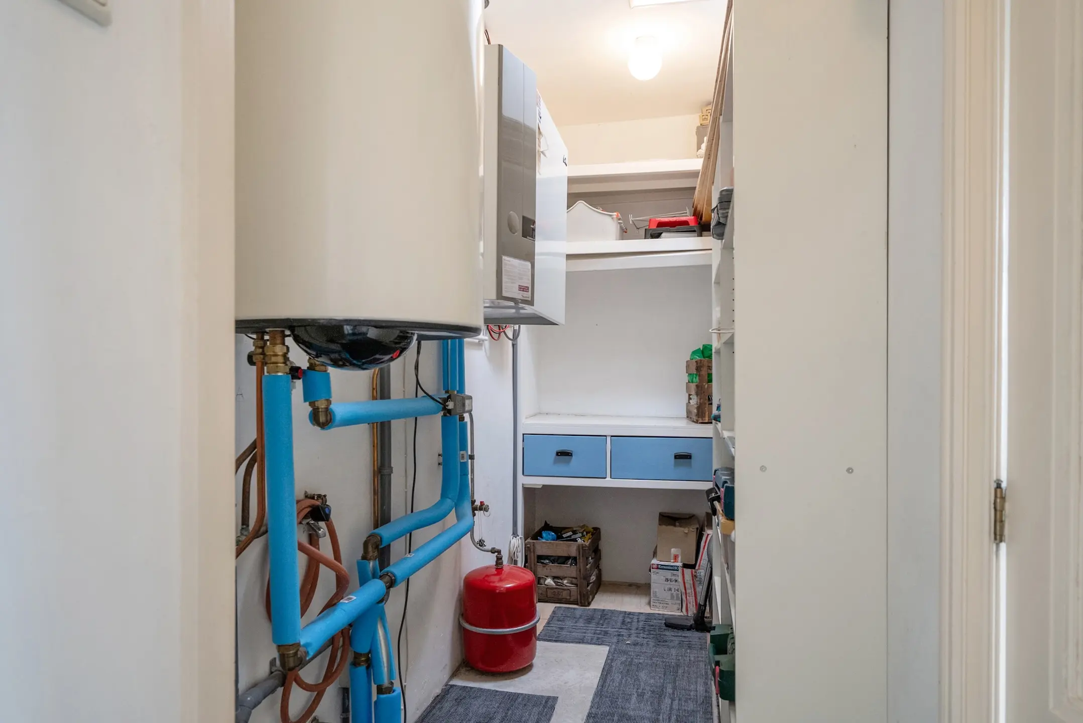 Second floor: Landing with a large skylight allowing plenty of natural light to enter the staircase area, cozy bedroom at the front with a view of the street, side room, large rear bedroom with double doors opening onto a full-width balcony. Second bathroom with a shower, washbasin, space for a washing machine and dryer, and a door leading to the balcony. Separate third toilet. A separate storage room with space for the central heating system (Nefit HR 107, CW 6), electric boiler, and the inverter for the solar panels.