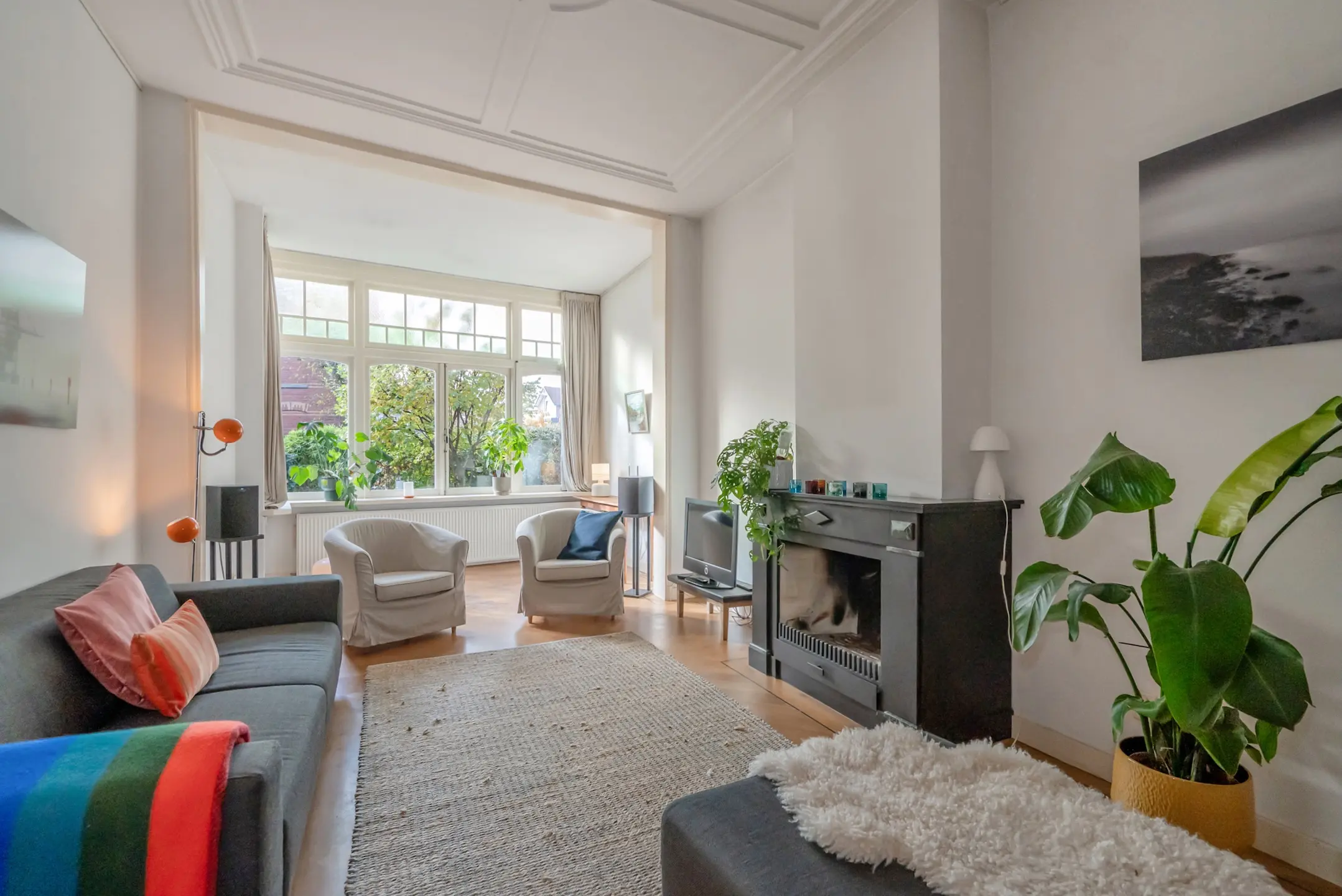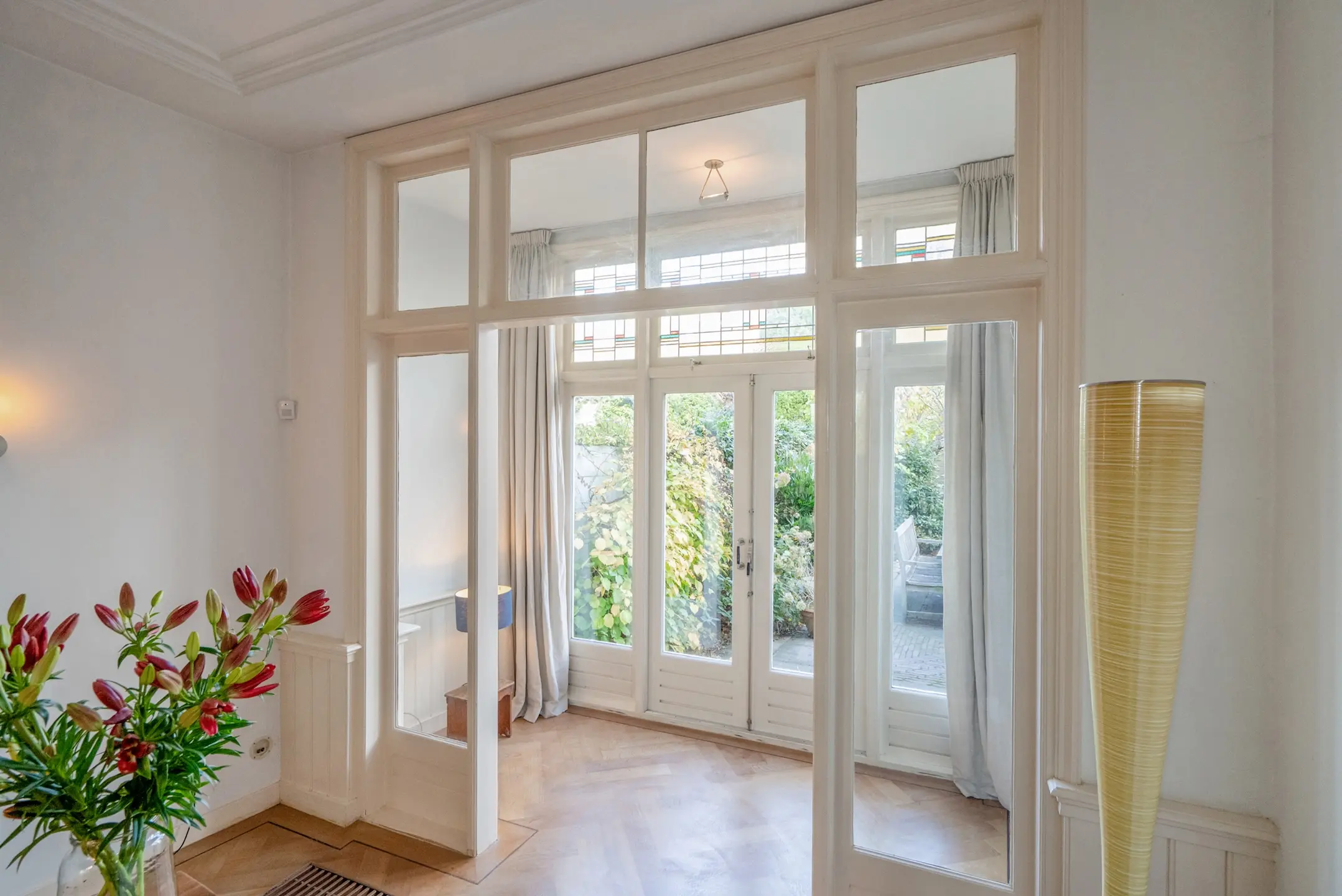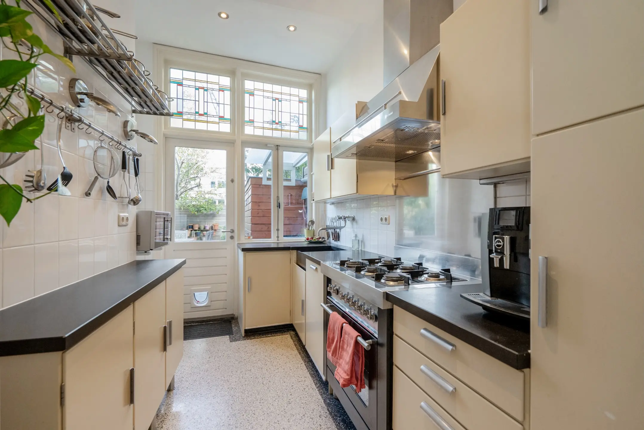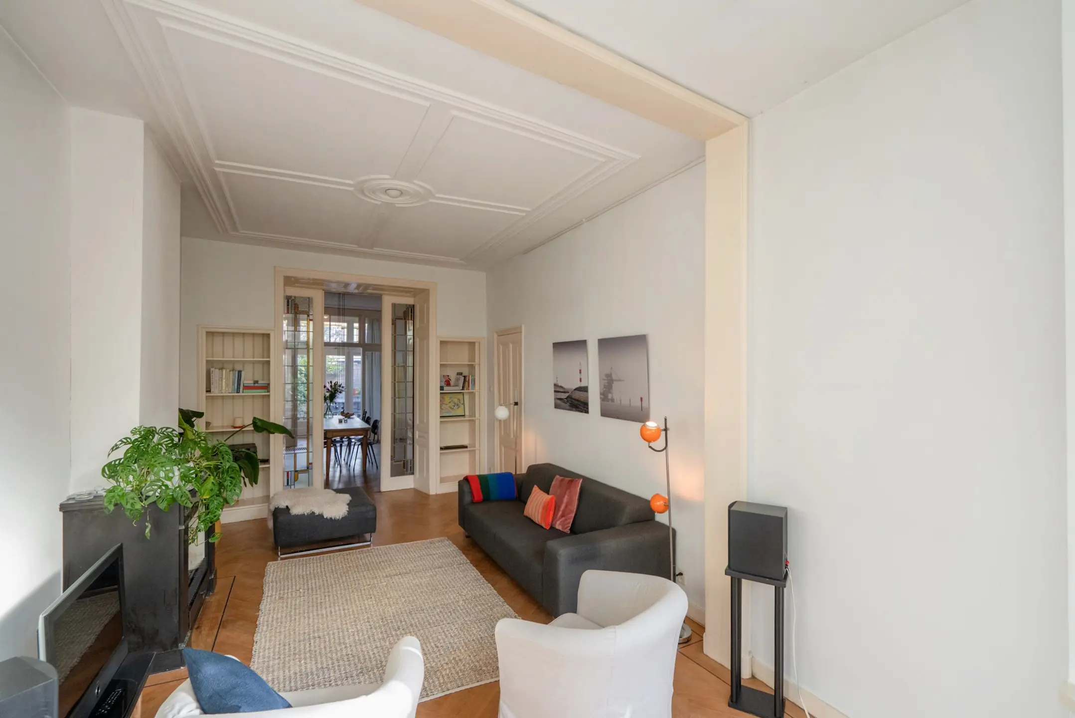 Ground floor: Front garden, beautifully designed facade with a rounded entrance, vestibule with restored terrazzo floor and new stained-glass windows, hallway with storage space, white-tiled toilet with wall-mounted toilet and a washbasin, cozy en-suite living room comprising a front and rear room as well as a conservatory. A beautiful sliding partition with built-in cabinets, natural stone fireplaces (one converted to an open fireplace), and an oak herringbone parquet floor with a decorative border are distinctive features. The ceiling height is an impressive 3.17 meters, creating a spacious ambiance. Double doors open to the well-maintained and quiet rear garden, approximately 14 meters deep, facing northeast. Wooden garden shed. The modern kitchen (Bruynzeel) has a warm, nostalgic feel with a terrazzo floor. The kitchen is arranged in a corner layout with a black composite countertop, integrated dishwasher, refrigerator, an extra-wide stove with 6 burners, a convection oven, and a stainless-steel extractor hood. On the other side, there is a buffet cabinet with a black composite countertop.