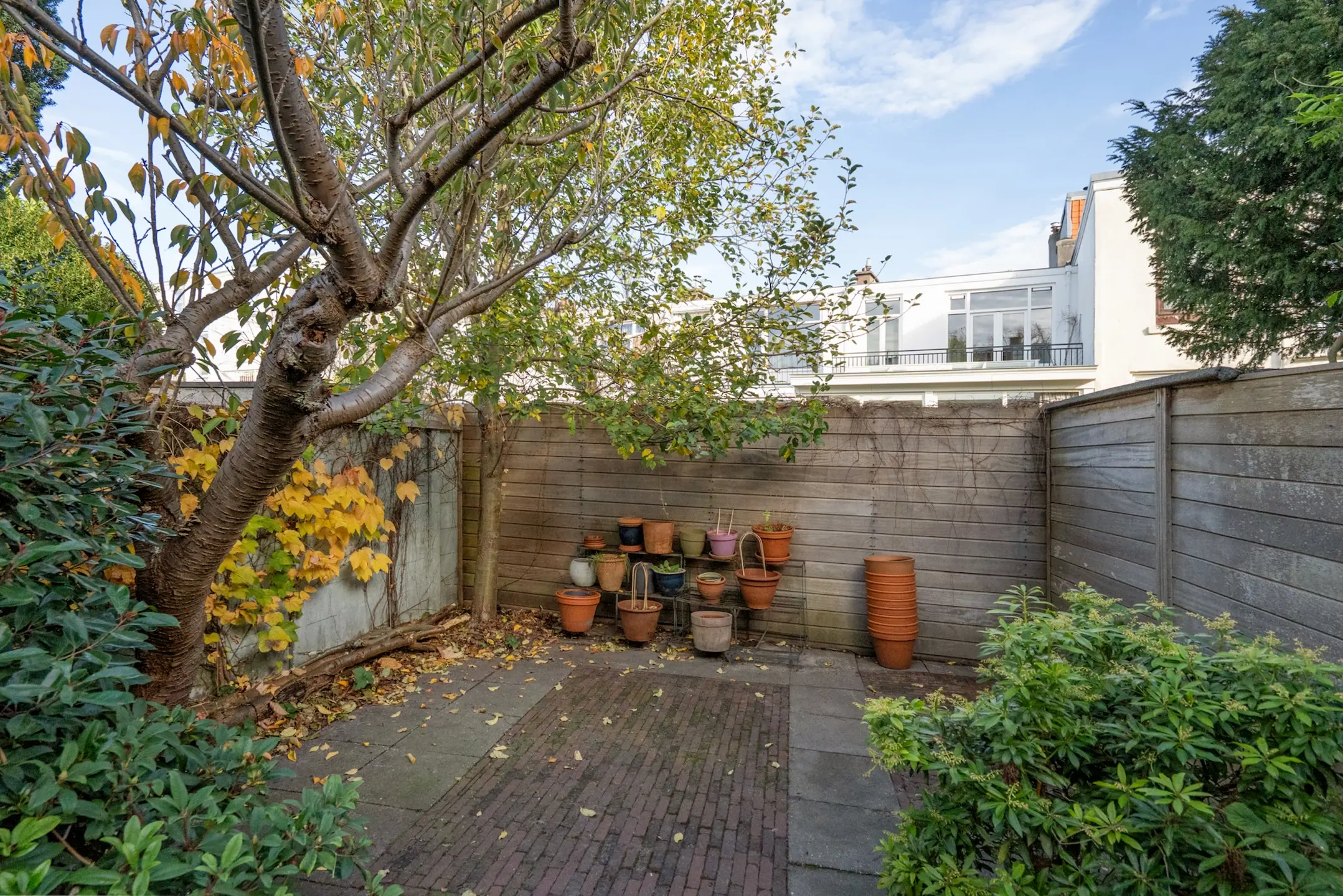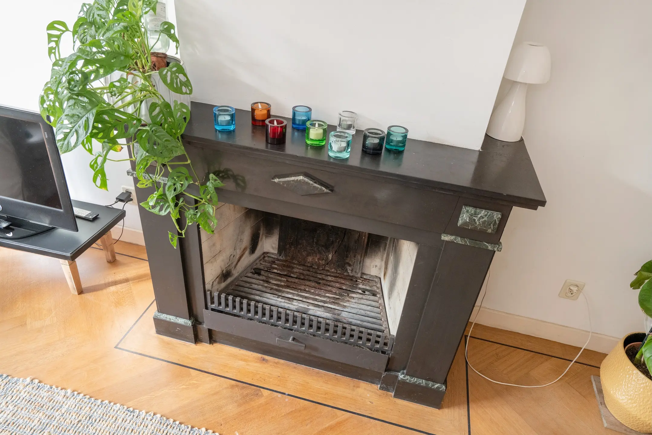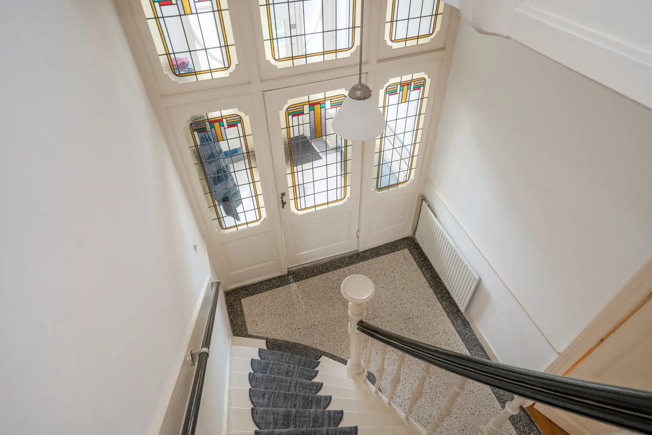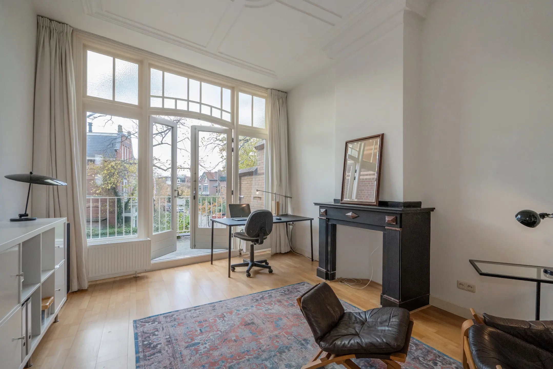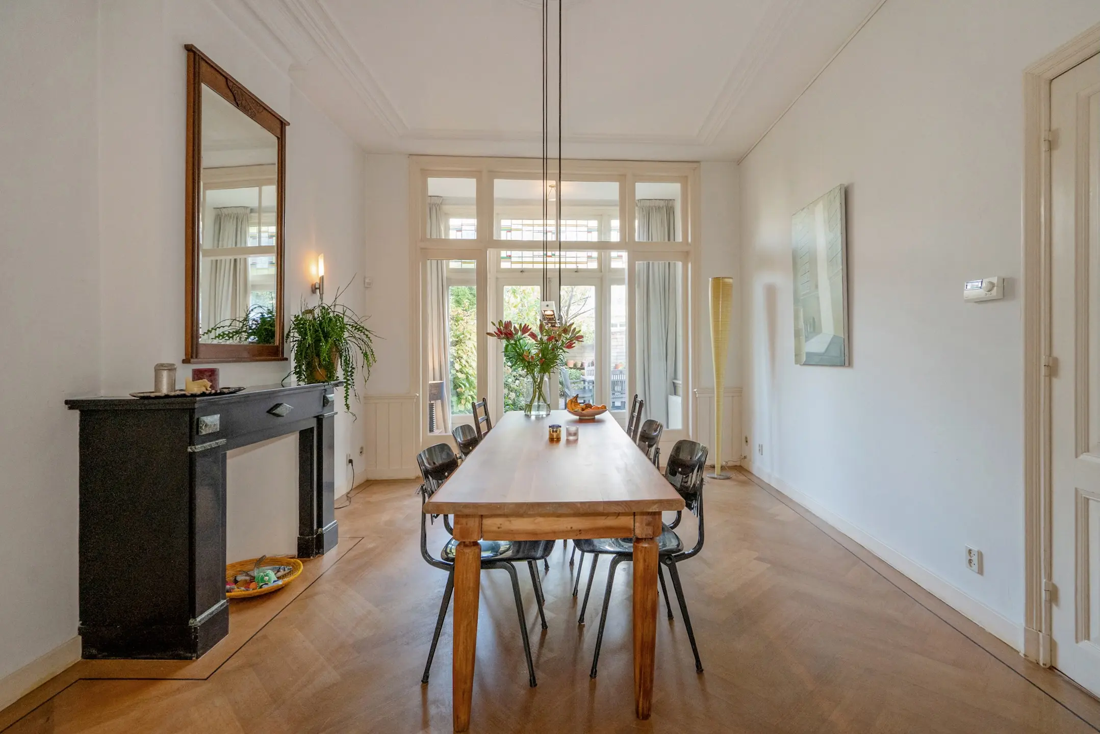 Ground floor: Front garden, beautifully designed facade with a rounded entrance, vestibule with restored terrazzo floor and new stained-glass windows, hallway with storage space, white-tiled toilet with wall-mounted toilet and a washbasin, cozy en-suite living room comprising a front and rear room as well as a conservatory. A beautiful sliding partition with built-in cabinets, natural stone fireplaces (one converted to an open fireplace), and an oak herringbone parquet floor with a decorative border are distinctive features. The ceiling height is an impressive 3.17 meters, creating a spacious ambiance. Double doors open to the well-maintained and quiet rear garden, approximately 14 meters deep, facing northeast. Wooden garden shed. The modern kitchen (Bruynzeel) has a warm, nostalgic feel with a terrazzo floor. The kitchen is arranged in a corner layout with a black composite countertop, integrated dishwasher, refrigerator, an extra-wide stove with 6 burners, a convection oven, and a stainless-steel extractor hood. On the other side, there is a buffet cabinet with a black composite countertop.