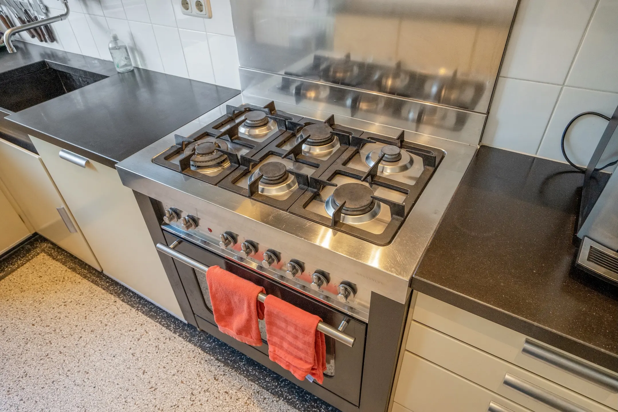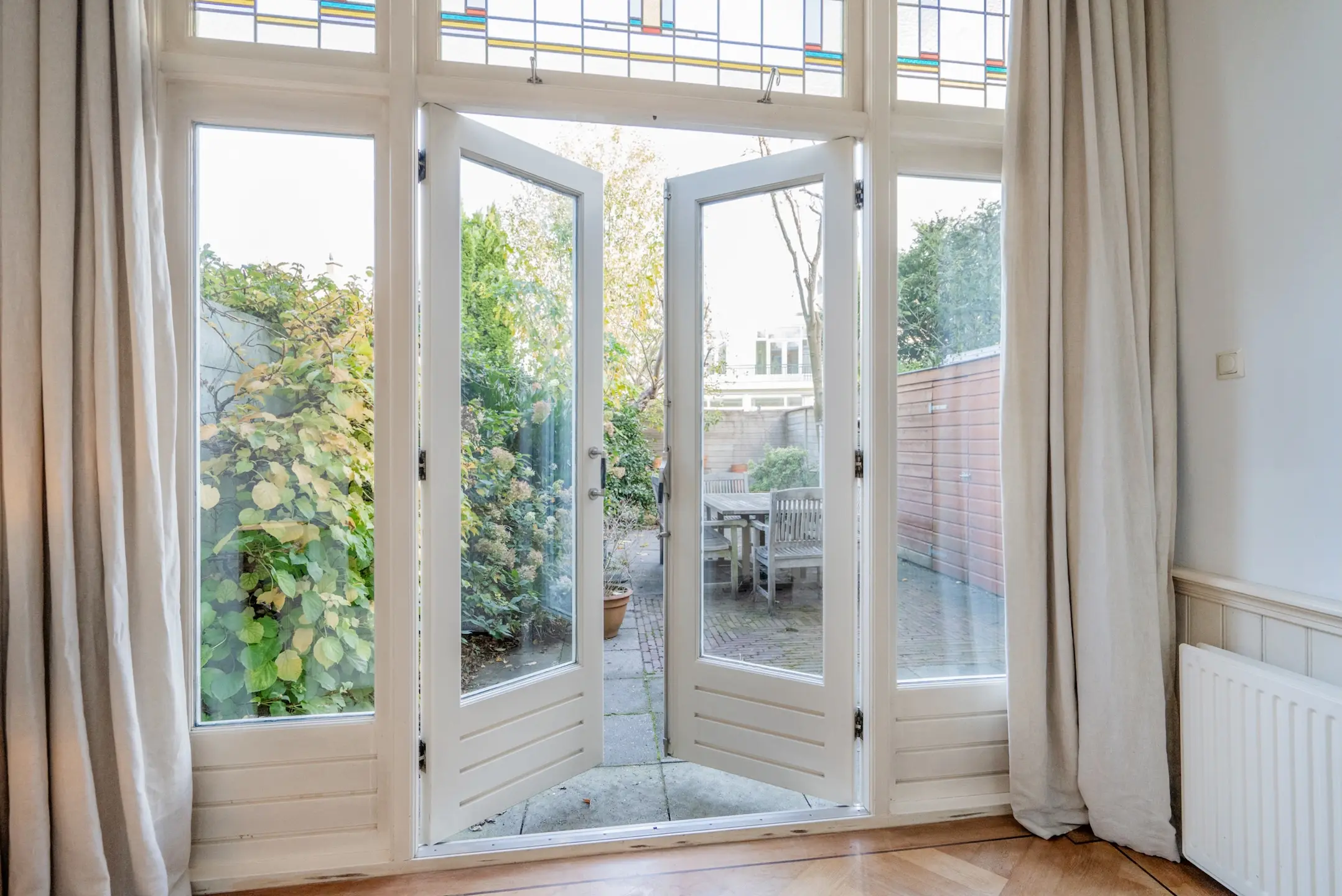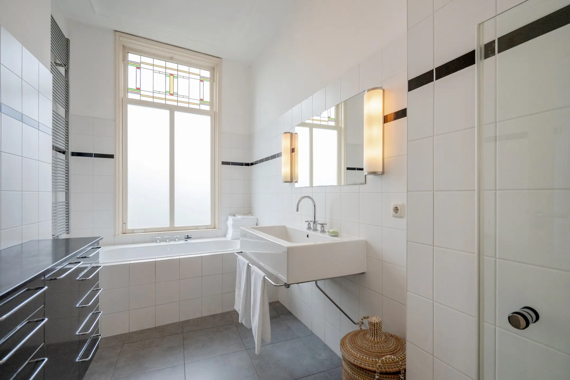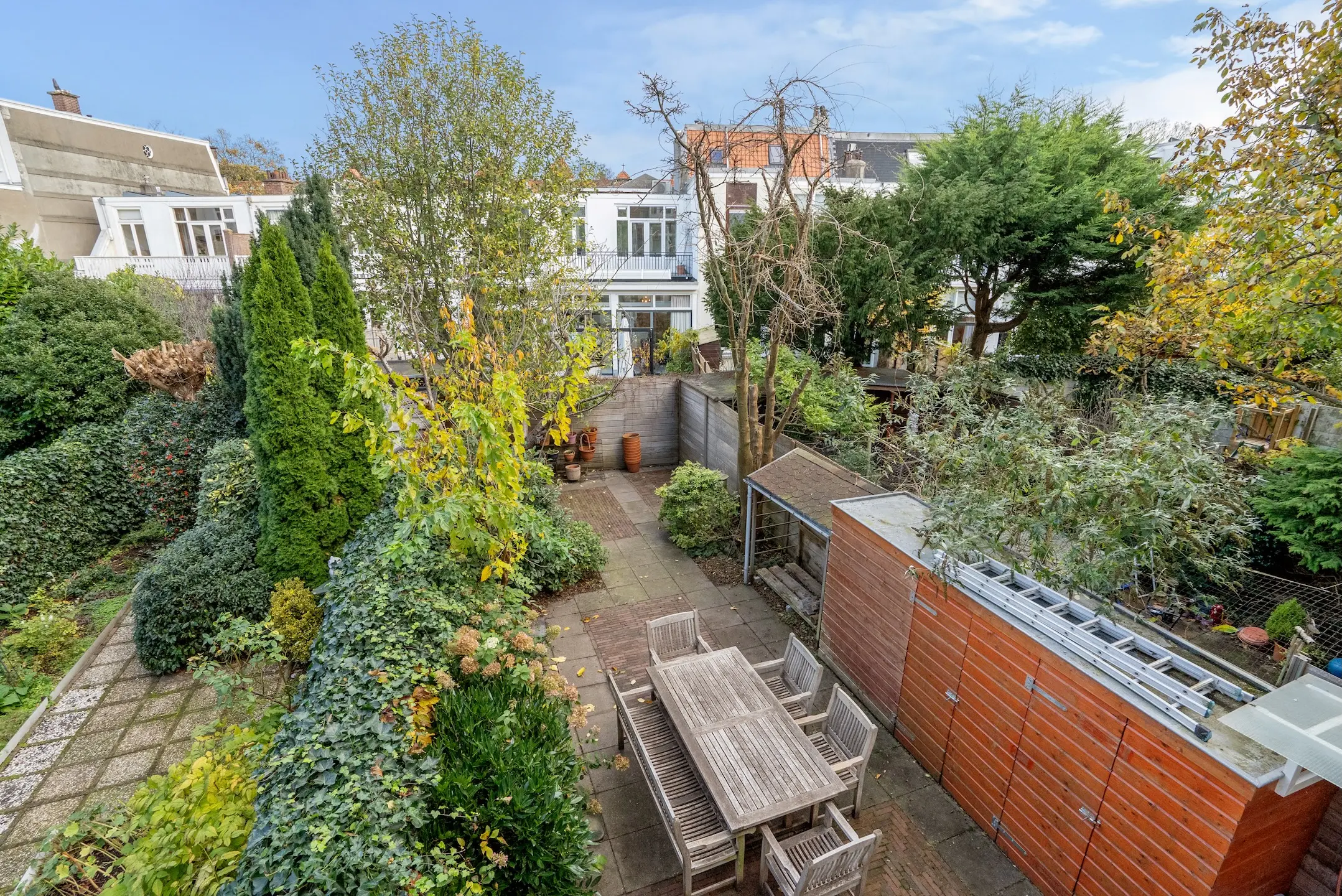Ground floor: Front garden, beautifully designed facade with a rounded entrance, vestibule with restored terrazzo floor and new stained-glass windows, hallway with storage space, white-tiled toilet with wall-mounted toilet and a washbasin, cozy en-suite living room comprising a front and rear room as well as a conservatory. A beautiful sliding partition with built-in cabinets, natural stone fireplaces (one converted to an open fireplace), and an oak herringbone parquet floor with a decorative border are distinctive features. The ceiling height is an impressive 3.17 meters, creating a spacious ambiance. Double doors open to the well-maintained and quiet rear garden, approximately 14 meters deep, facing northeast. Wooden garden shed. The modern kitchen (Bruynzeel) has a warm, nostalgic feel with a terrazzo floor. The kitchen is arranged in a corner layout with a black composite countertop, integrated dishwasher, refrigerator, an extra-wide stove with 6 burners, a convection oven, and a stainless-steel extractor hood. On the other side, there is a buffet cabinet with a black composite countertop.