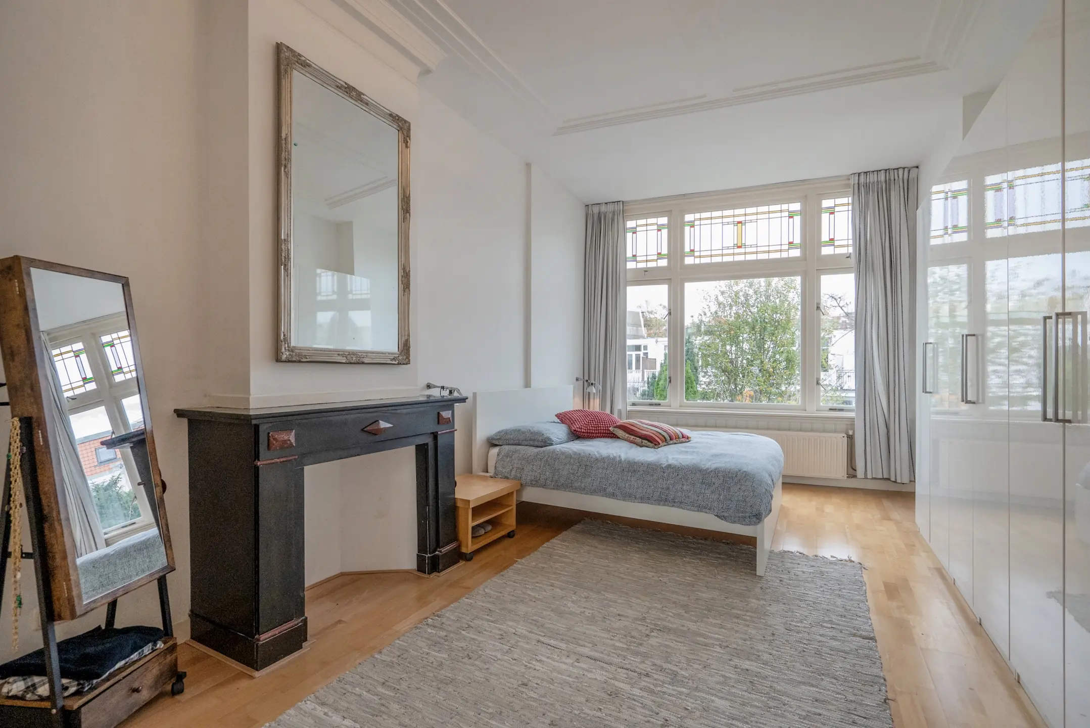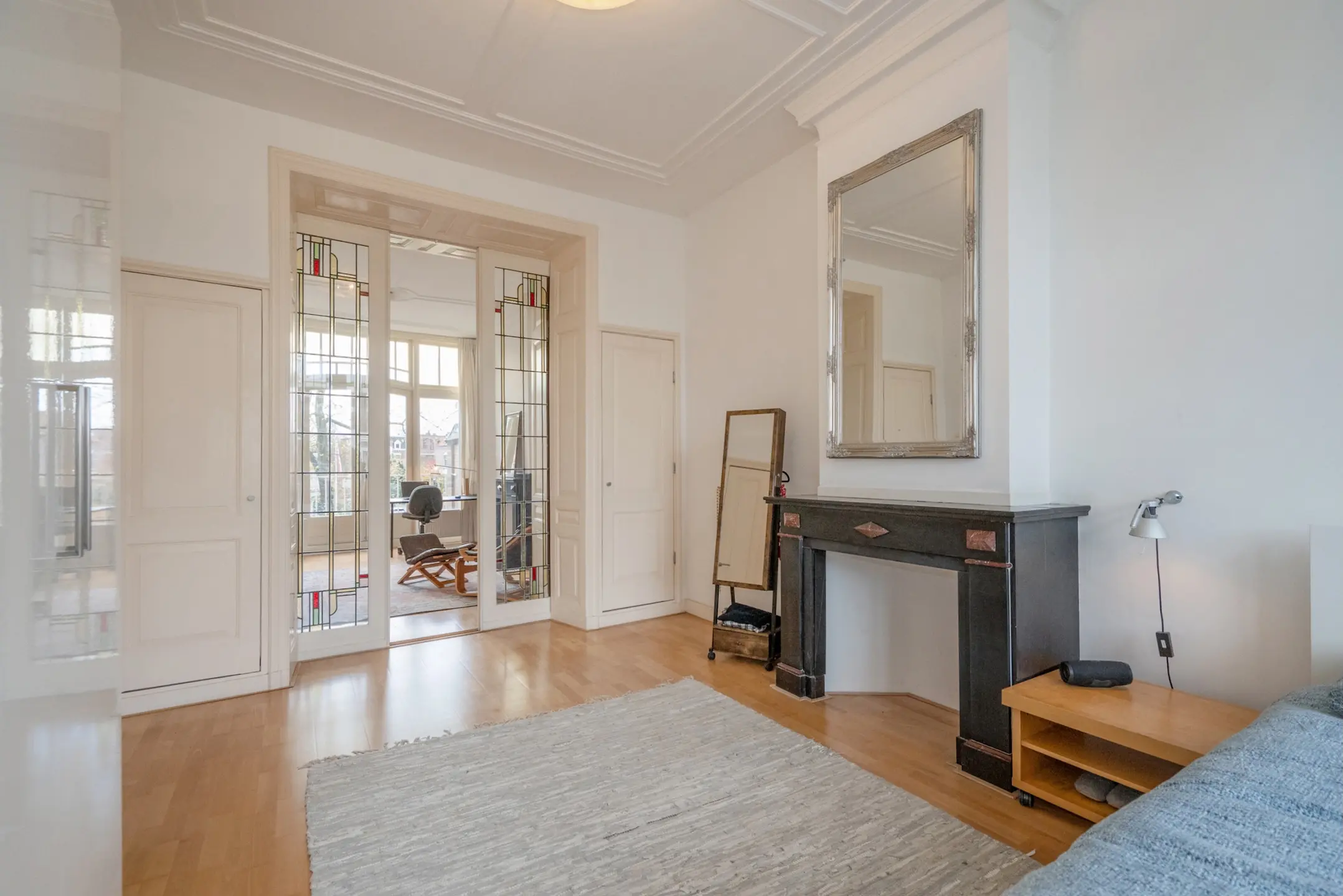 Eerste verdieping: overloop, kamer en suite met een vorstelijke maatvoering, schuifseparatie, vaste kasten en dubbele deuren naar het balkon aan de voorzijde met een vrije doorkijk op de tegenover gelegen straat, 2 natuurstenen schouwen en een plafondhoogte van meer dan 3.10 meter! De