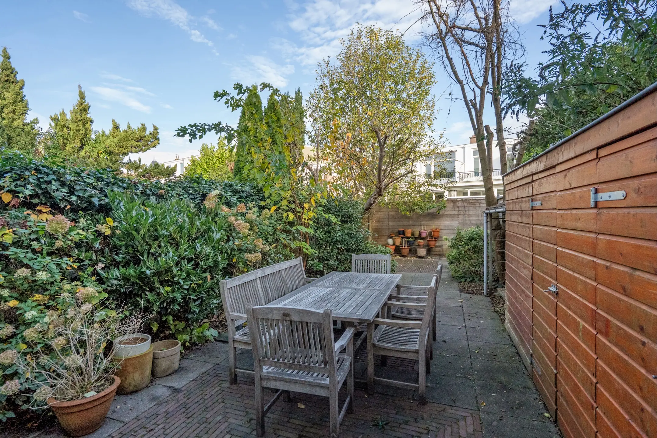 Begane grond: voortuin, prachtig ontworpen voorgevel met ronde entreepartij, vestibule met gerestaureerde granito vloer en vernieuwde glas-in-lood ramen, hal met bergruimte, wit betegeld toilet voorzien van wandcloset en een fontein, sfeervolle kamer en suite bestaande uit een voor- en een achterkamer alsmede een serre, kenmerkend is de mooie schuifseparatie met vaste kasten, de natuurstenen schouwen (waarvan één omgebouwd tot open haard) en de visgraat eiken parketvloer met een sierbies. Plafondhoogte maar liefst 3.17 meter waardoor het geheel zeer ruimtelijk is. Dubbele deuren naar de goed aangelegde en rustig gelegen achtertuin van ongeveer 14.00 meter diep, gesitueerd op het noordoosten. Houten tuinberging. De moderne keuken (Bruynzeel) heeft een warme, nostalgische uitstraling met granito vloer. De keukeninrichting is in een hoekopstelling met een zwart composiet werkblad, geïntegreerde vaatwasser, koelkast, extra breed fornuis met 6 branders, een heteluchtoven en een rvs afzuigkap. Aan de andere zijde een buffetkast met een zwart composiet werkblad.