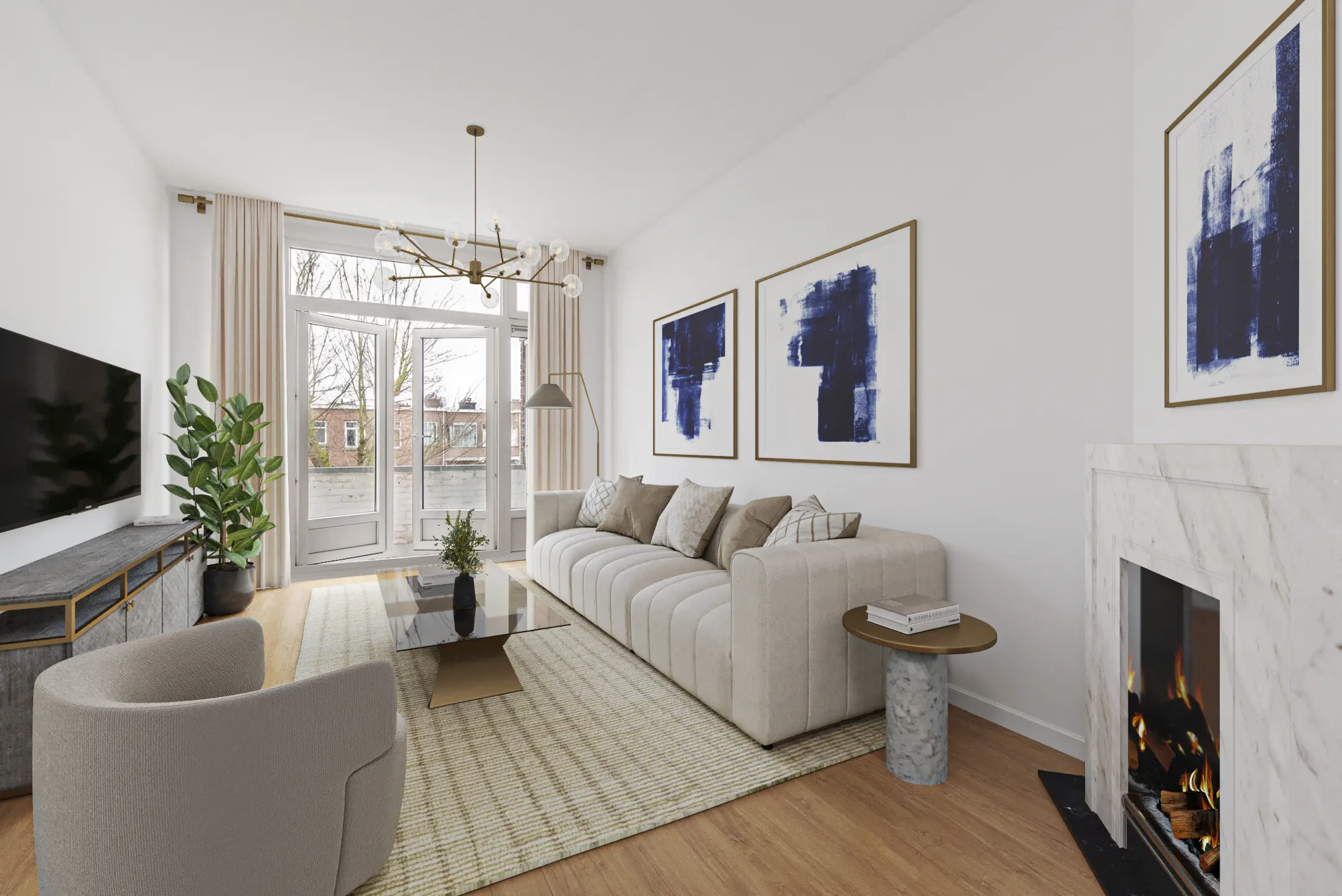 De ruime doorzon woonkamer biedt veel lichtinval door de grote raampartijen aan beide zijden. Tussen de voor- en achterzijde bevindt zich een schuifseparatie met opbergruimte, die de ruimte zowel functioneel als sfeervol maakt.