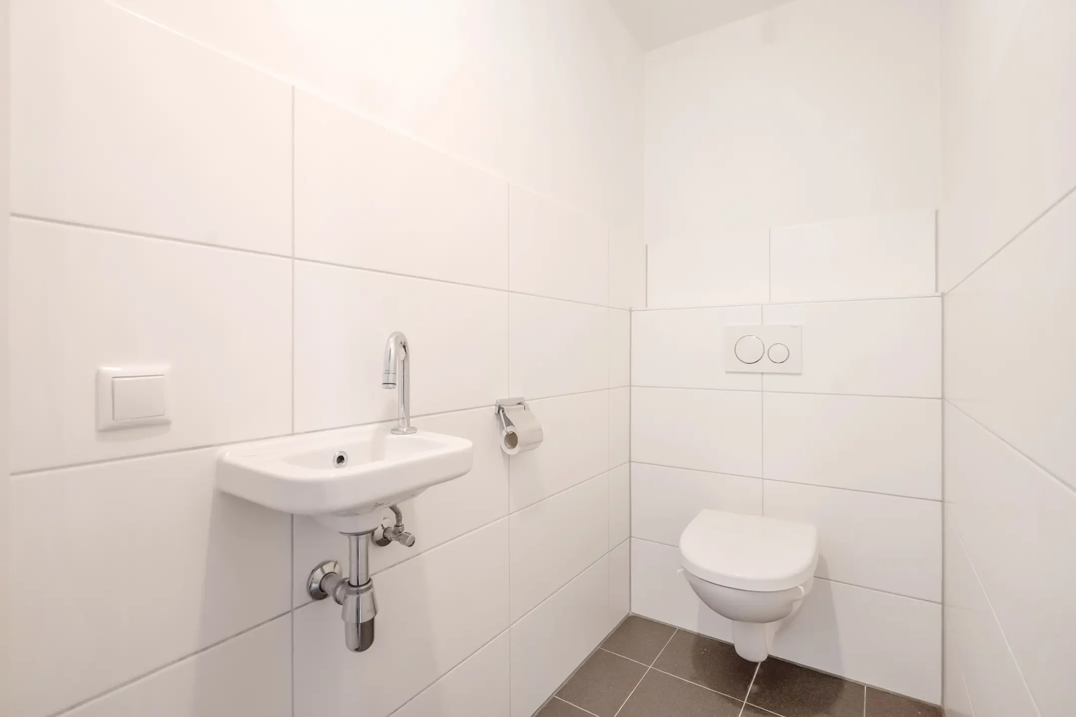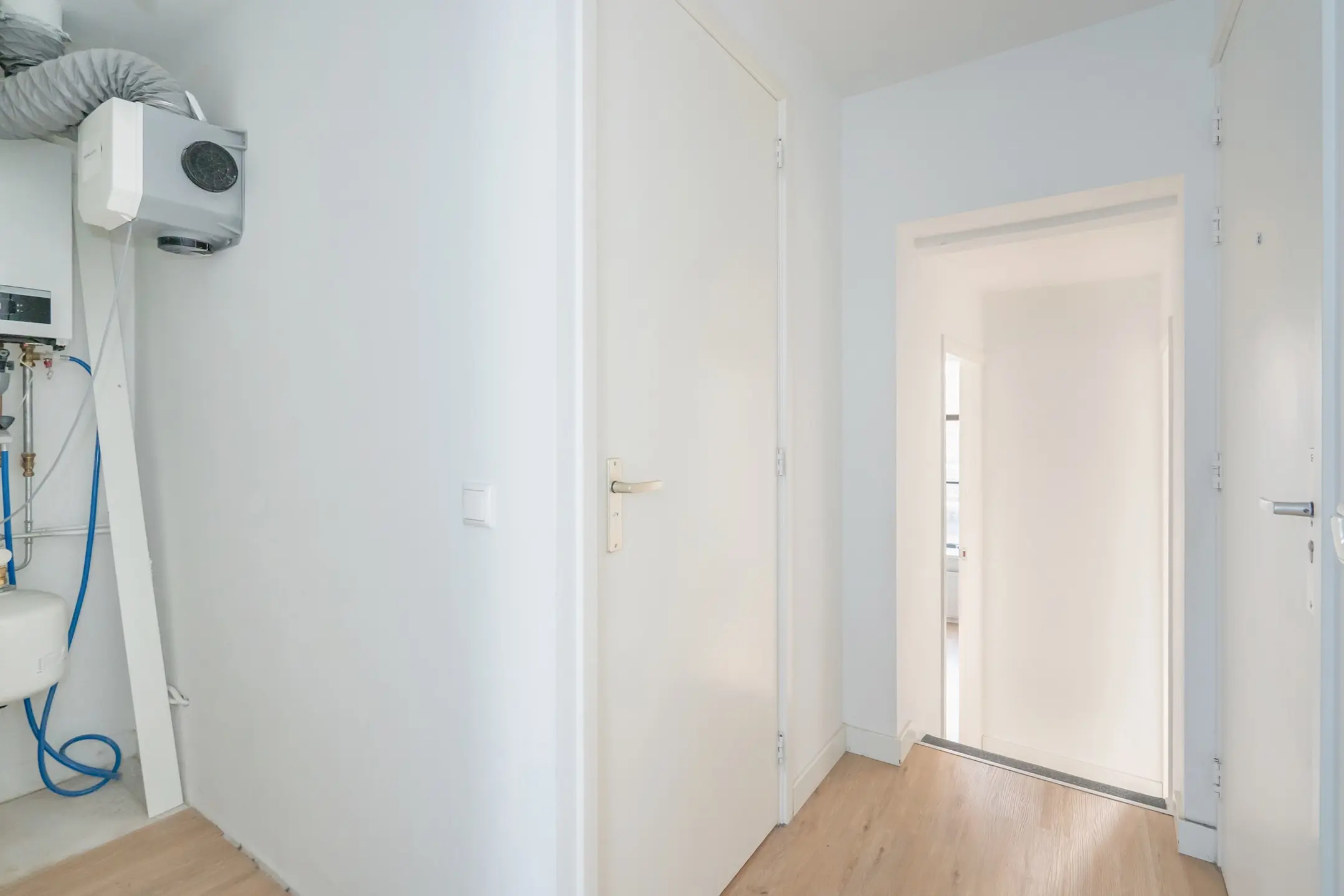 Gesloten portiek trapopgang naar de eerste verdieping. Entree van het appartement, hal met meterkast, opstelplaats voor de wasmachine en HR cv-ketel (Nefit, 2010). Modern, vrijhangend toilet met fonteintje.