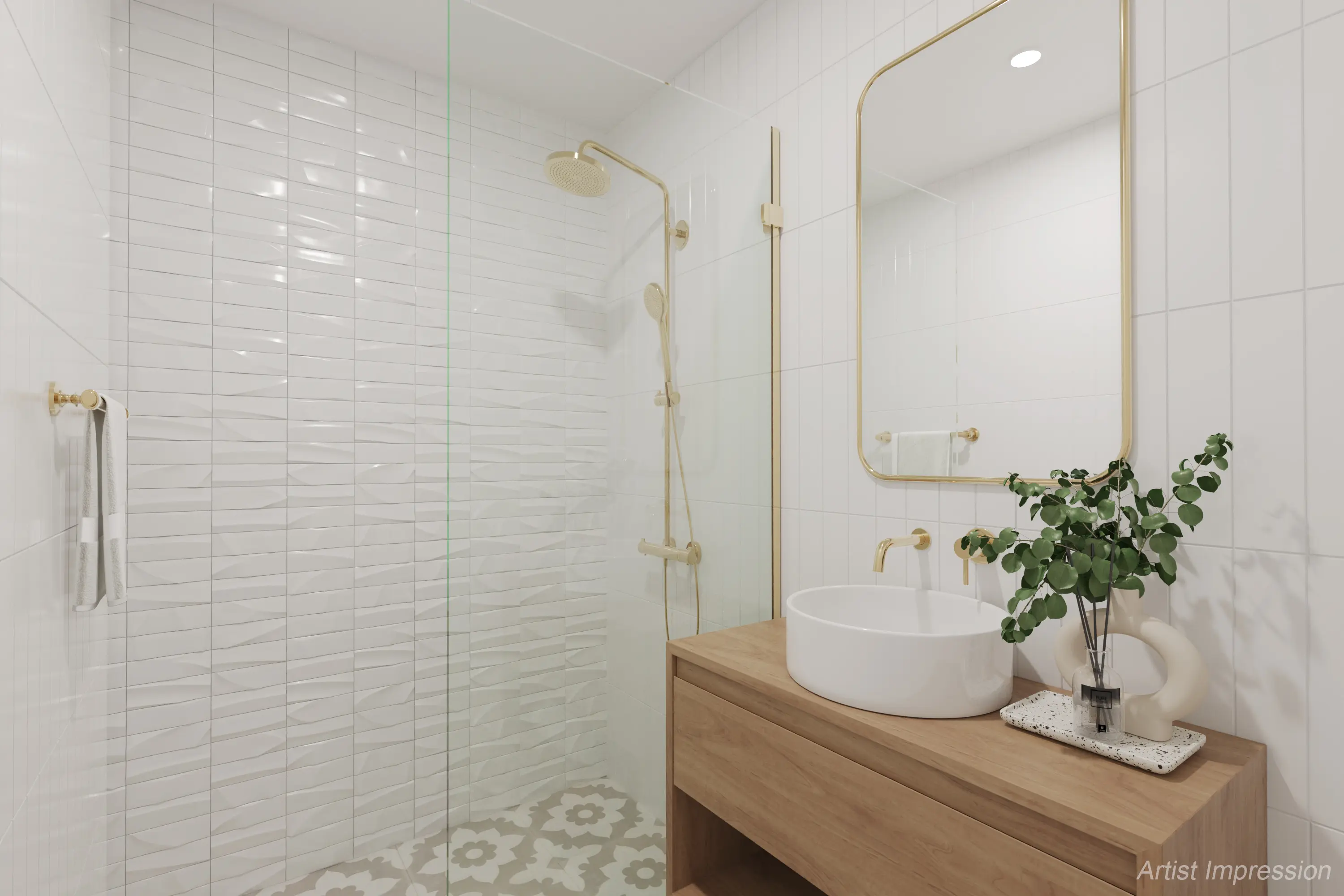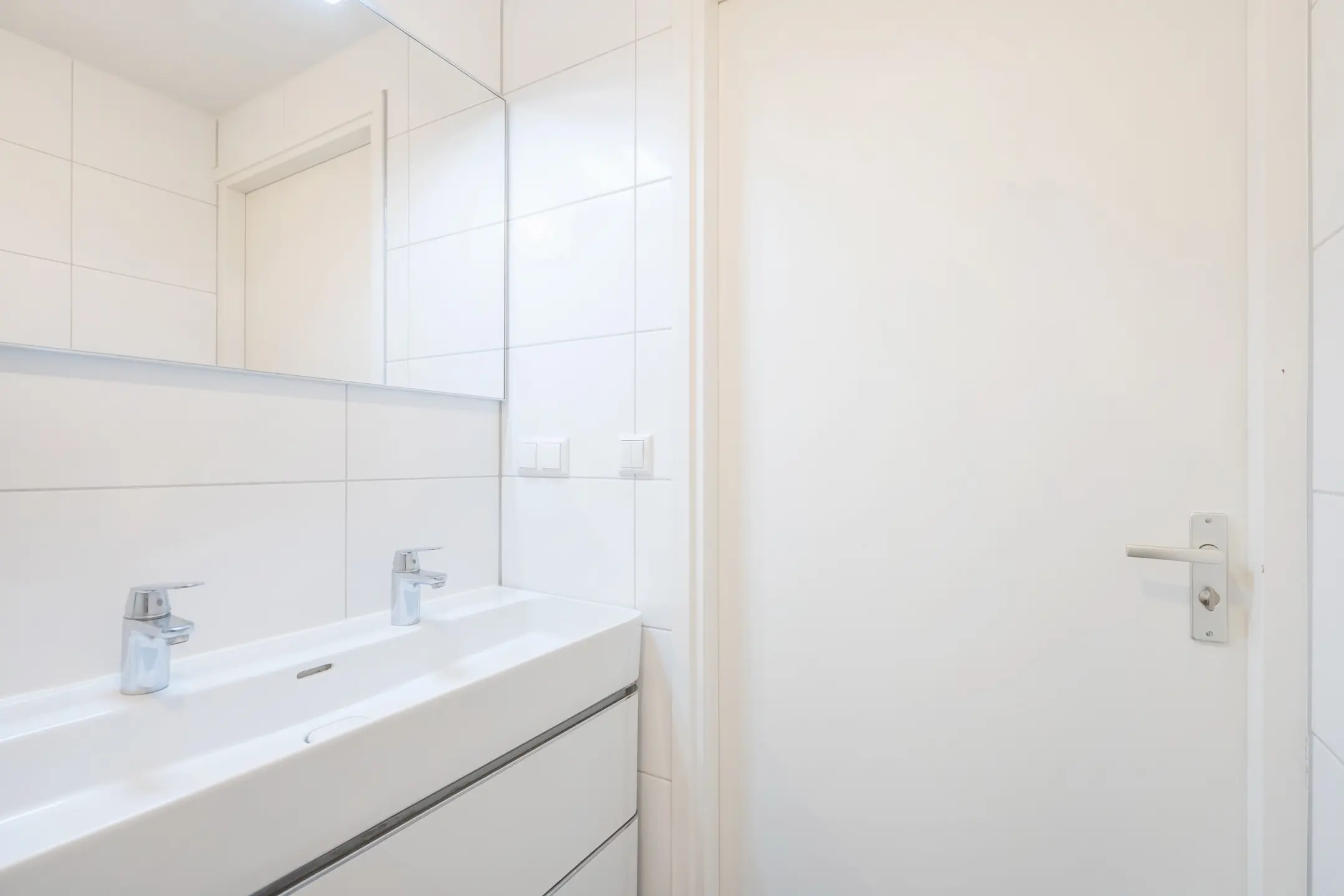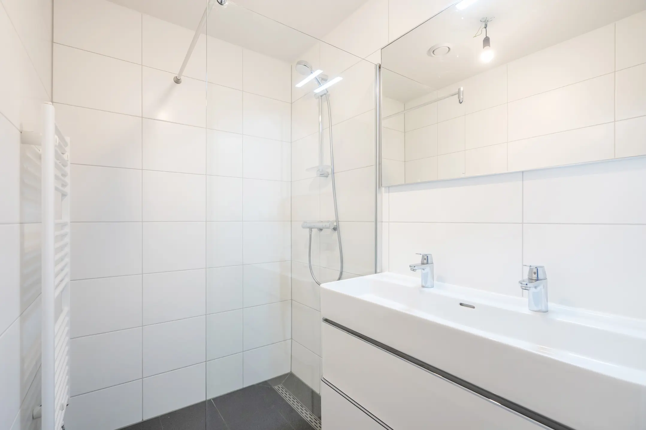 Aan de achterzijde van het appartement bevinden zich twee goed bemeten slaapkamers. De moderne badkamer is uitgevoerd met een inloopdouche, wastafelmeubel en designradiator.