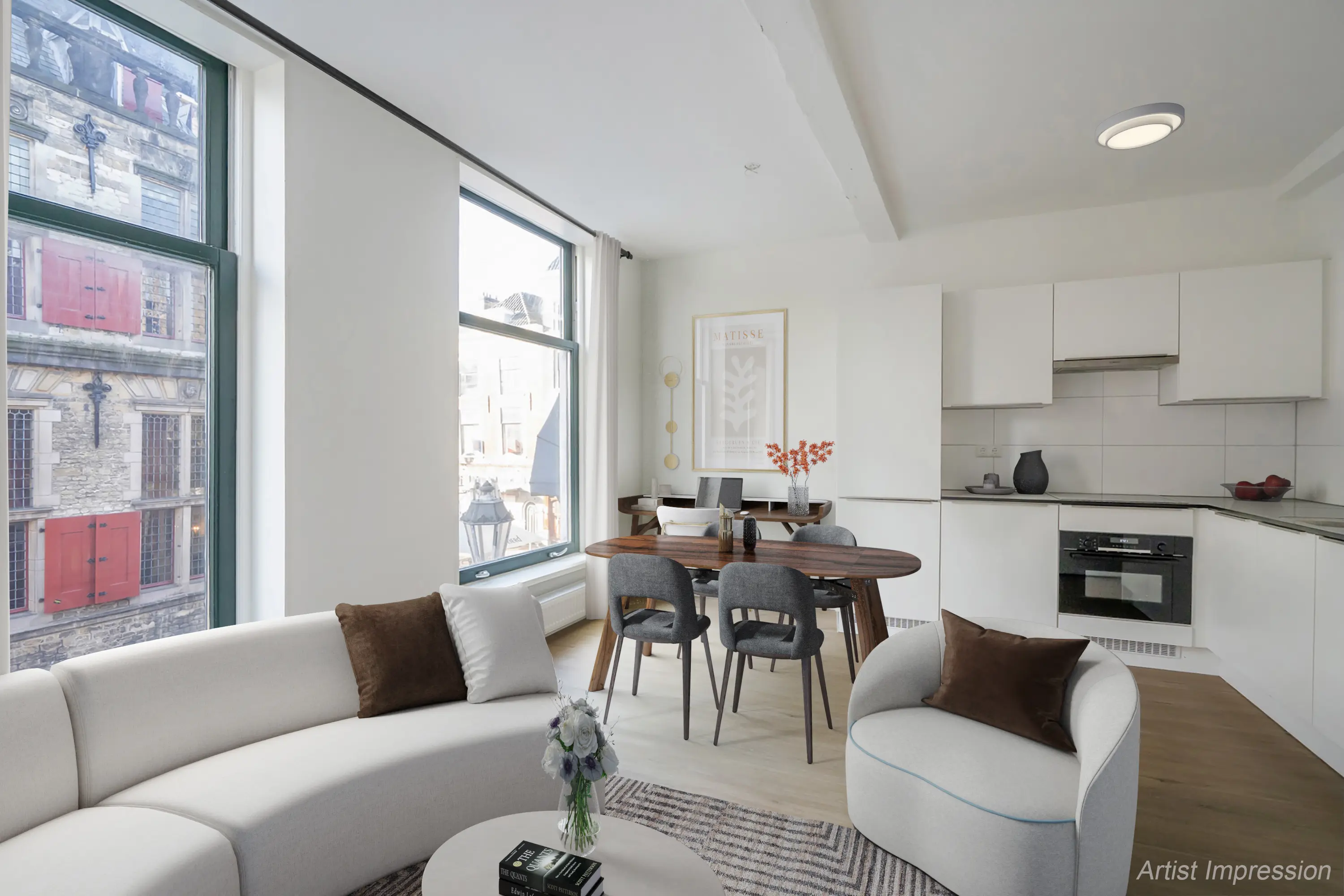 De ruime woon-/eetkamer aan de voorzijde kenmerkt zich door de grote ramen, die zorgen voor een bijzonder prettige lichtinval en een schitterend uitzicht over de Markt. De luxe open keuken in L-opstelling is voorzien van diverse inbouwapparatuur.