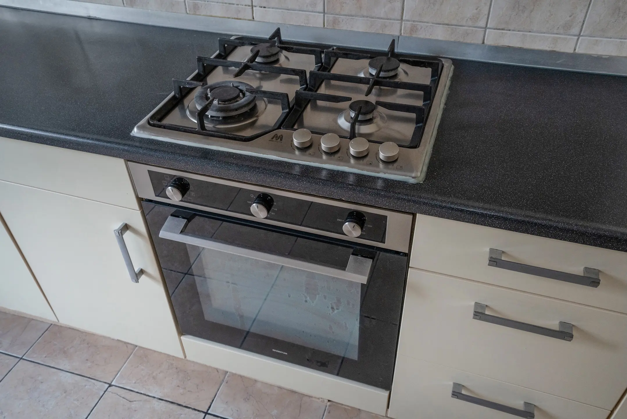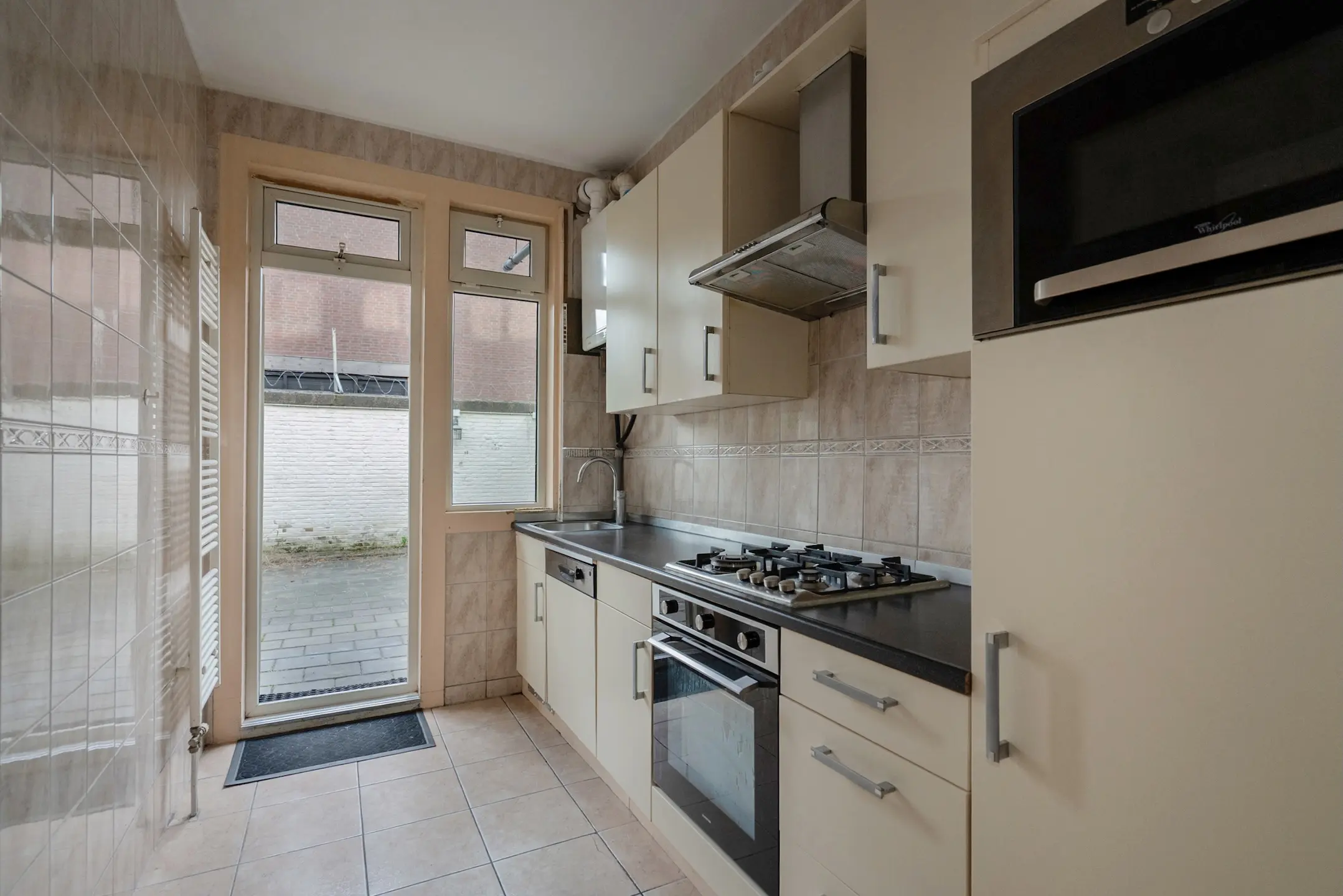 De gesloten keuken is compleet uitgerust met een 4-pits gasfornuis, afzuigkap, oven, magnetron, spoelbak, vaatwasser en cv-ketel (Intergas, 2019). Ook vanuit de keuken is er toegang tot de achtertuin.