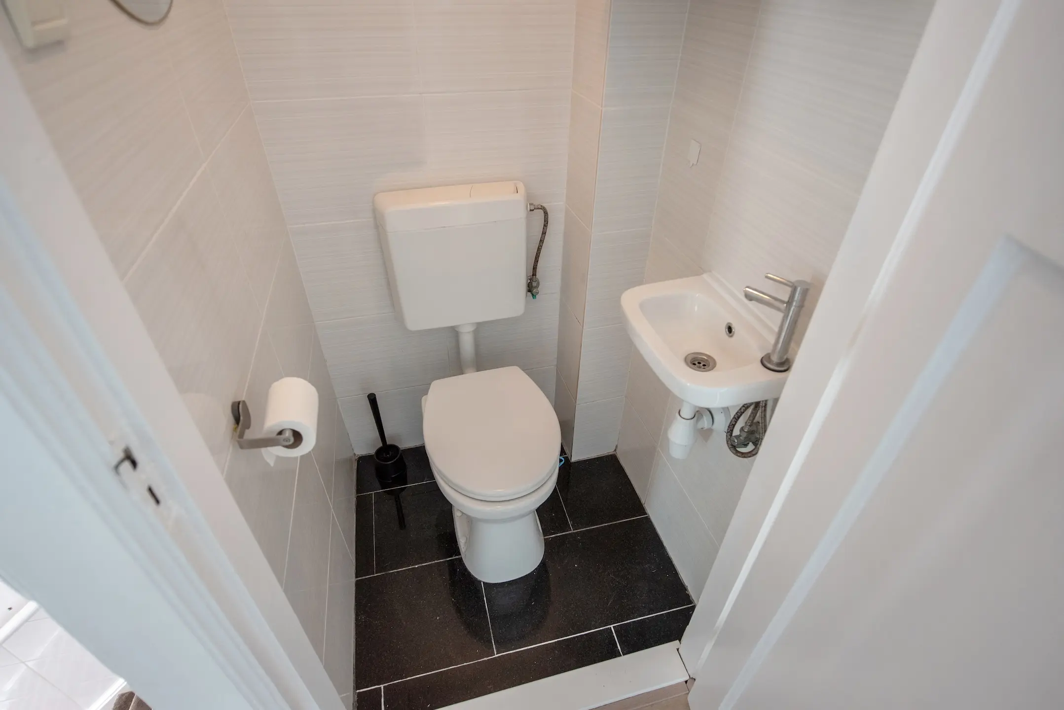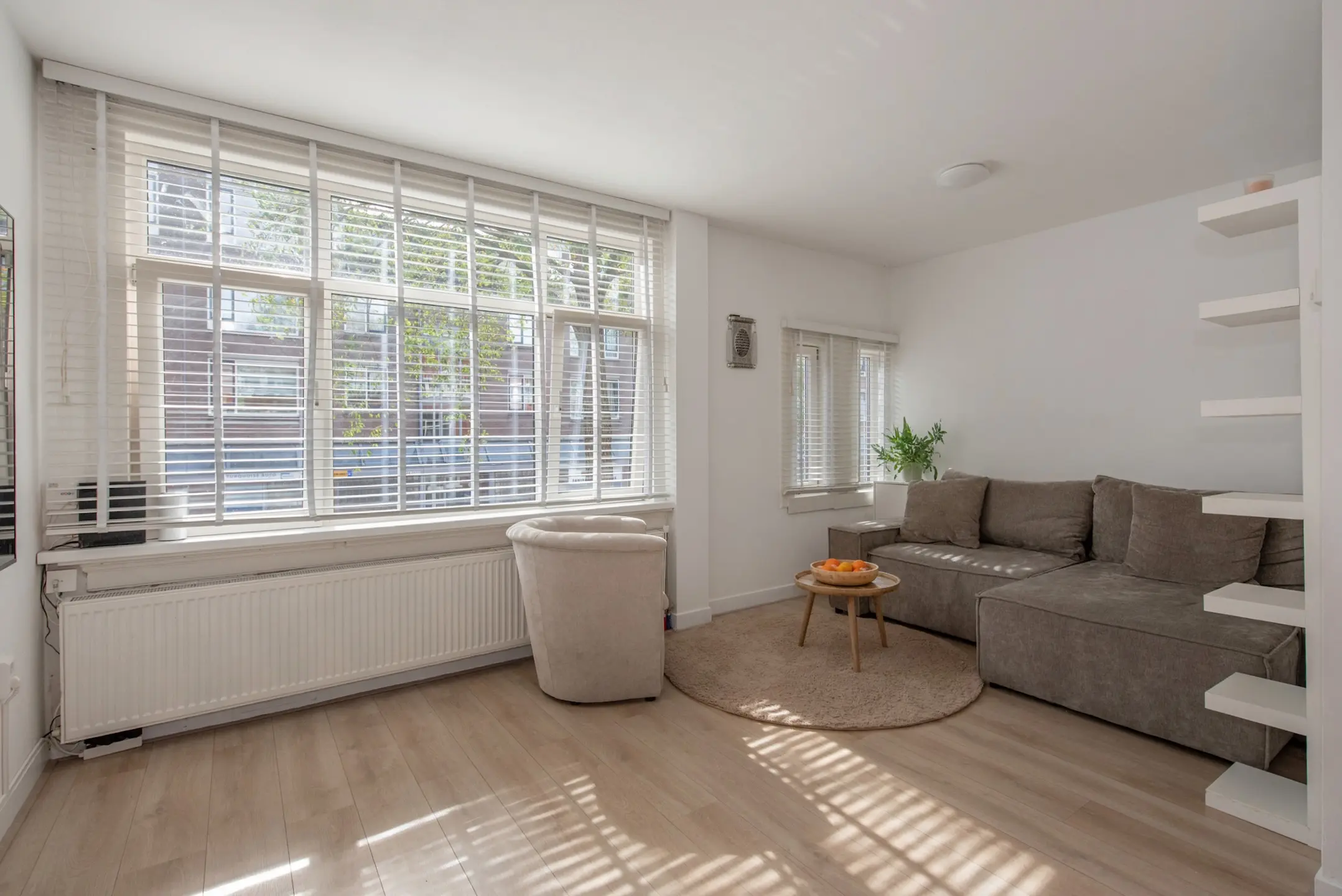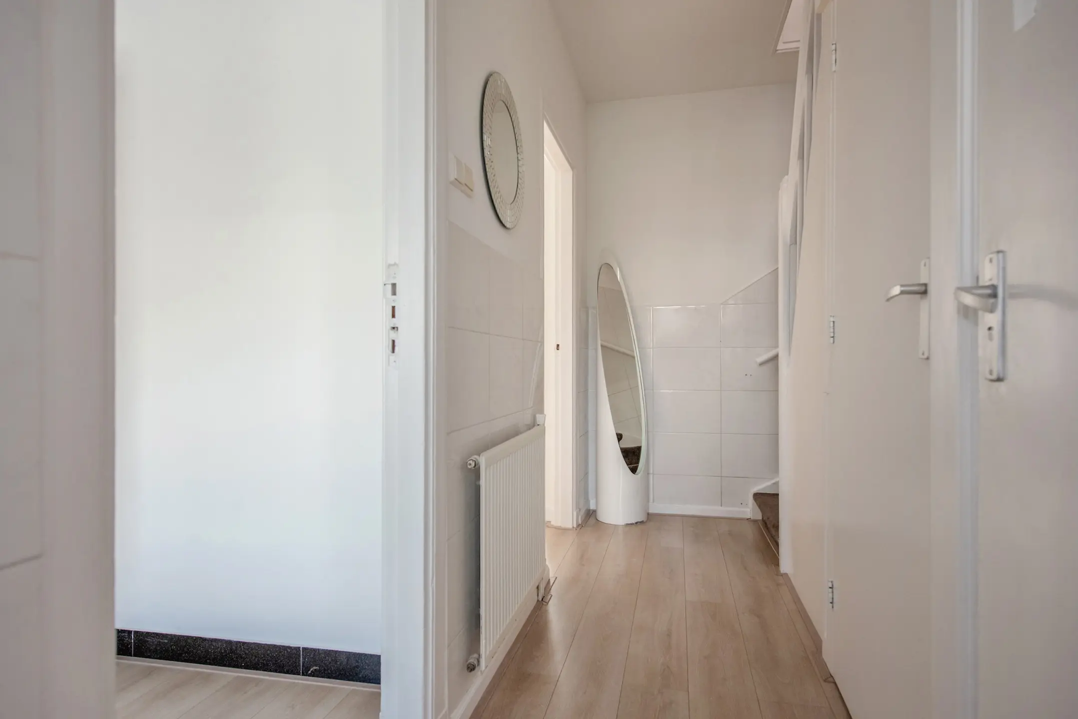 Bij binnenkomst op straatniveau tref je een nette entree met een hal, de meterkast (voorzien van 5 groepen), een modern toilet met fontein, en toegang tot de woonverdieping. De lichte woonkamer is volledig voorzien van laminaat, met strakke wanden en plafonds voor een eigentijdse uitstraling.