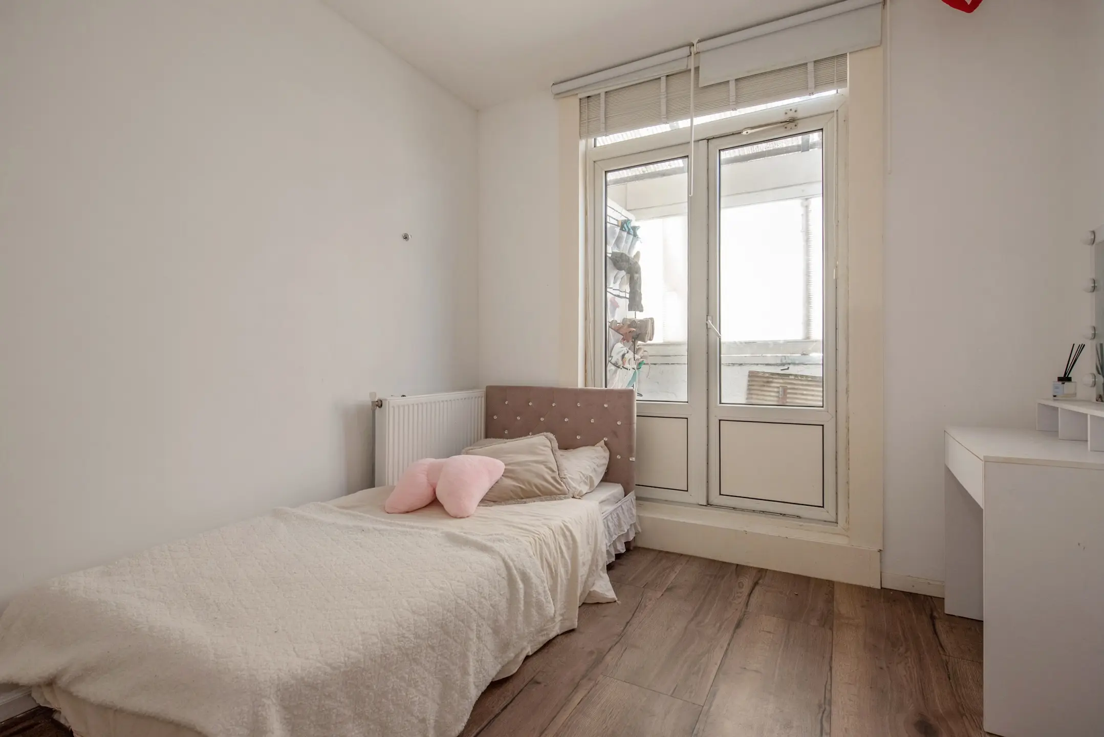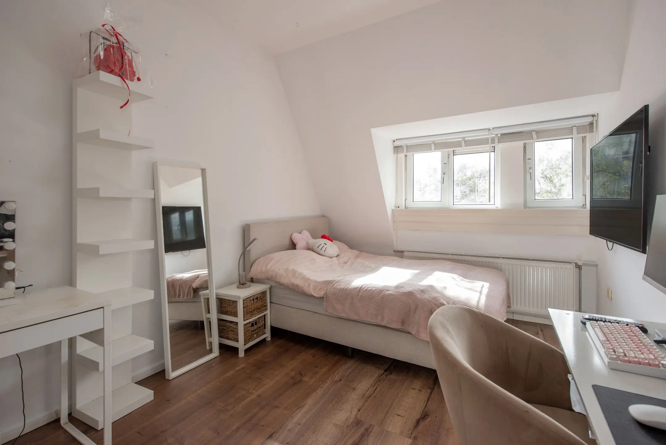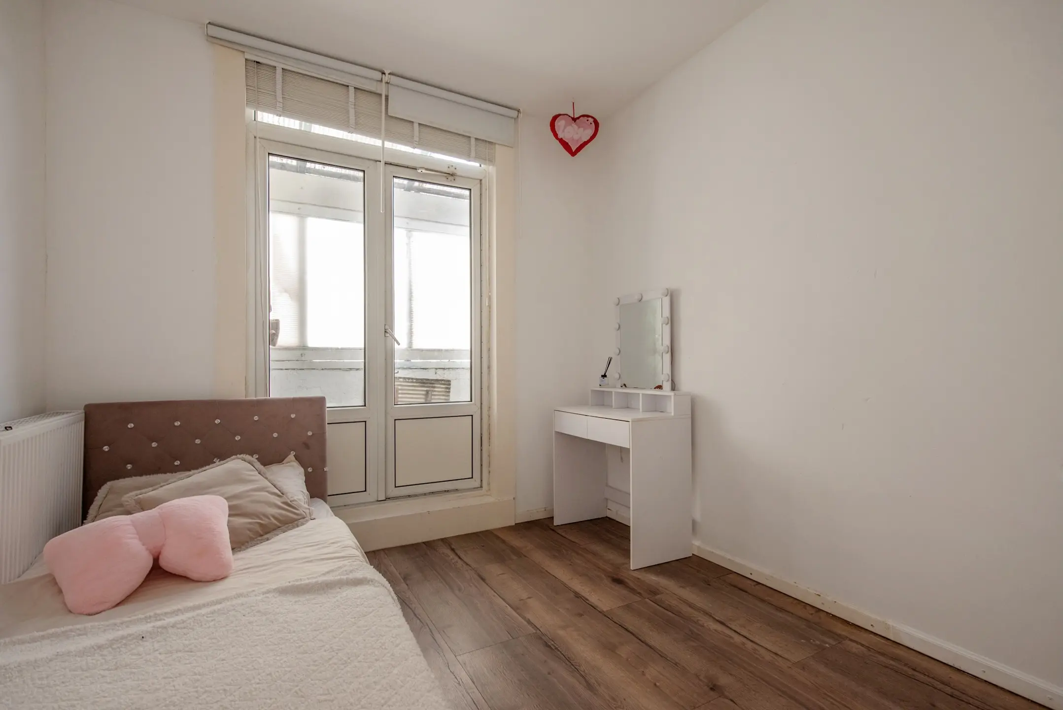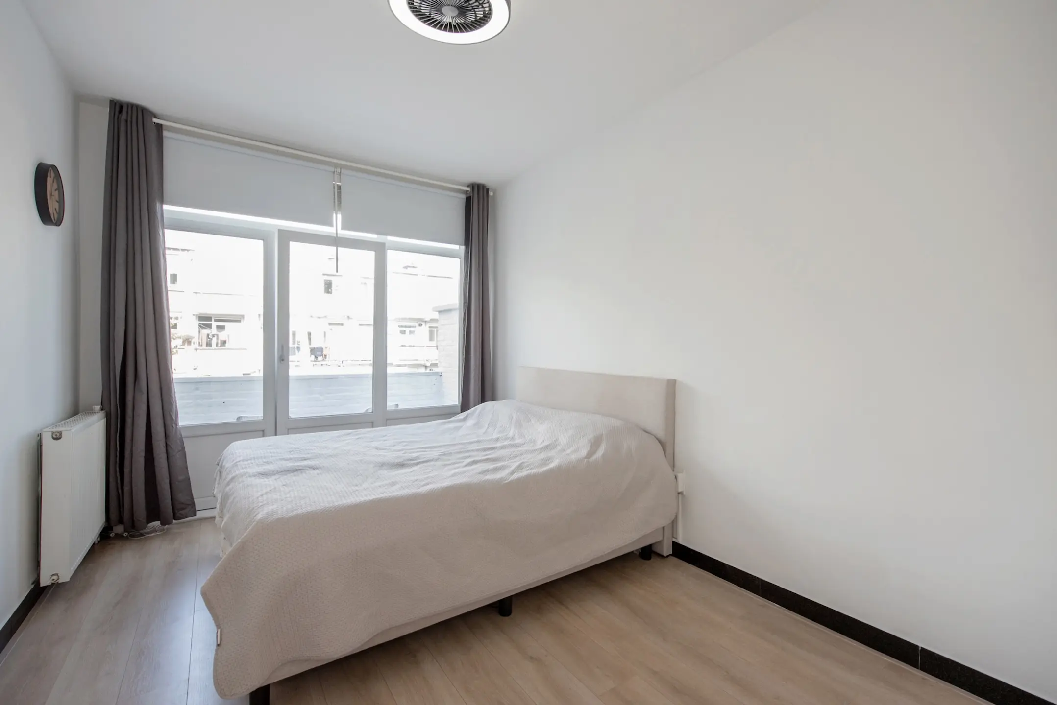 Op de bovenverdieping bevinden zich maar liefst drie slaapkamers, elk met voldoende daglicht. De kamer aan de achterzijde biedt eveneens toegang tot een tweede balkon. De nette badkamer is voorzien van een inloopdouche, modern wastafelmeubel met kraan, tweede toilet, een radiator en aansluitingen voor wasmachine en droger.