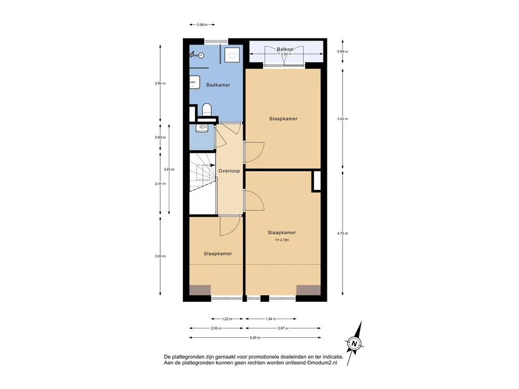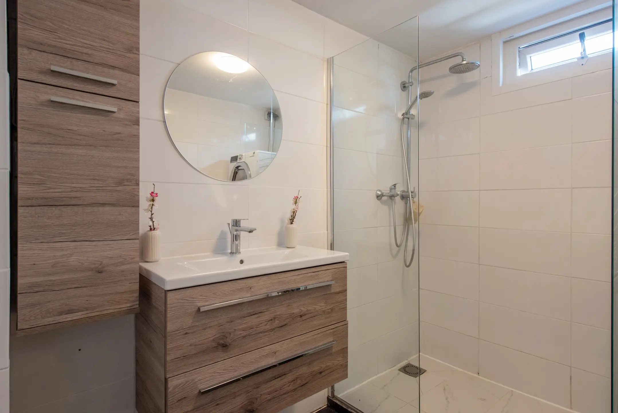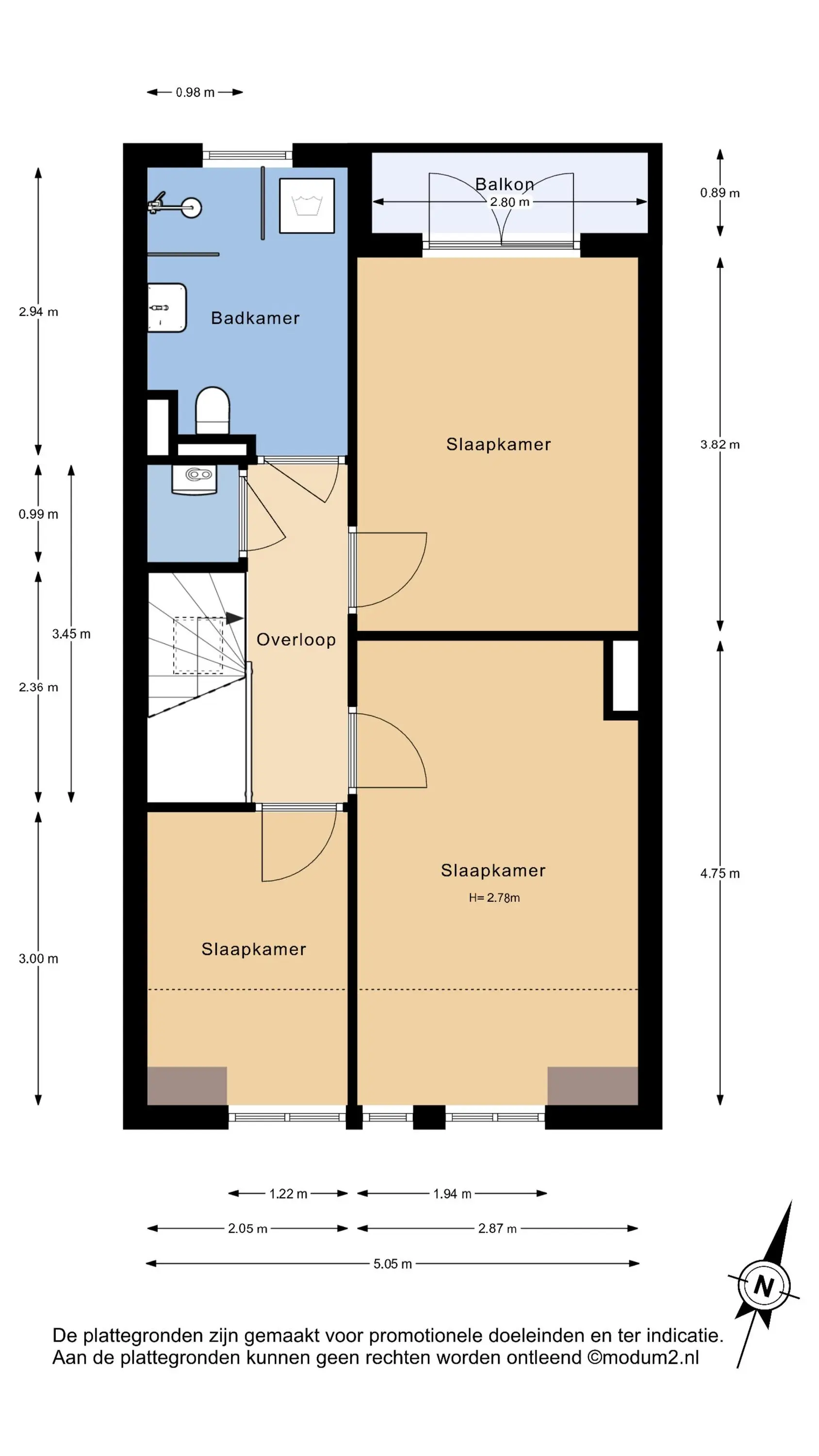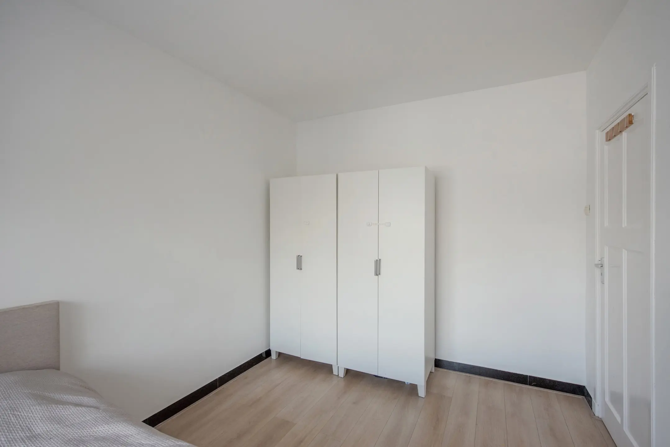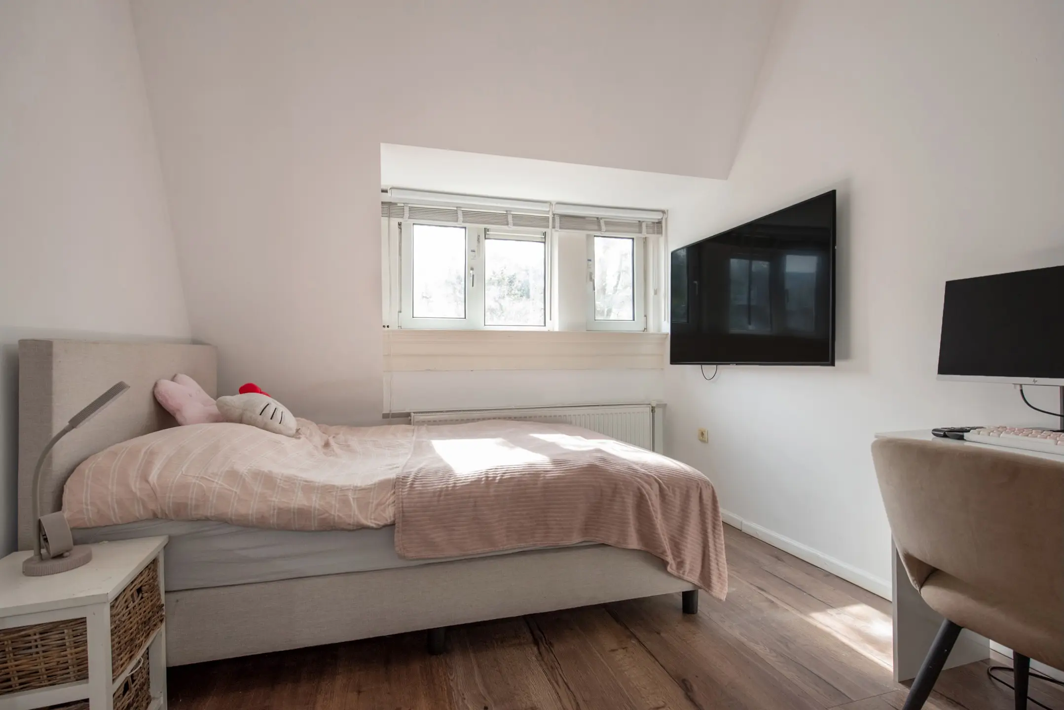 Op de bovenverdieping bevinden zich maar liefst drie slaapkamers, elk met voldoende daglicht. De kamer aan de achterzijde biedt eveneens toegang tot een tweede balkon. De nette badkamer is voorzien van een inloopdouche, modern wastafelmeubel met kraan, tweede toilet, een radiator en aansluitingen voor wasmachine en droger.