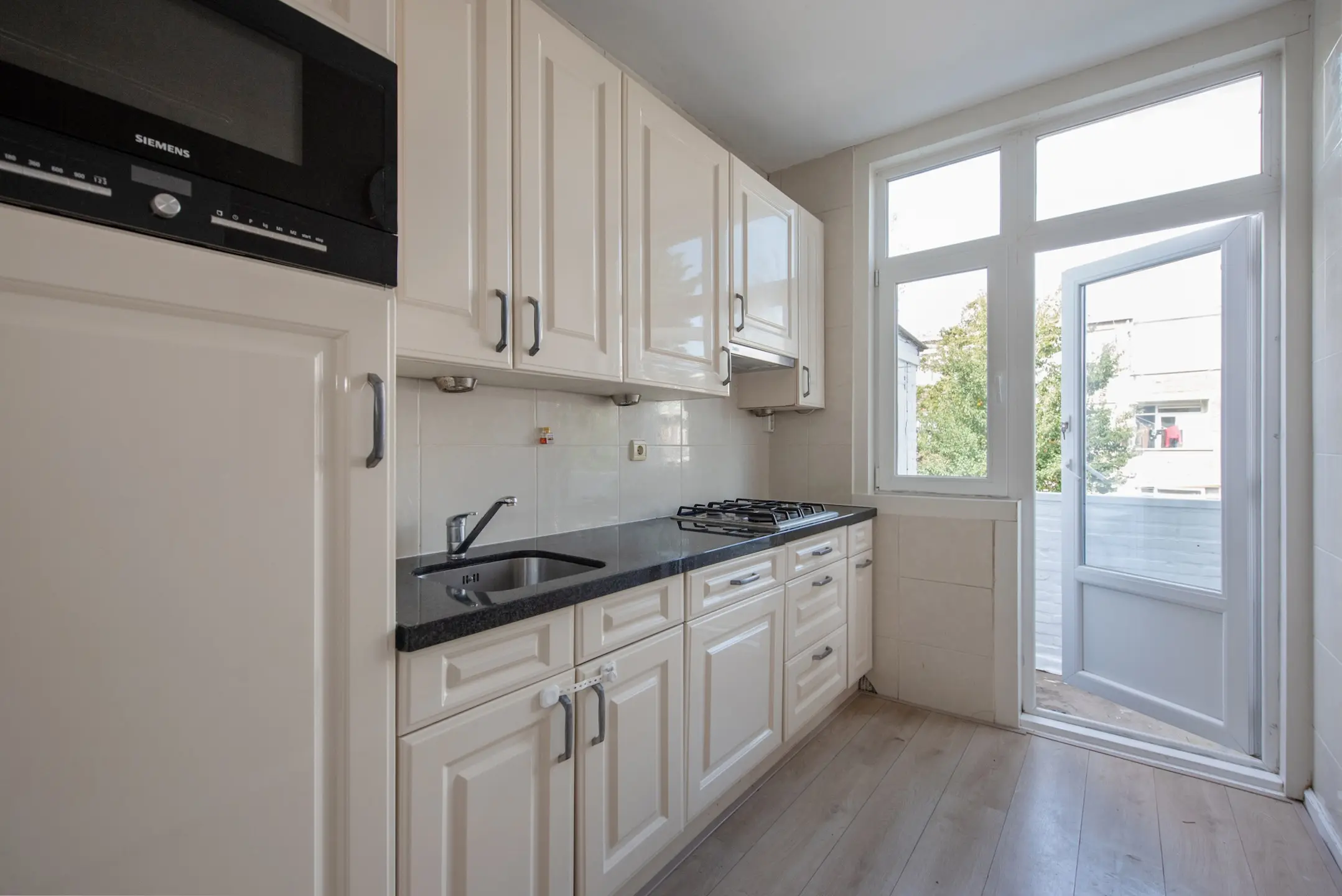 De keuken is compact maar compleet en van alle gemakken voorzien: een koel-/vriescombinatie, magnetron, 4-pits fornuis, vaatwasser en een spoelbak. Ook vanuit de keuken heb je toegang tot het balkon.