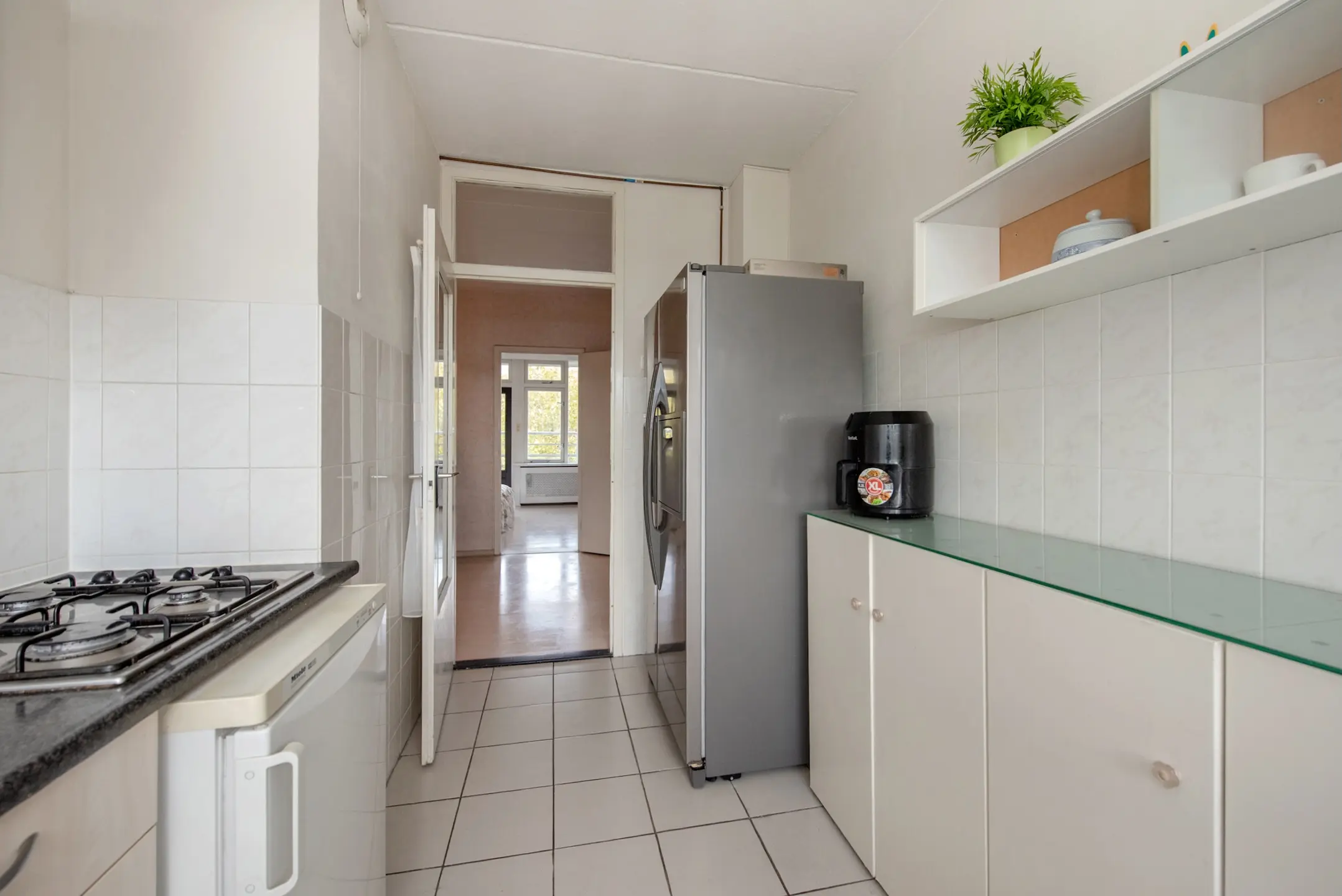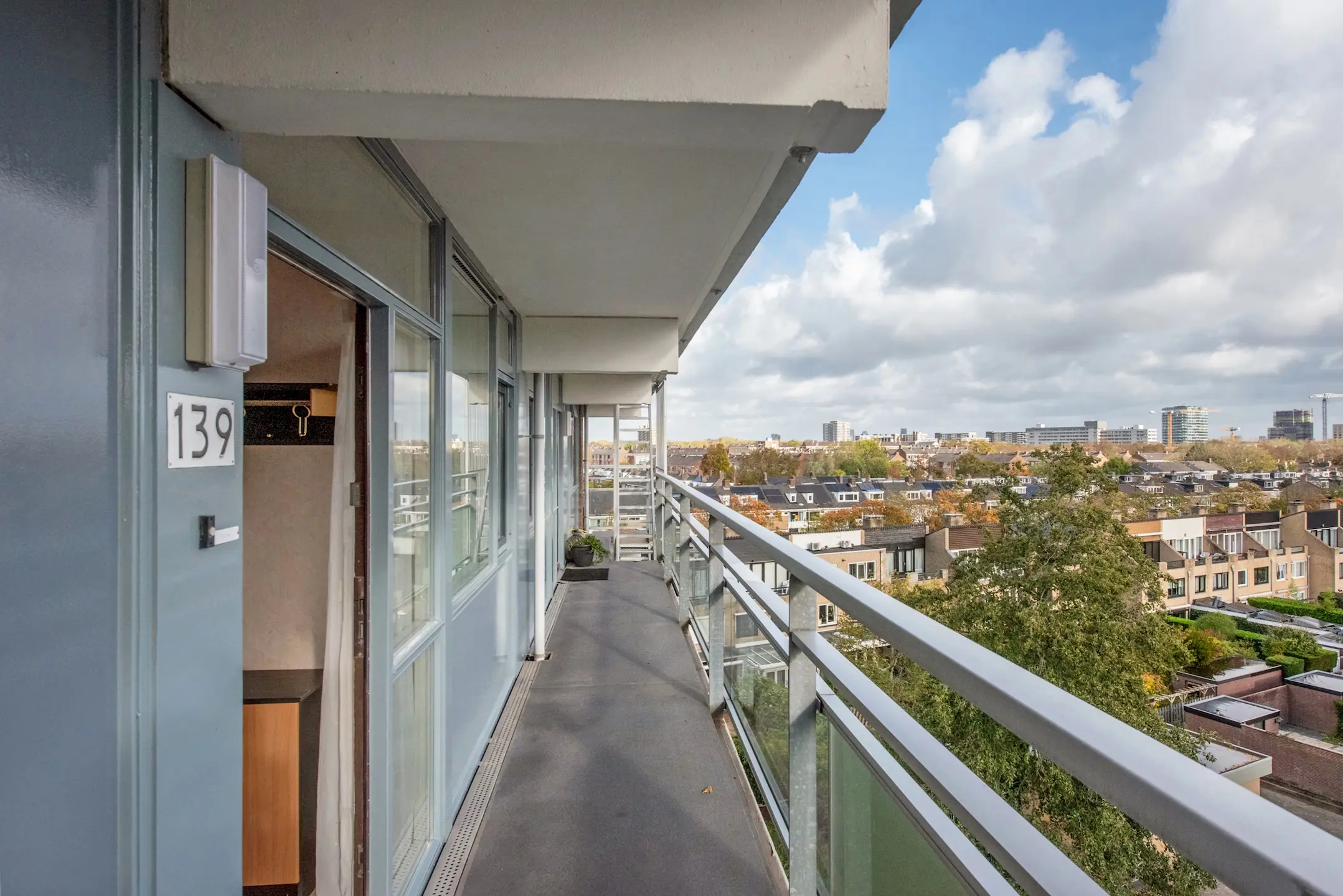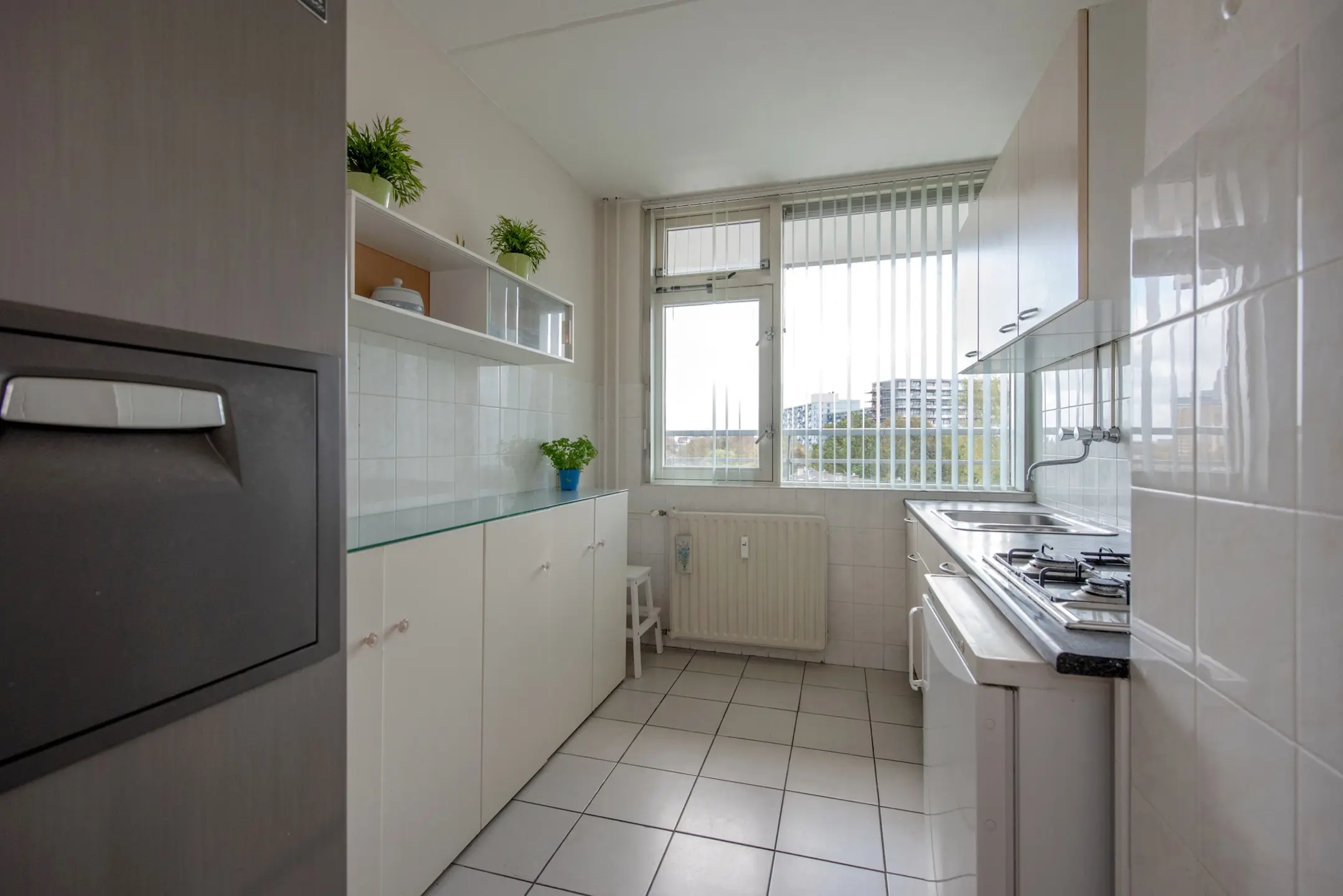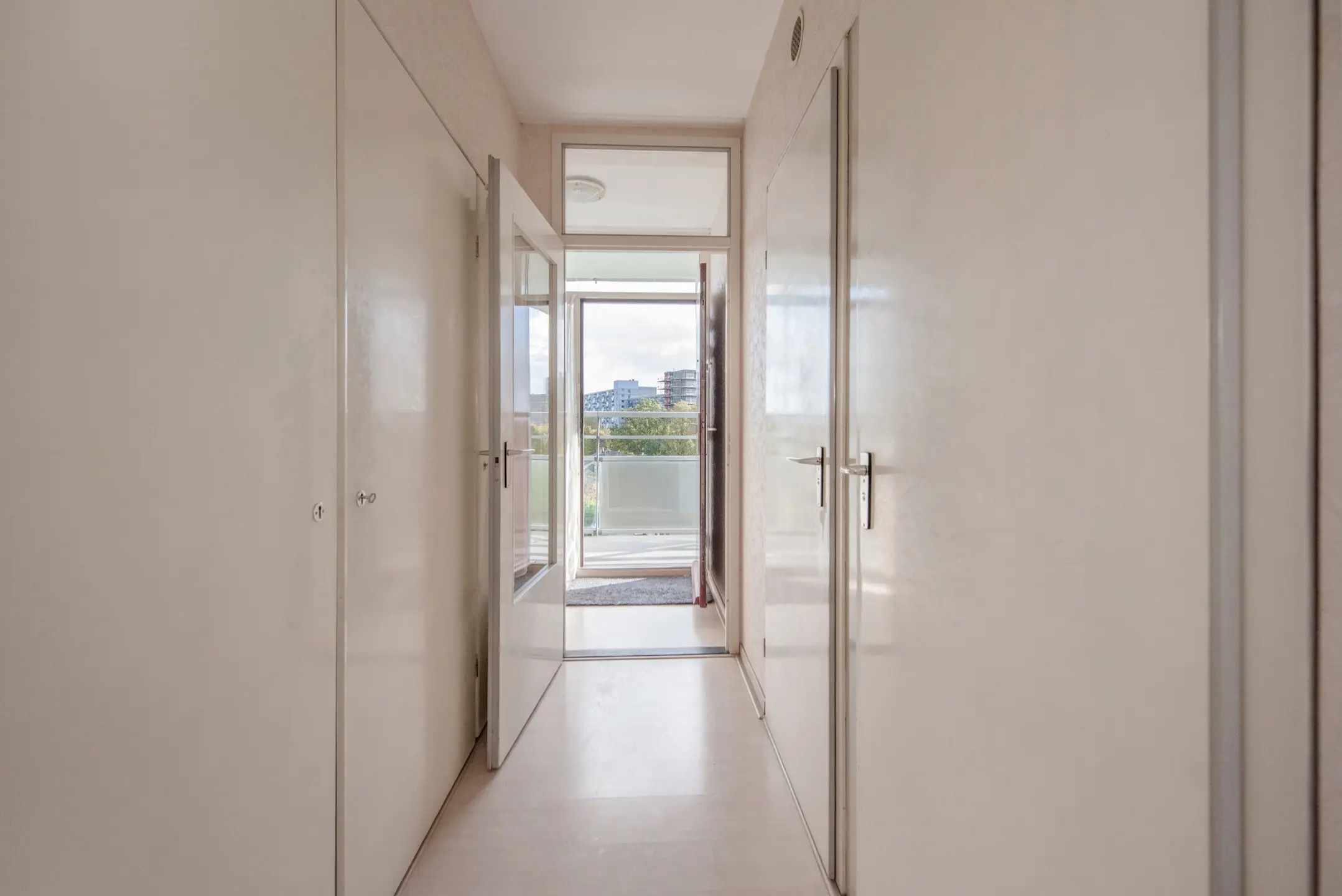 Via de gesloten entree met brievenbussen en het bellenplateau bereikt u de lift of trap naar de vijfde verdieping. De woning ligt aan een nette galerij. U stapt binnen in de hal, waar zich de meterkast bevindt en twee vaste kasten, waarvan één praktisch is ingericht voor de wasmachine – mooi uit het zicht.