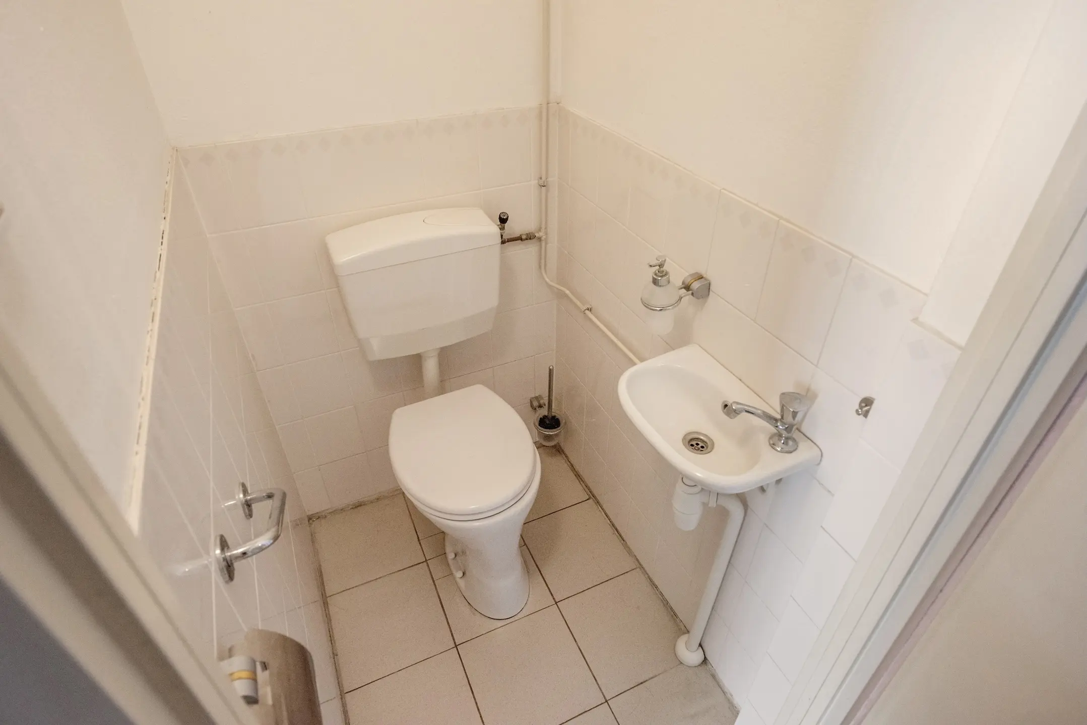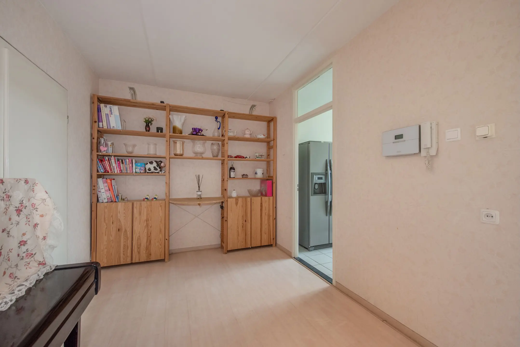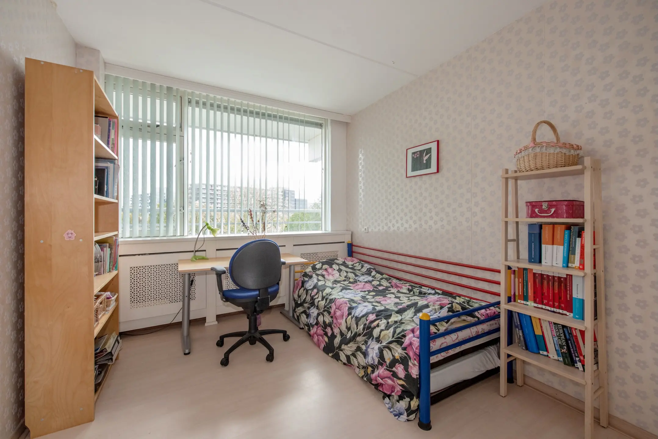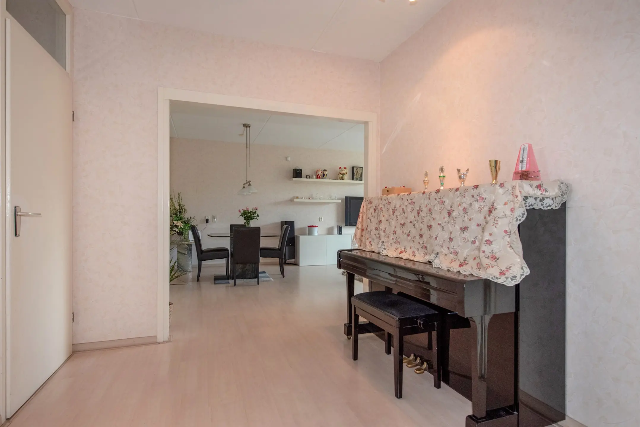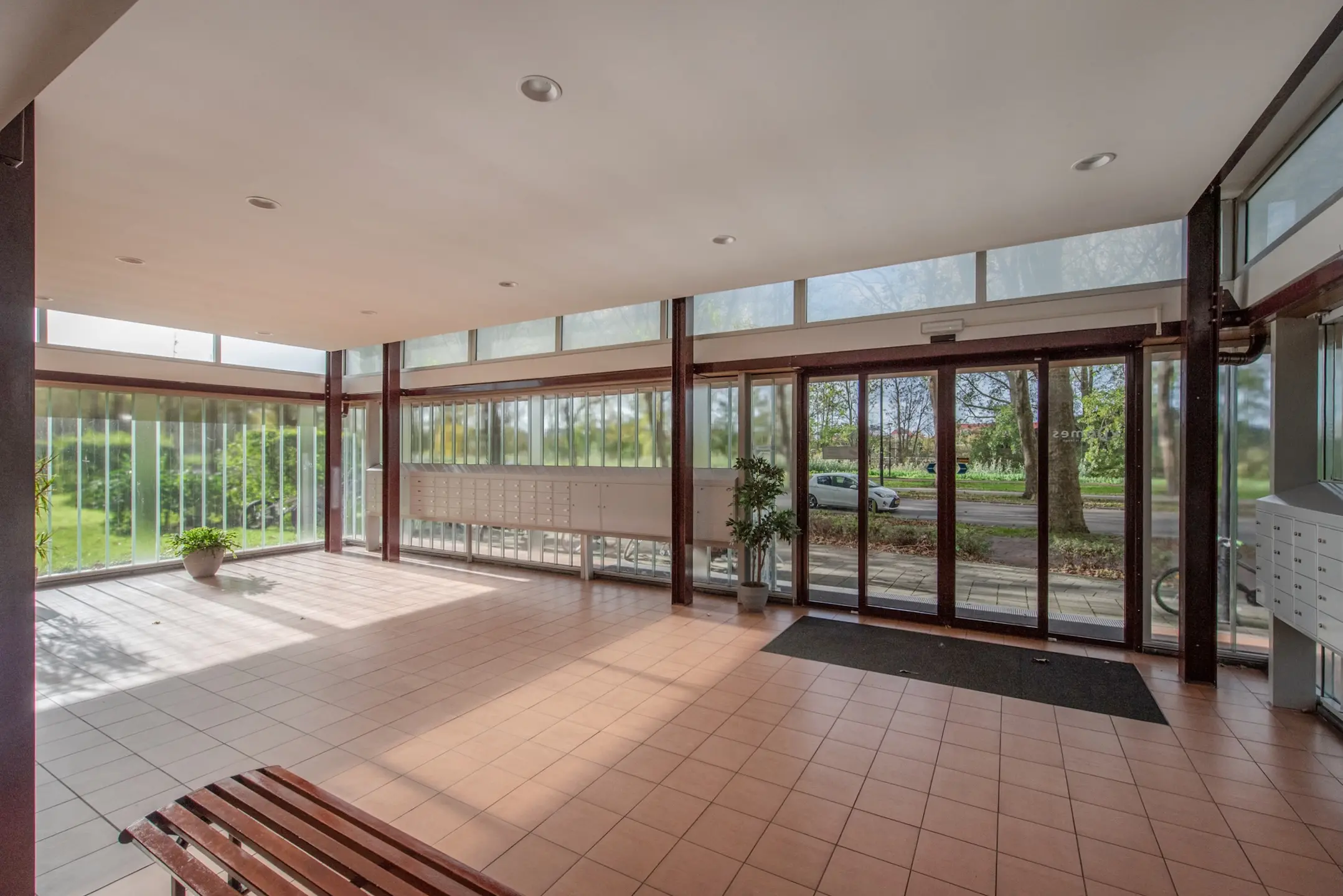 Via de gesloten entree met brievenbussen en het bellenplateau bereikt u de lift of trap naar de vijfde verdieping. De woning ligt aan een nette galerij. U stapt binnen in de hal, waar zich de meterkast bevindt en twee vaste kasten, waarvan één praktisch is ingericht voor de wasmachine – mooi uit het zicht.