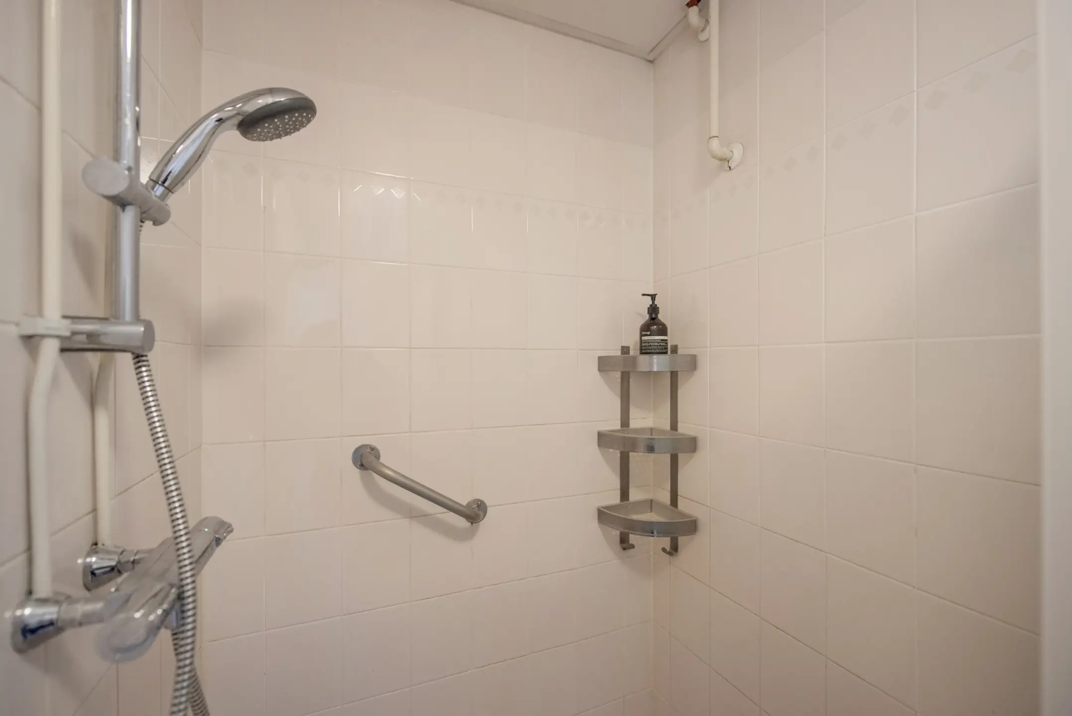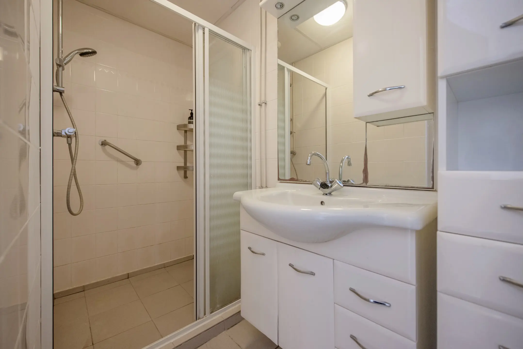 De badkamer is modern en voorzien van een ruime douche en een royaal wastafelmeubel. Het toilet met fontein is separaat, prettig voor dagelijks gebruik.