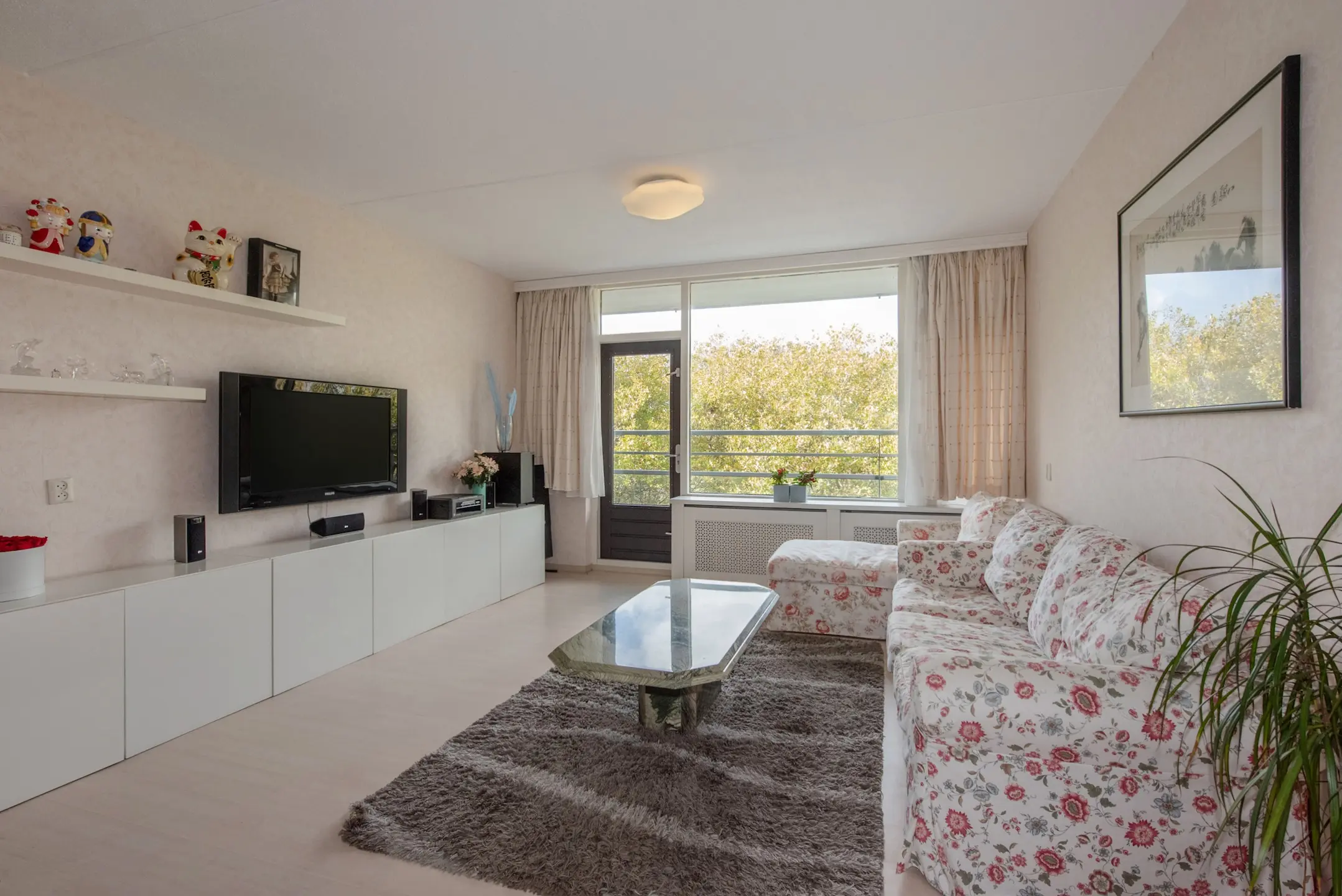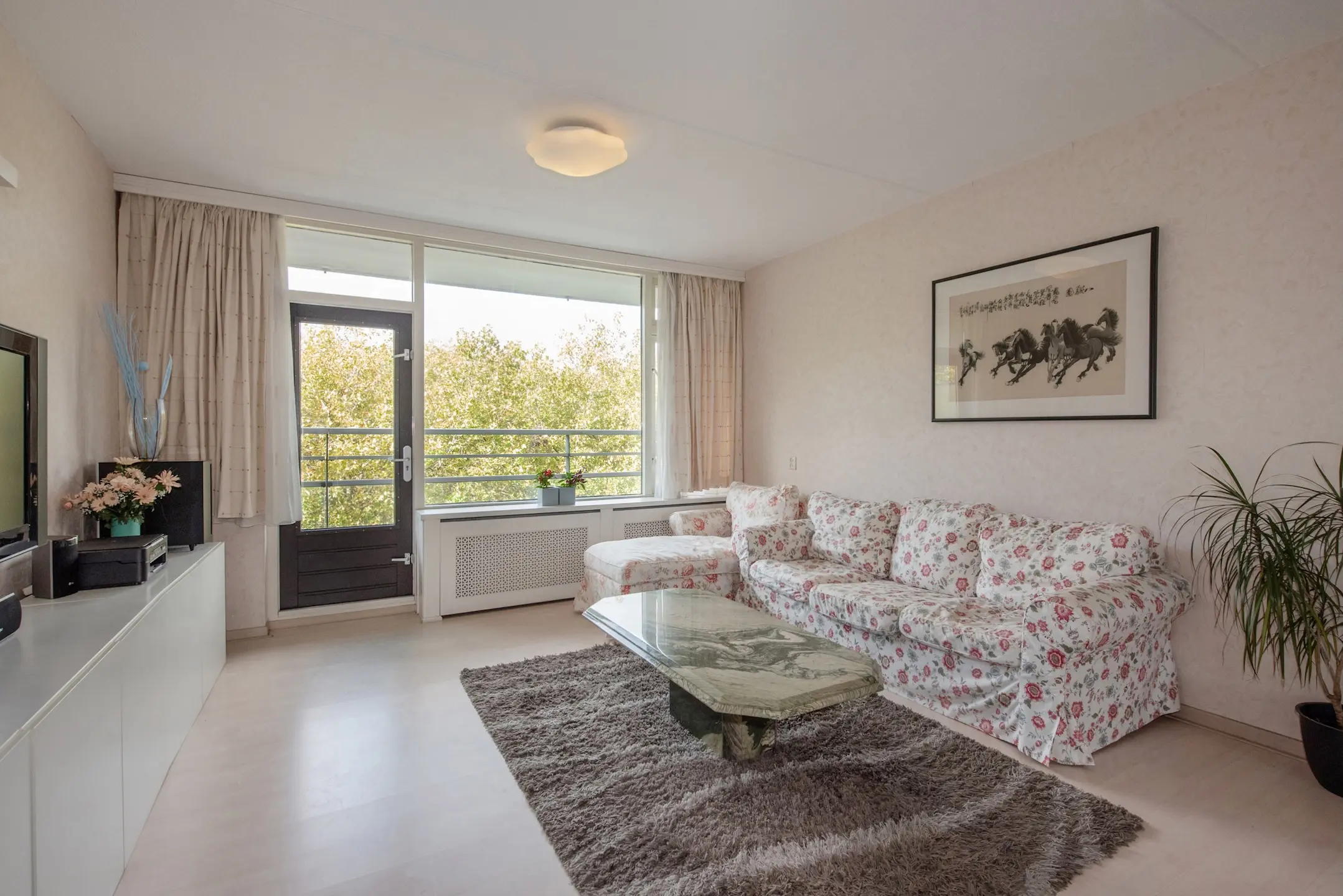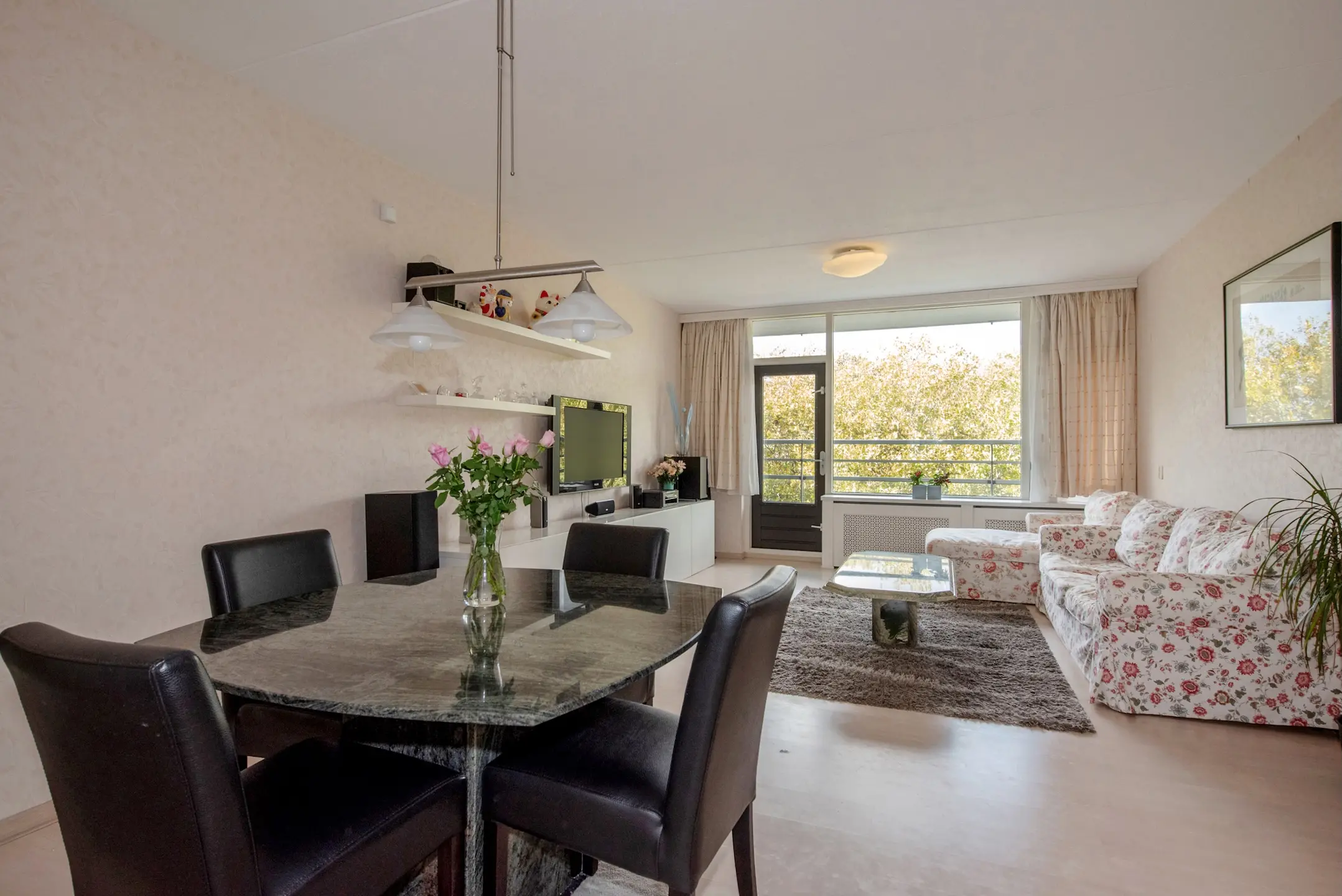 De lichte woon- en eetkamer vormt het hart van het appartement: een ruime, uitnodigende leefruimte met veel lichtinval. Hier is tevens de deur naar het balkon op het westen, waar u ’s middags en ’s avonds heerlijk in de zon zit. De glazen reling zorgt voor een vrije blik over het omringende groen – een fijne plek voor een kop koffie of een goed glas wijn.
