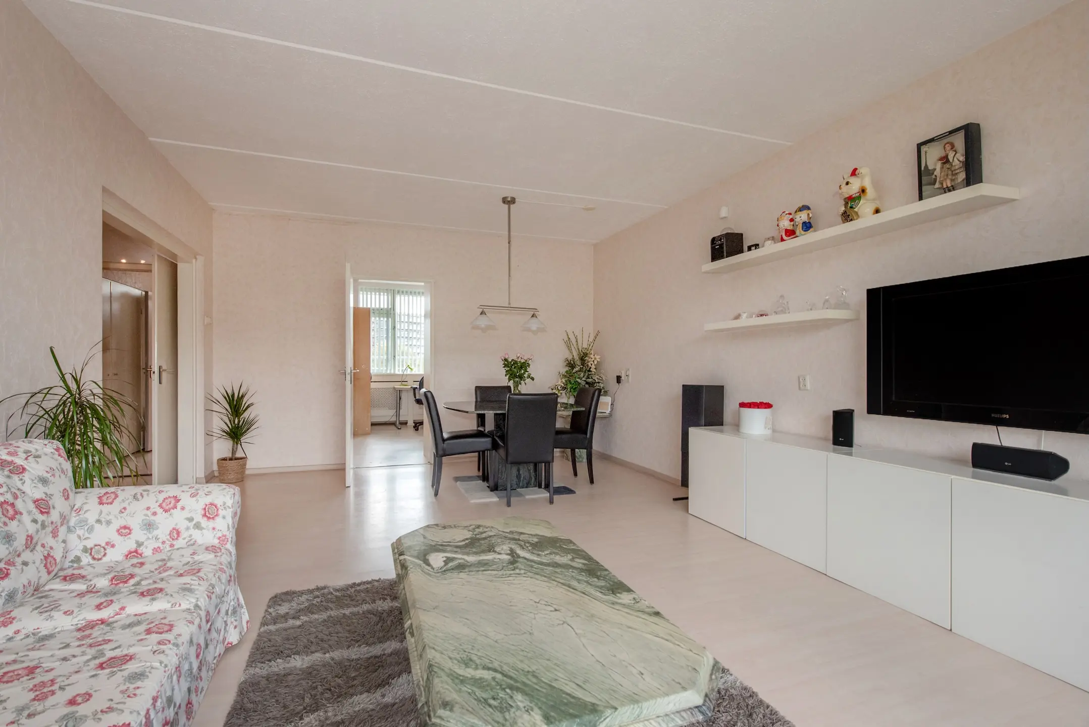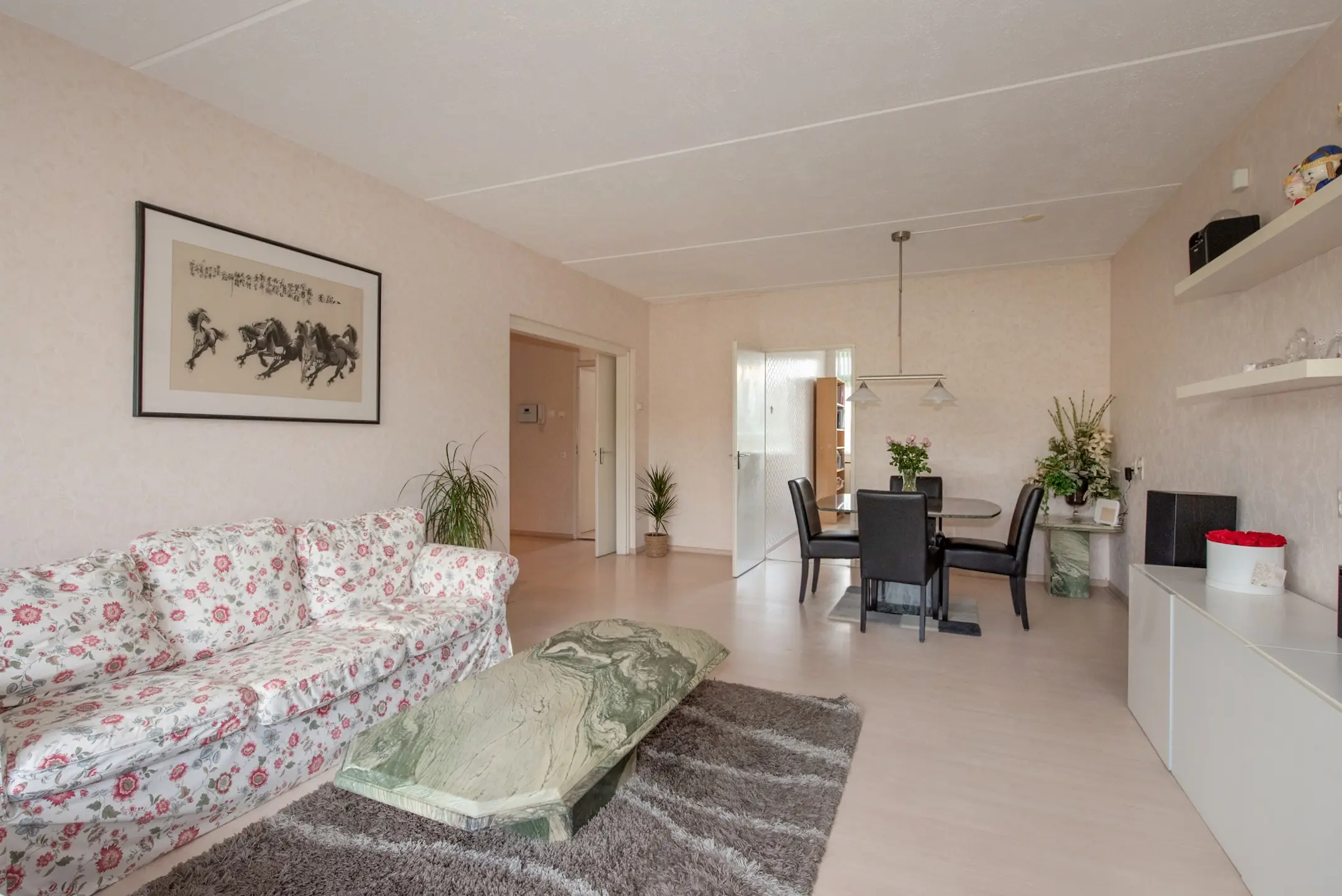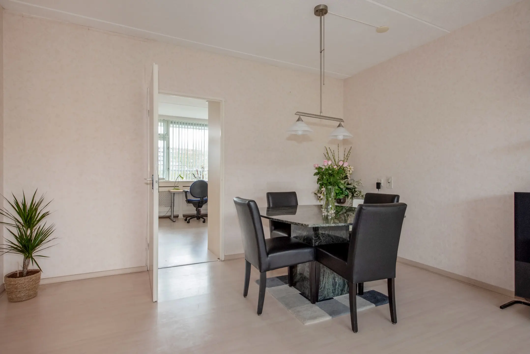 De lichte woon- en eetkamer vormt het hart van het appartement: een ruime, uitnodigende leefruimte met veel lichtinval. Hier is tevens de deur naar het balkon op het westen, waar u ’s middags en ’s avonds heerlijk in de zon zit. De glazen reling zorgt voor een vrije blik over het omringende groen – een fijne plek voor een kop koffie of een goed glas wijn.