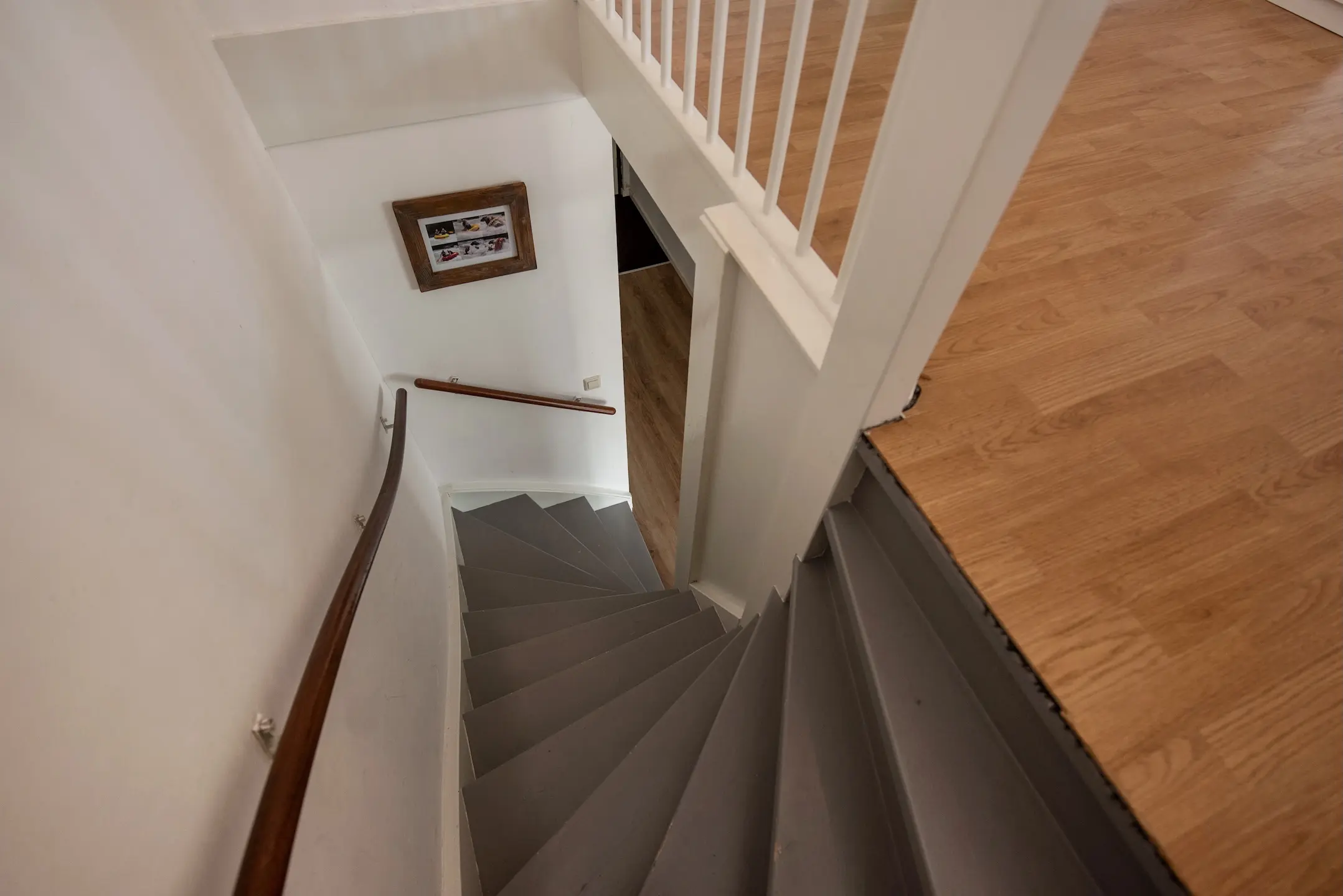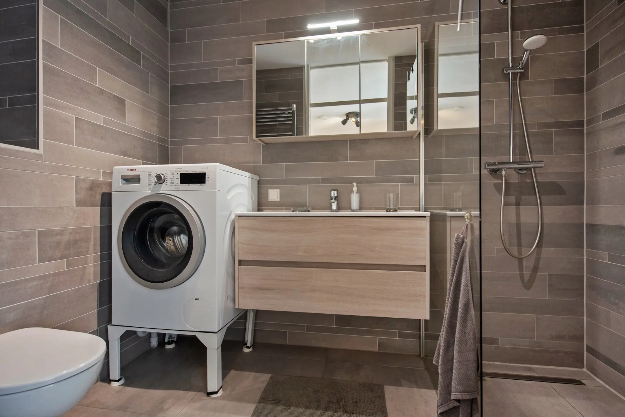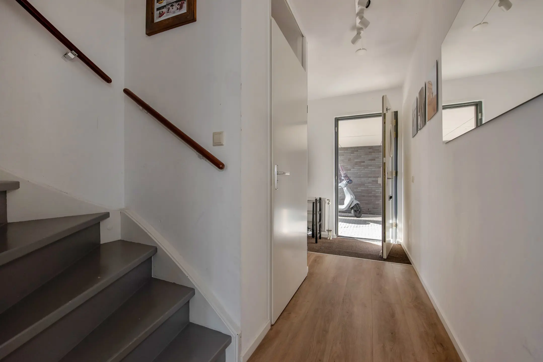 1e verdieping: via de vaste trap vanuit de hal bereikt u de 1e verdieping, ruime overloop, riante voorgelegen hoofdslaapkamer, moderne badkamer (geheel betegeld) met inloop douche voorzien van drain en rainshower, wastafelmeubel, designradiator en opstelplaats voor wasmachine en droger, royale achtergelegen slaapkamer en 3e ruime slaapkamer. De gehele verdieping is voorzien van een laminaatvloer.