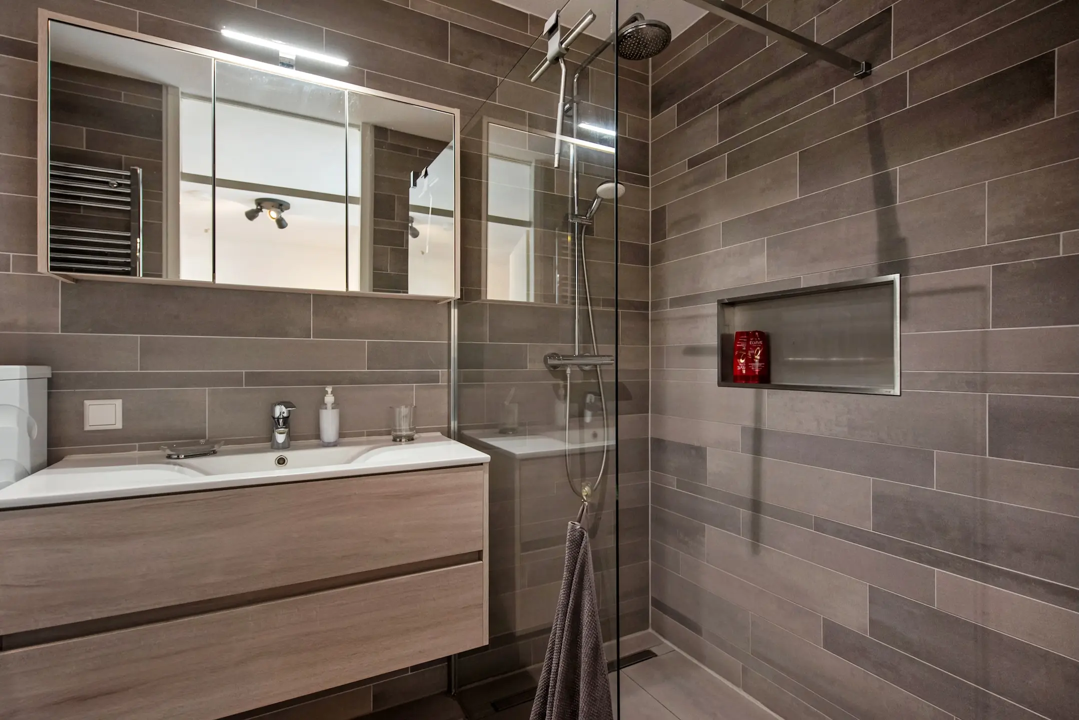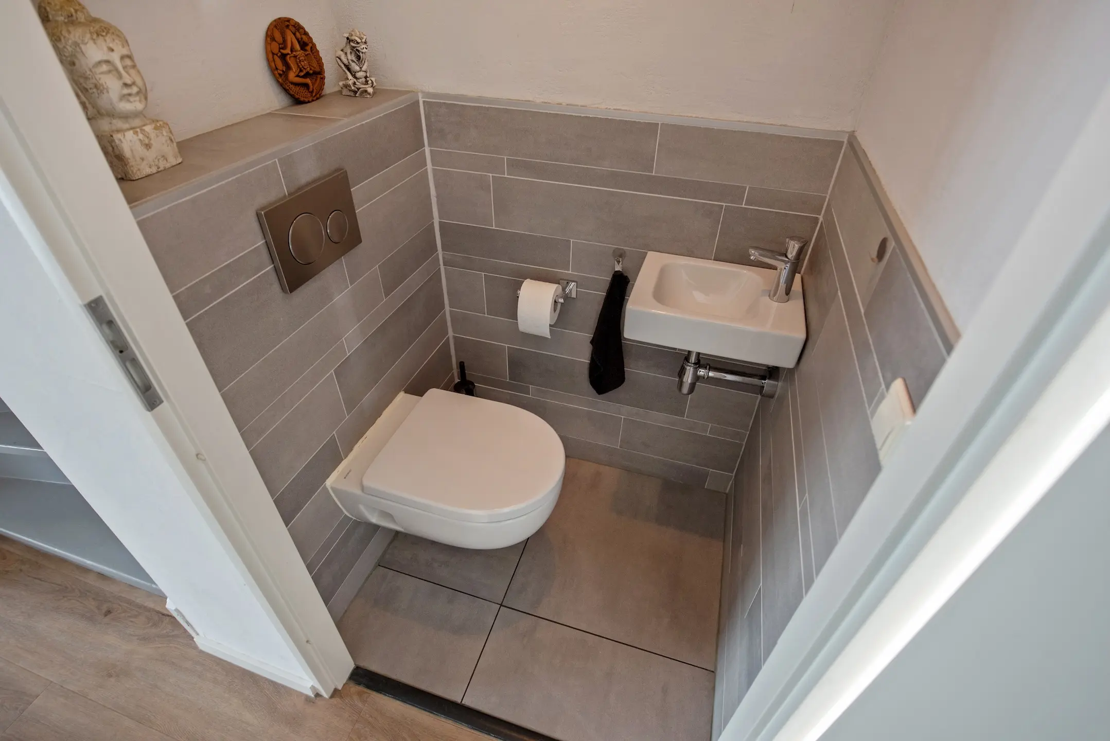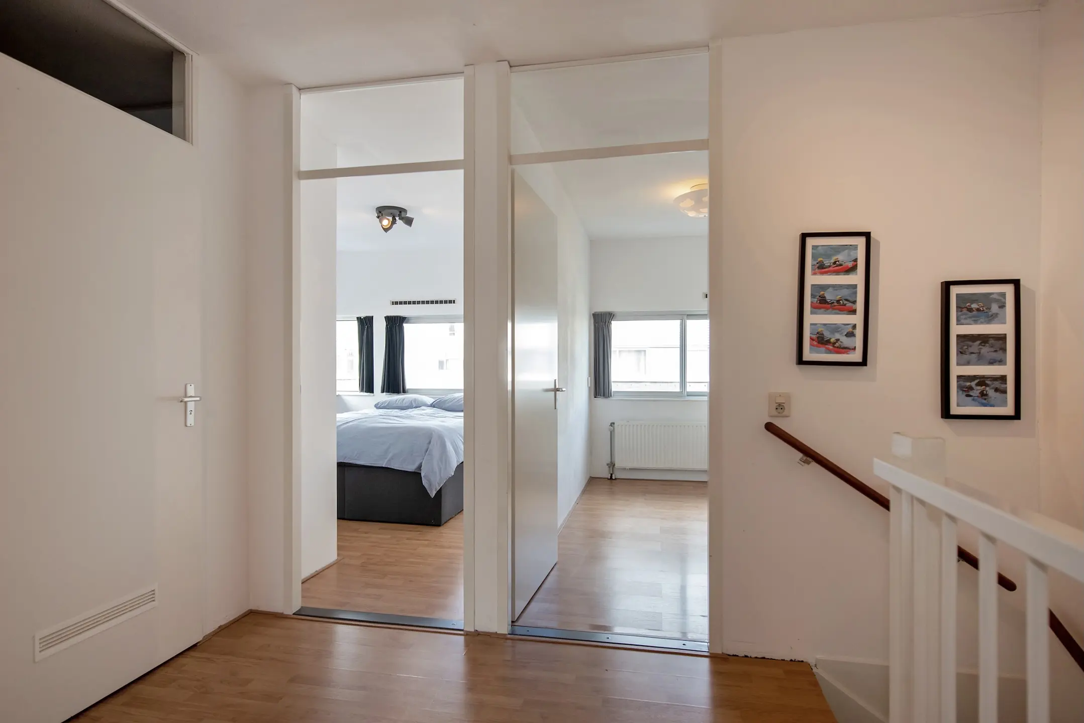 1e verdieping: via de vaste trap vanuit de hal bereikt u de 1e verdieping, ruime overloop, riante voorgelegen hoofdslaapkamer, moderne badkamer (geheel betegeld) met inloop douche voorzien van drain en rainshower, wastafelmeubel, designradiator en opstelplaats voor wasmachine en droger, royale achtergelegen slaapkamer en 3e ruime slaapkamer. De gehele verdieping is voorzien van een laminaatvloer.
