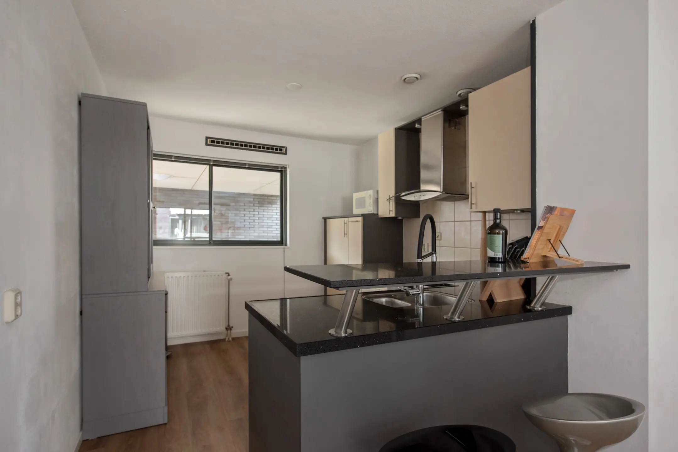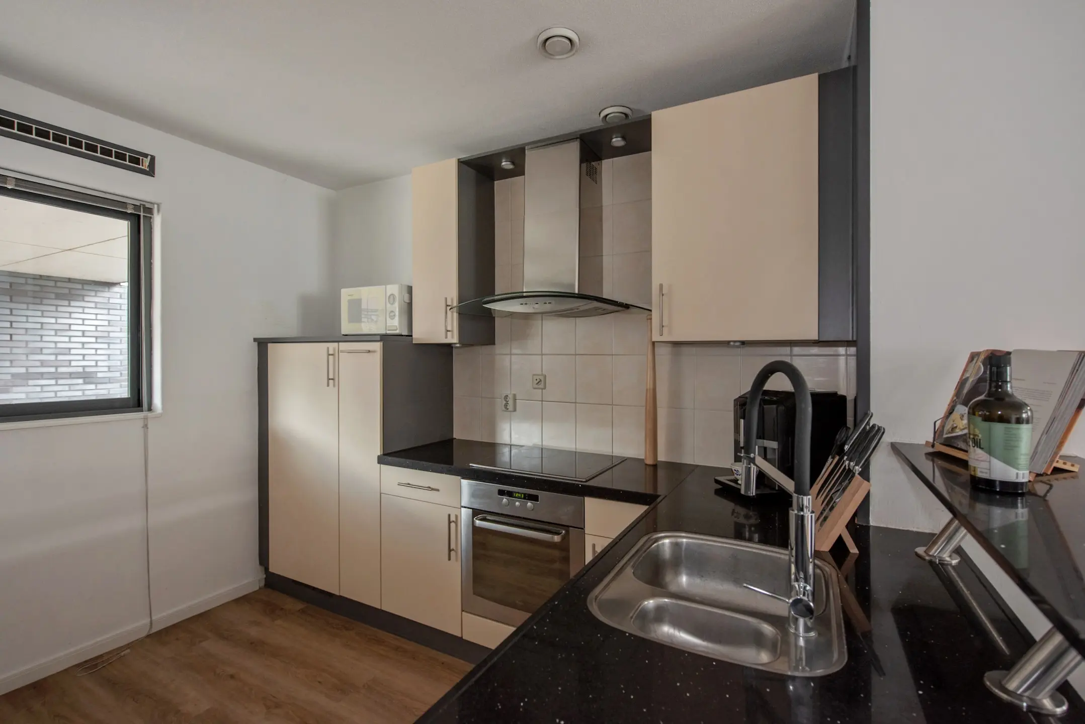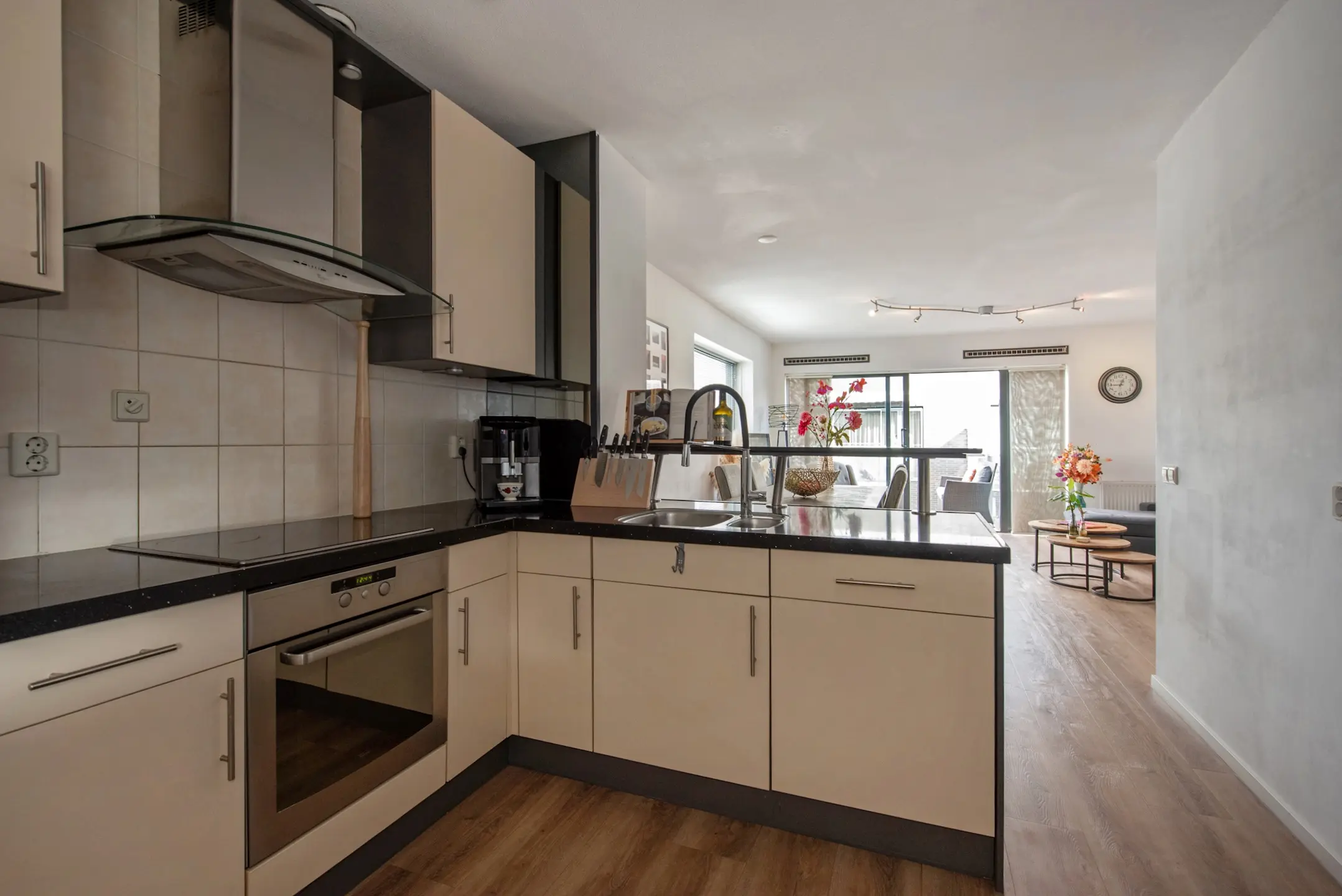 Indeling: entree, hal, meterkast, modern vrij hangend toilet met fontein, schitterende en door grote raampartijen lichte woon-/eetkamer met keurige voorgelegen keuken in L-vorm met breakfast bar, granieten aanrechtblad, apothekerskast, RVS afzuigkap en diverse inbouwapparatuur w.o. keramische kookplaat, oven en koelkast met vriesvak, voorraadkast / trapkast, middels schuifpui heeft men toegang tot het achtergelegen balkon aan het water. De gehele begane grond is voorzien van een PVC vloer.