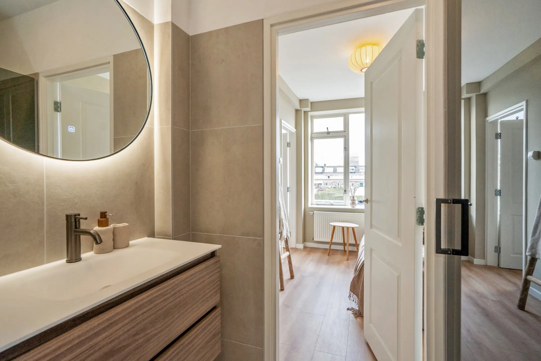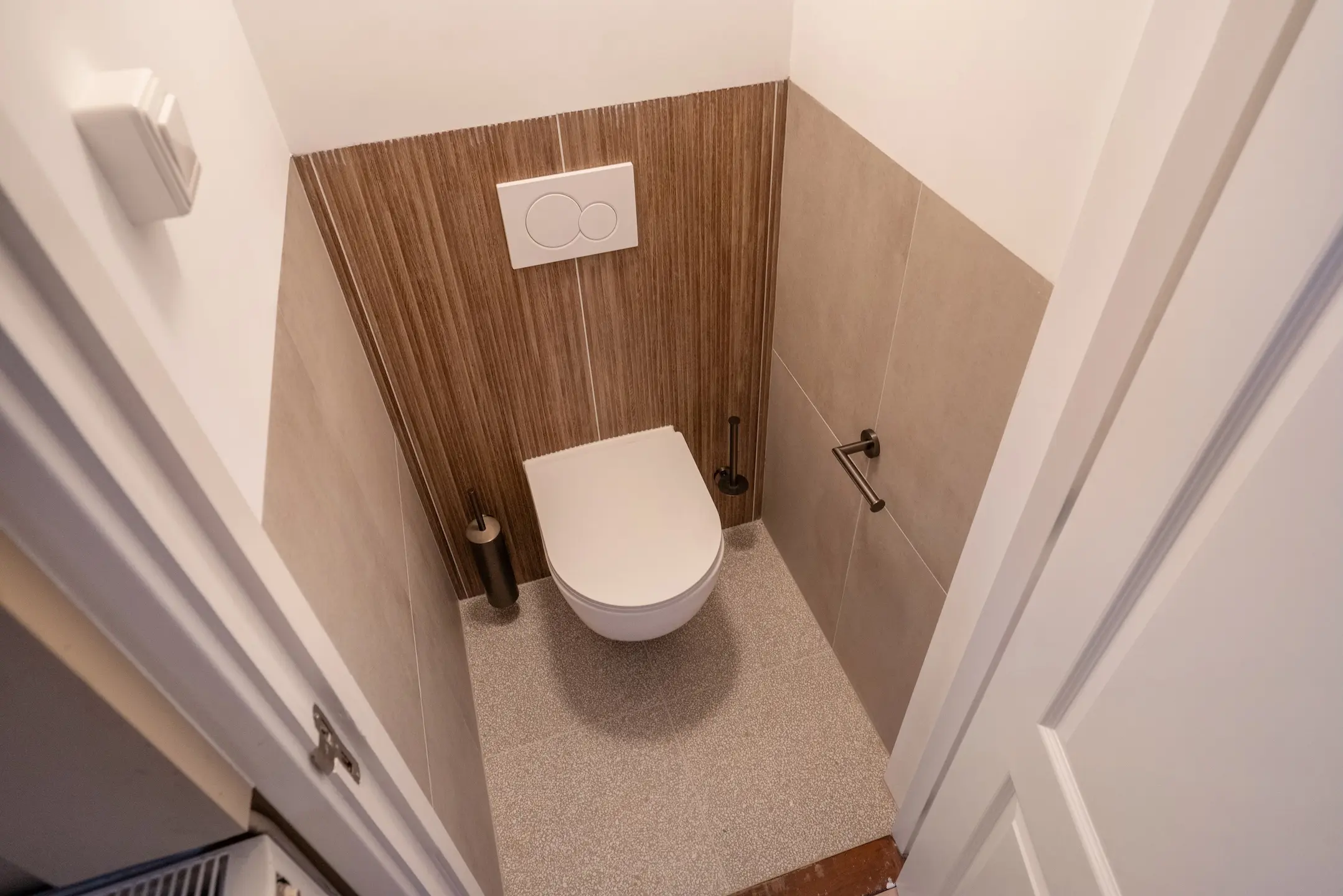 Modern uitgevoerd met zwevend toilet. Handige bergruimte, met opstelplaats voor de HR cv-ketel (2025, Intergas) en wasmachine-/droger.