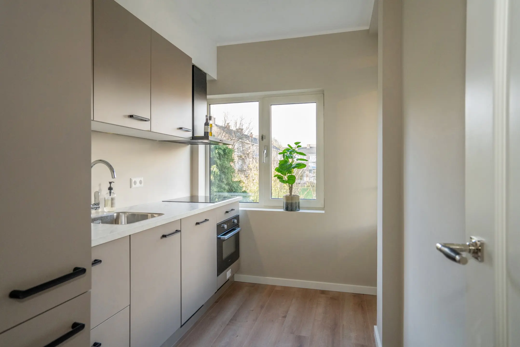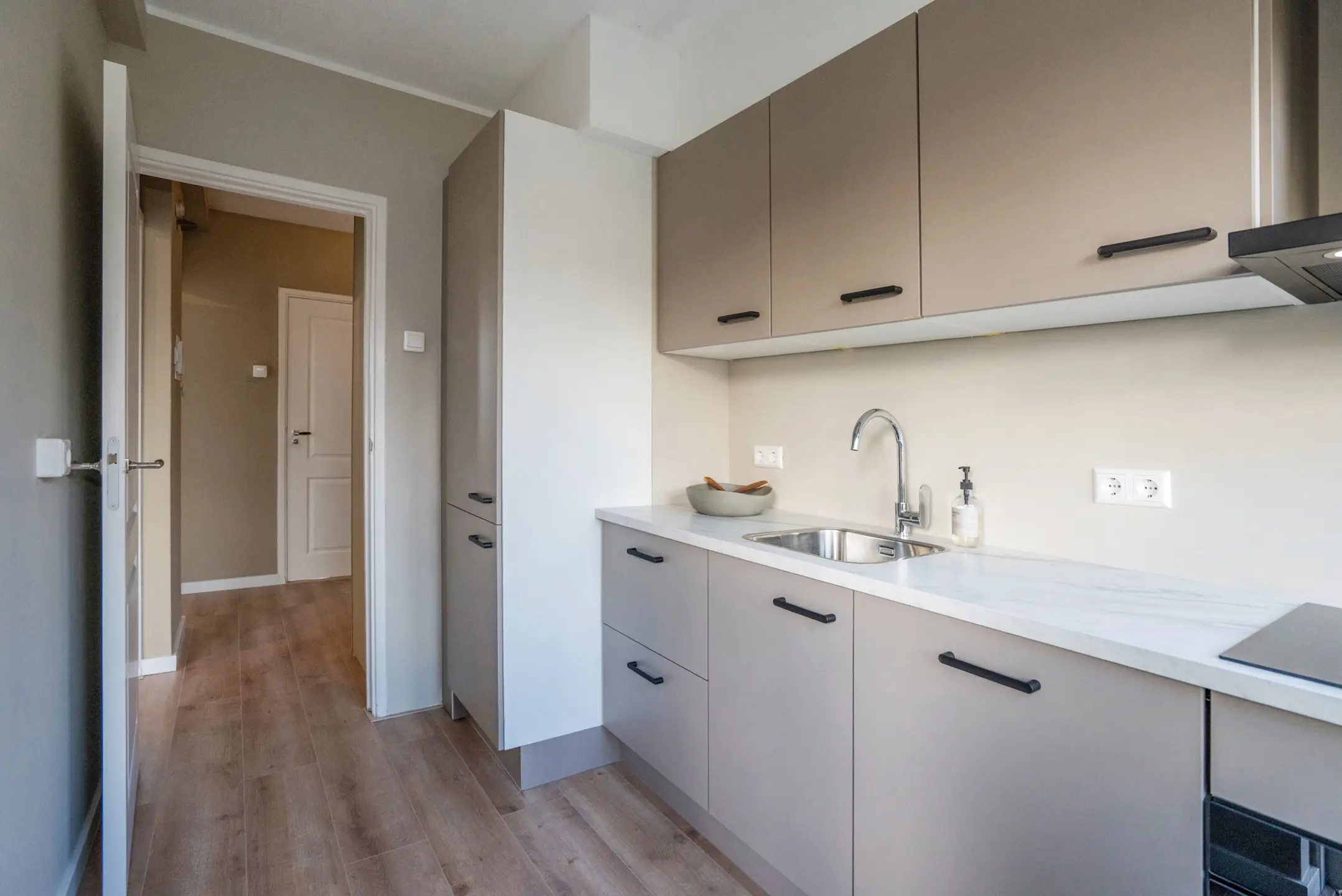Moderne keuken (2025), smaakvol ingericht met moderne kasten en een stijlvol werkblad. Voorzien van diverse inbouwapparatuur waaronder een koelkast/vriezer, combimagnetron, 4-pits gasfornuis met afzuigkap, vaatwasser en spoelbak met mengkraan.