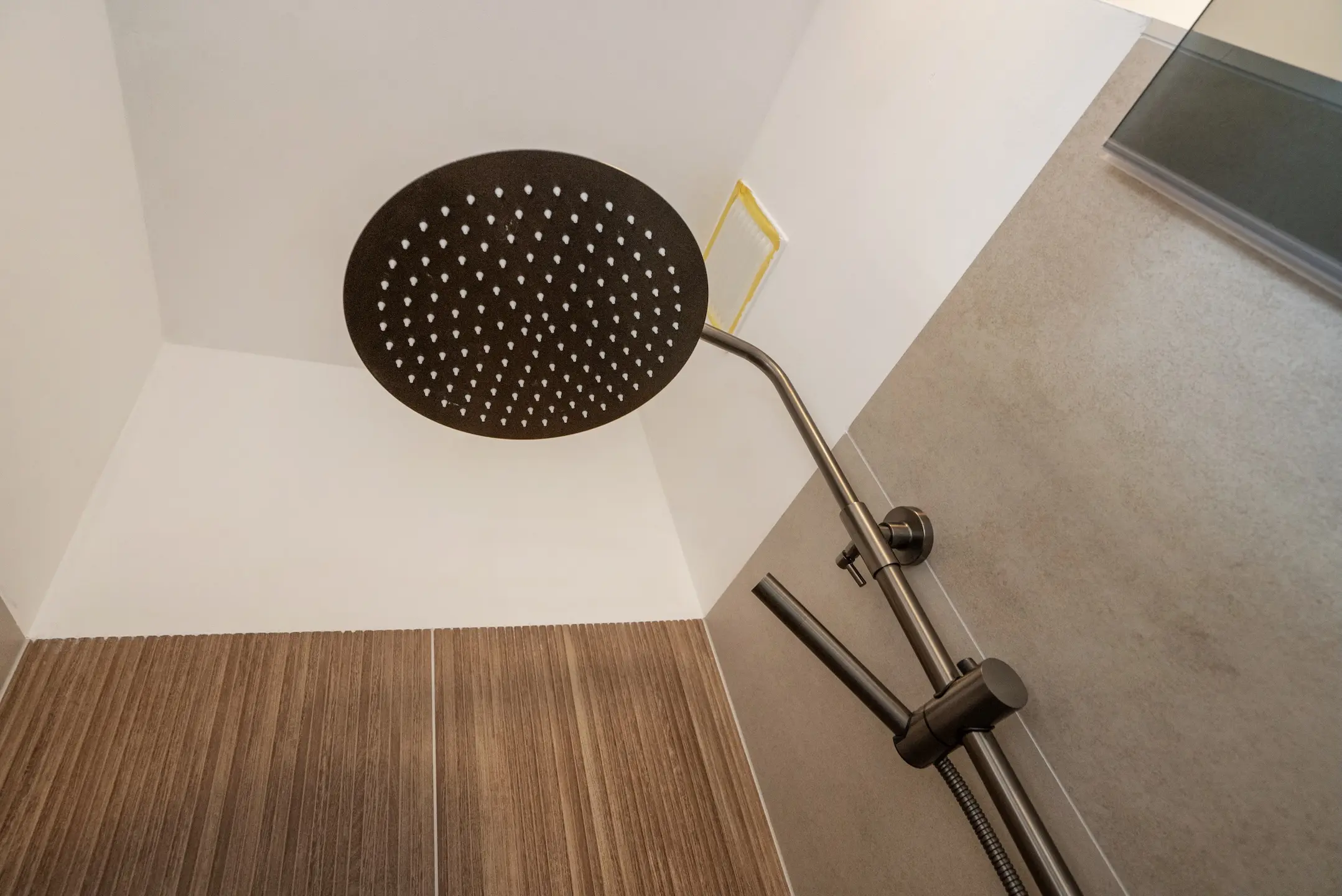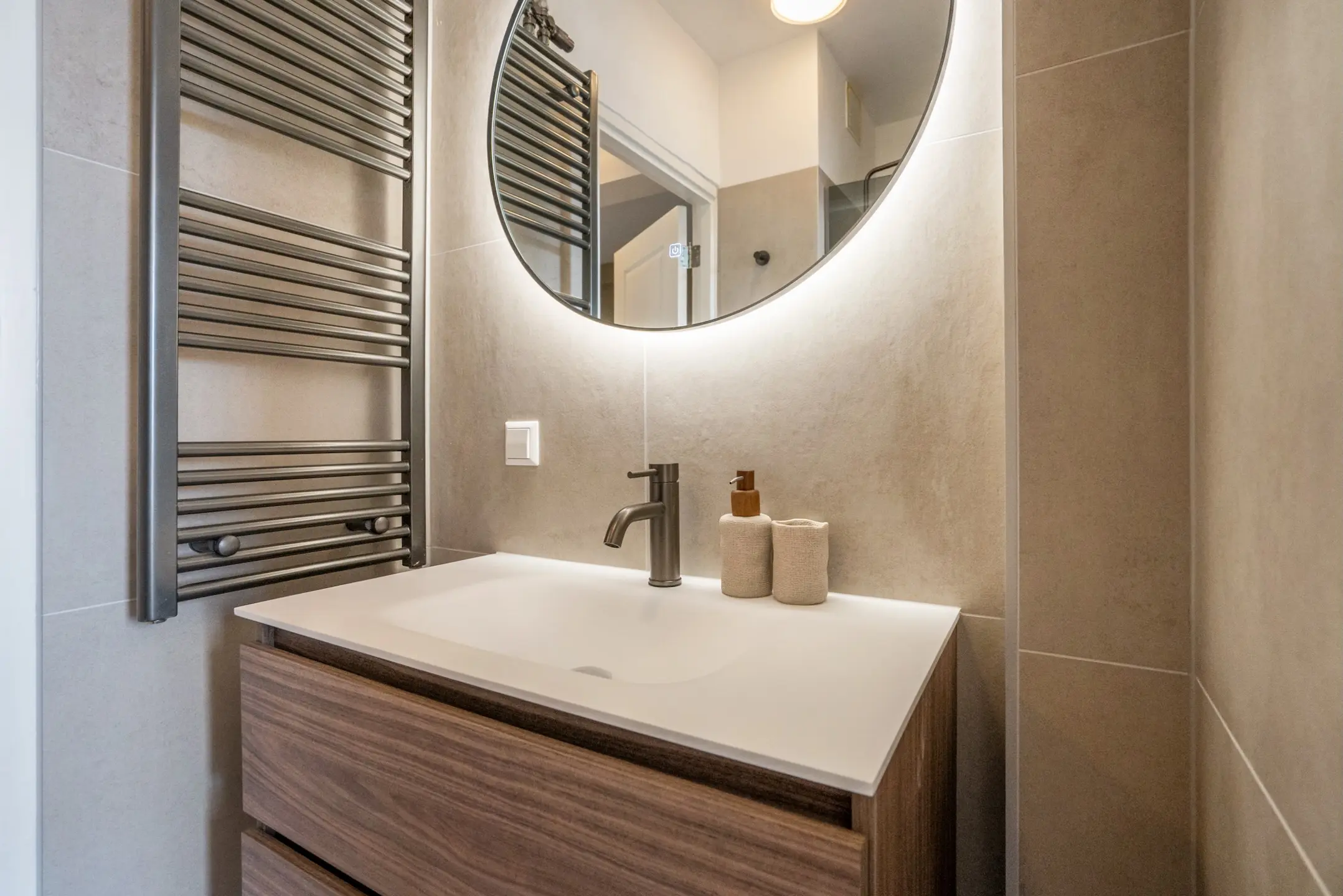 Badkamer: Luxe en volledig betegeld met een comfortabele inloopdouche voorzien van hand- en stortdouche, breed wastafelmeubel met kraan, designradiator en mechanische ventilatie.