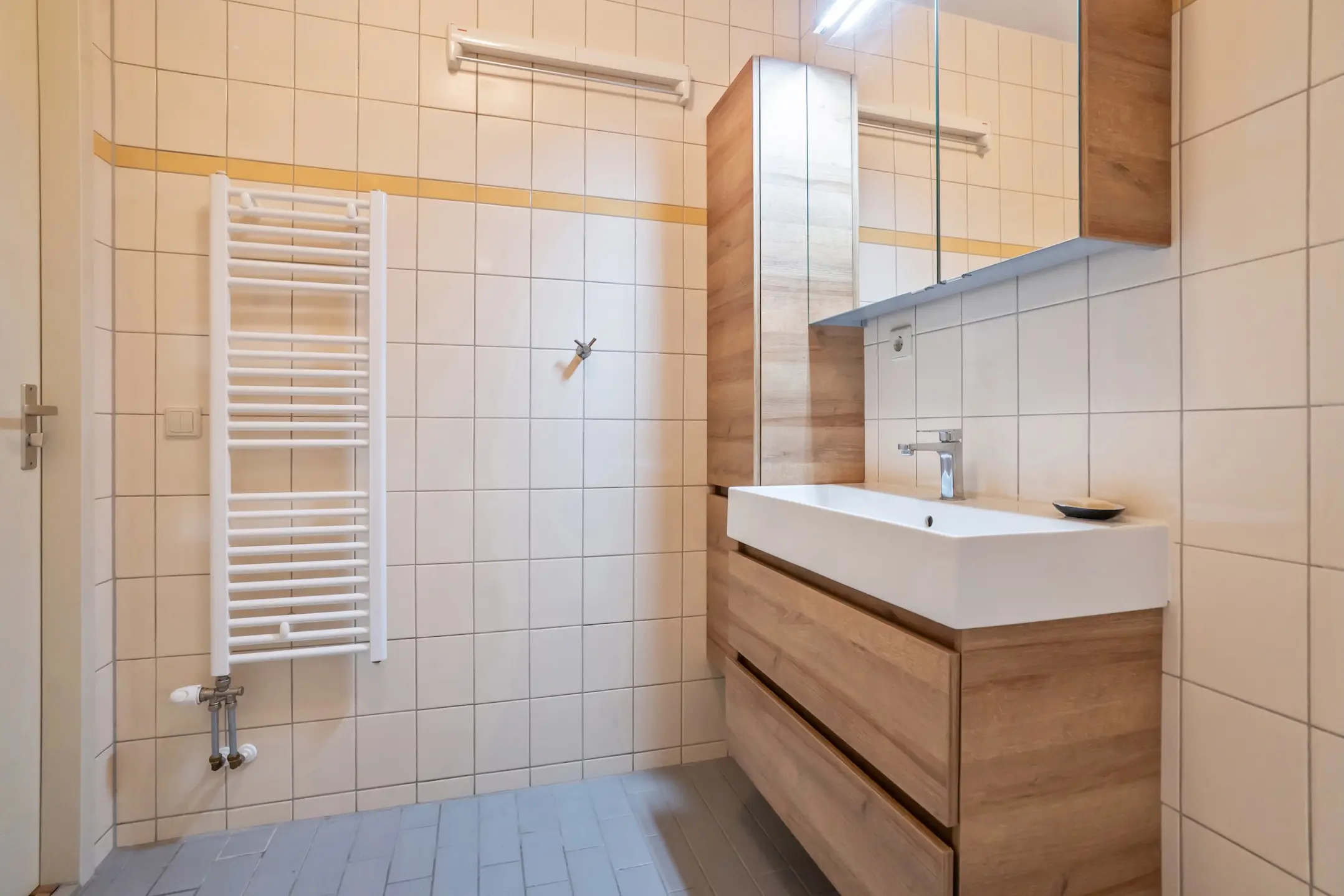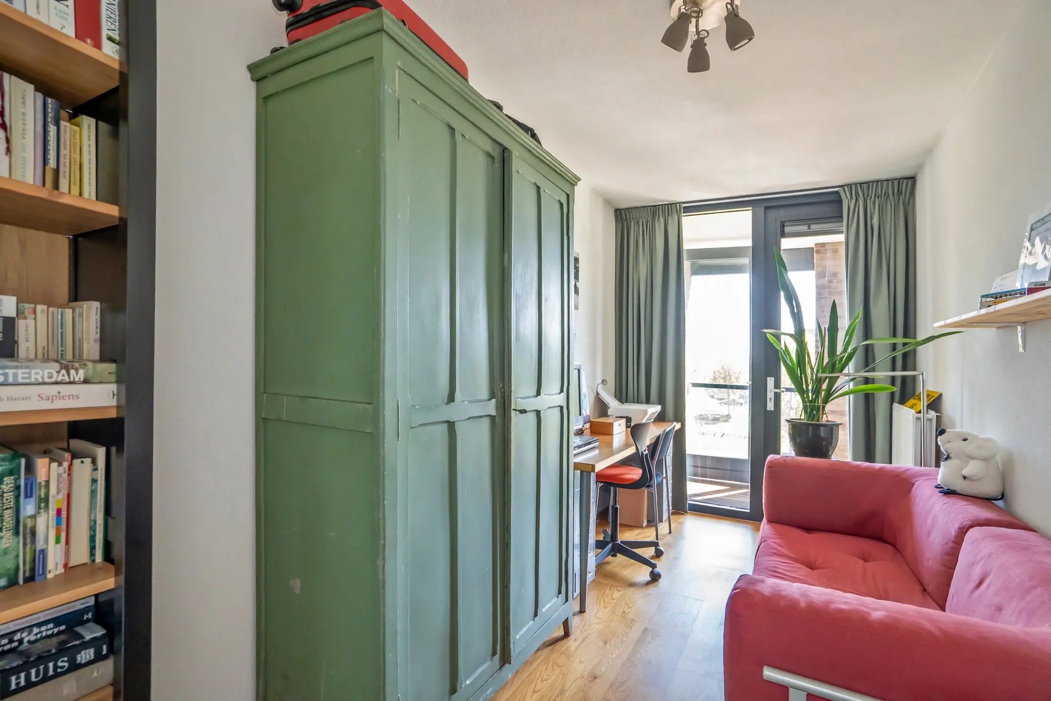 De ruime hoofdslaapkamer beschikt eveneens over toegang tot het balkon. De nette badkamer is volledig betegeld en voorzien van een douche, wastafelmeubel, designradiator en een aansluiting voor wasmachine en droger. De tweede slaapkamer is van goed formaat en eveneens geschikt als werk- of logeerkamer, met directe toegang tot het balkon. Daarnaast is er een praktische inpandige berging waar de mechanische ventilatie hangt. In de onderbouw bevindt zich een zeer ruime berging voorzien van legplanken.
