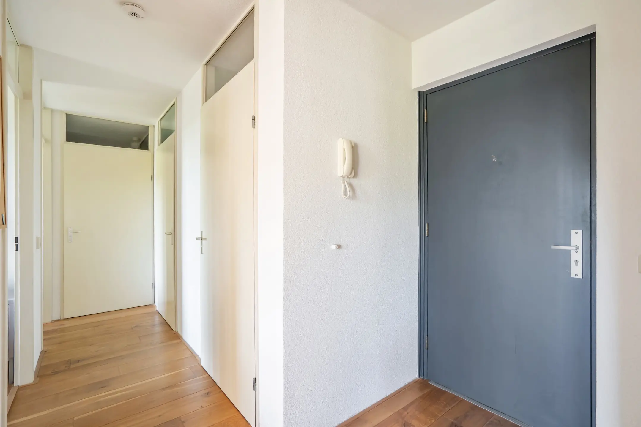 Afgesloten centrale entree met bellentableau en brievenbussen. Representatieve hal met lift en trap. Op de tweede verdieping bevindt zich de entree van het appartement. Binnenkomst in een ruime L-vormige hal met garderoberuimte en meterkast. Modern, volledig betegeld toilet met wandcloset en fontein. Sfeervol lichte woon-/eetkamer voorzien van grote raampartijen met zon reflecterende rolgordijnen en een keurige houten vloer. De open keuken is uitgevoerd in een praktische L-opstelling en voorzien van een natuurstenen aanrechtblad en diverse inbouwapparatuur, waaronder een koelkast, vriezer, combimagnetron en een inductiekookplaat. Vanuit de woonkamer is er toegang tot het zonnige balkon op het zuidoosten, waar u in alle rust kunt genieten van het vrije uitzicht.