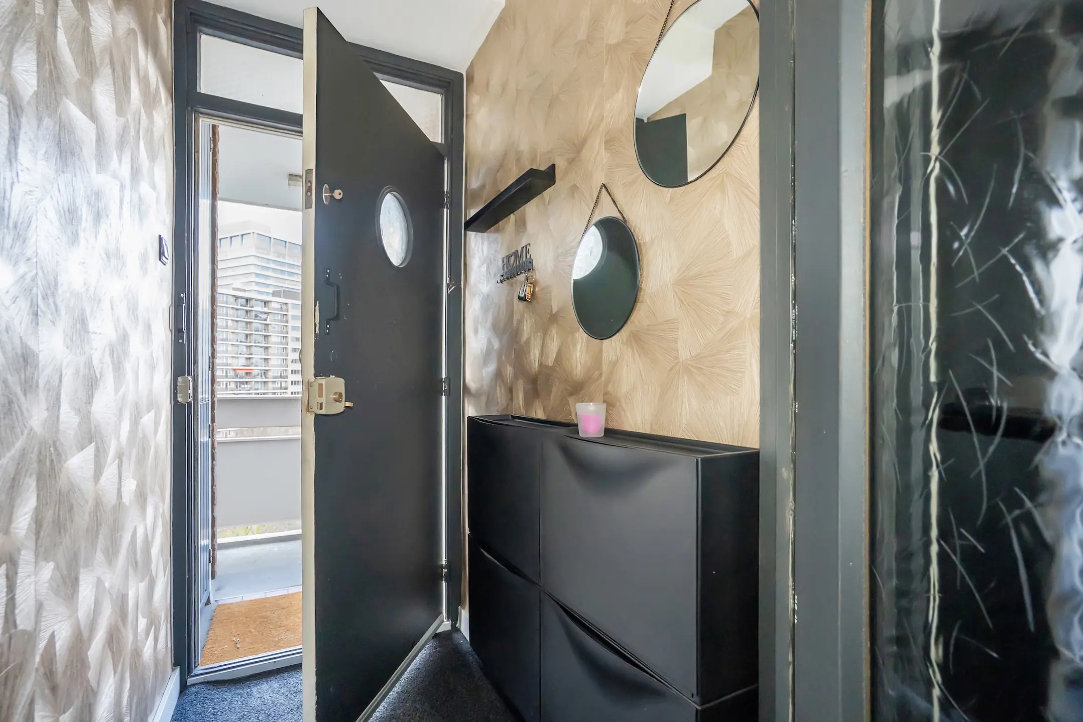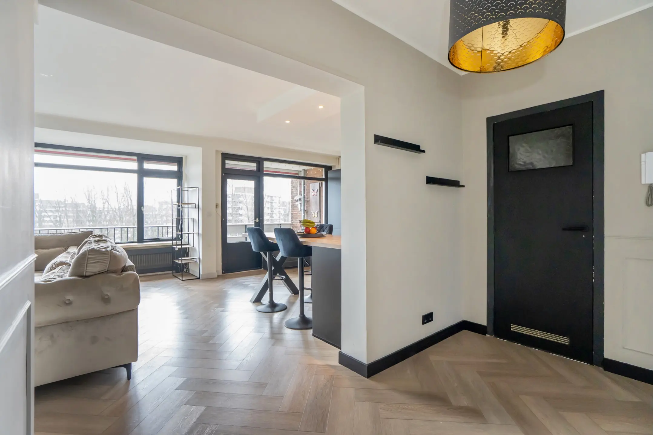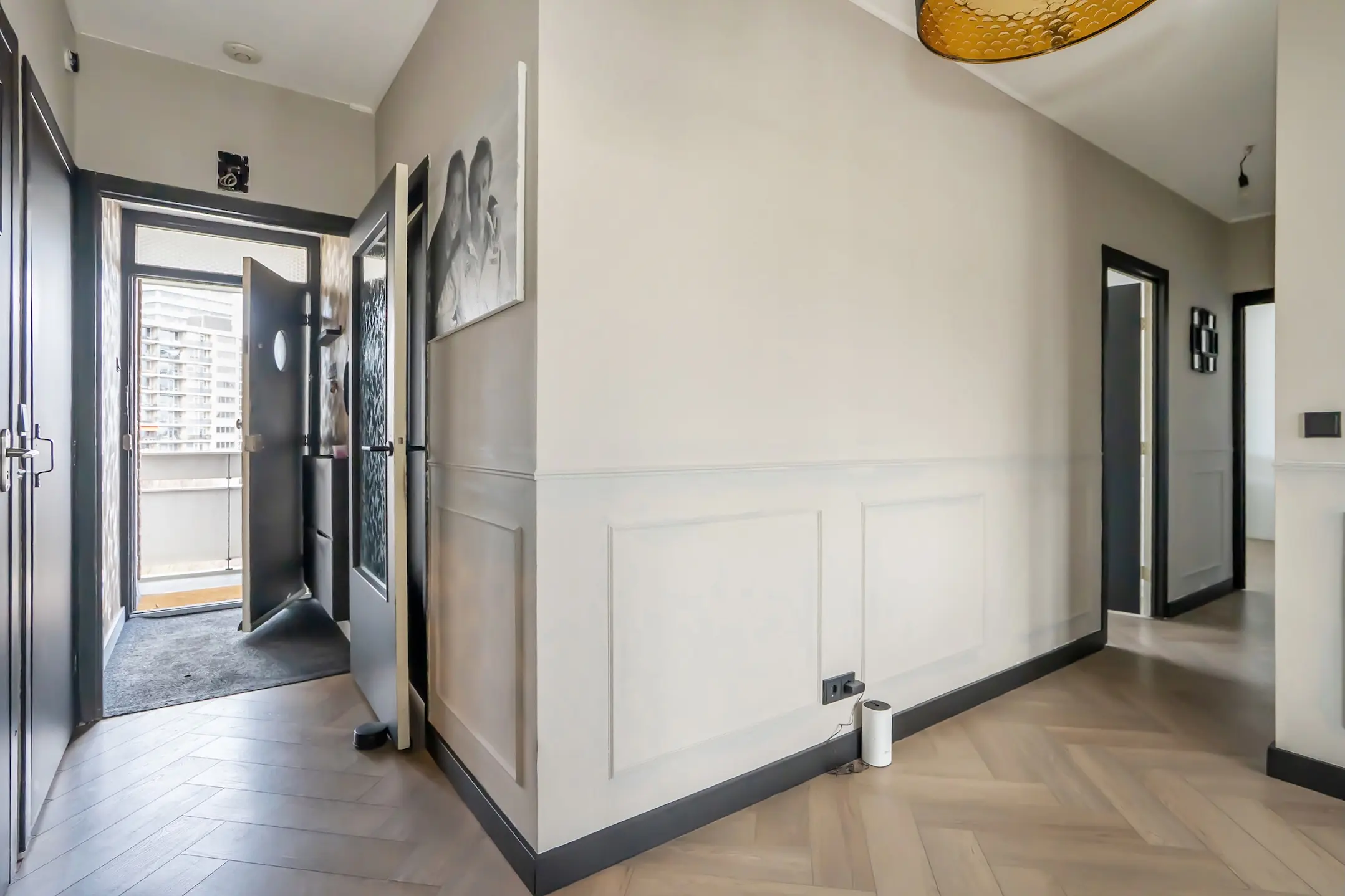Afgesloten hoofdentree met brievenbussen, bellentableau en camera's, liften en trappenhuis, toegang tot de woning op de 6e verdieping, tochthalletje, ruime hal in open verbinding met de doorgebroken woon-/eetkamer (oorspronkelijk 2 kamers) met open woonkeuken. Door de royale maatvoering veel inrichtingsmogelijkheden. Deur naar het balkon op het zuiden, zeembalkon en twee zonneschermen.