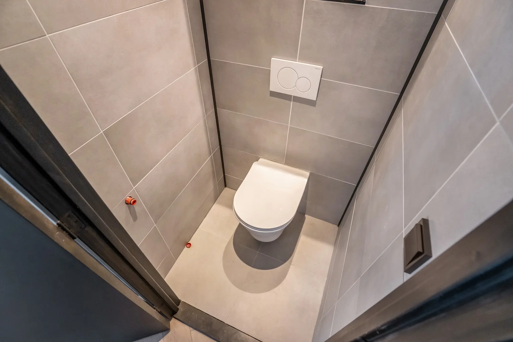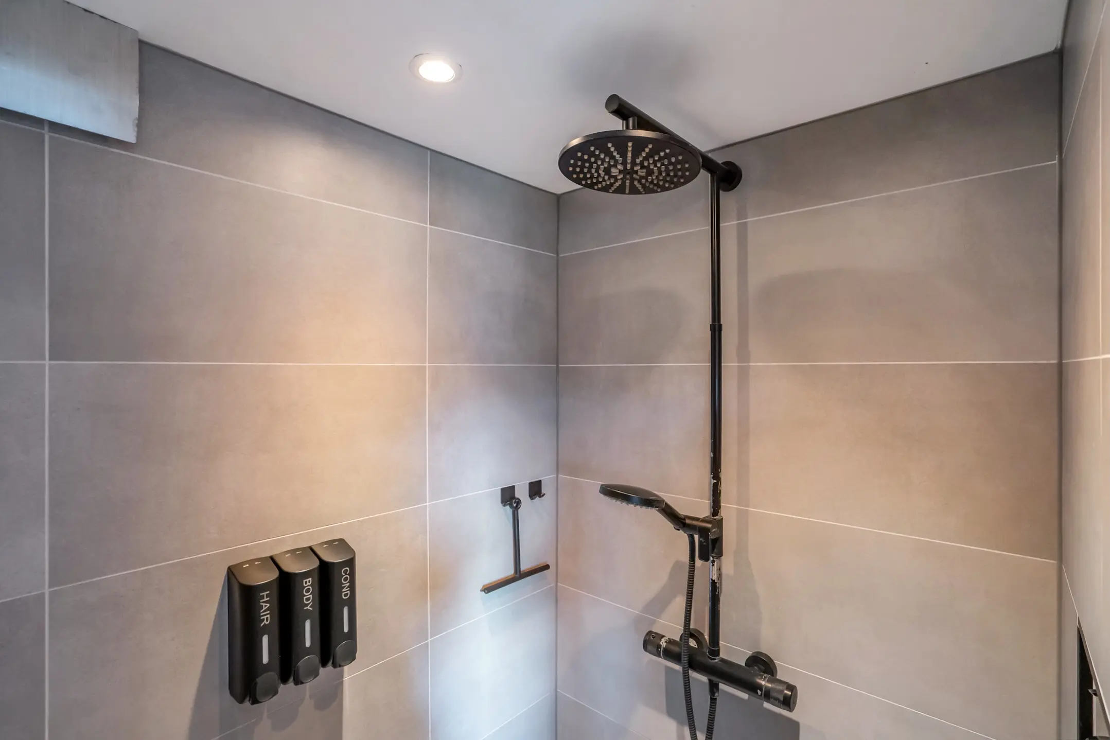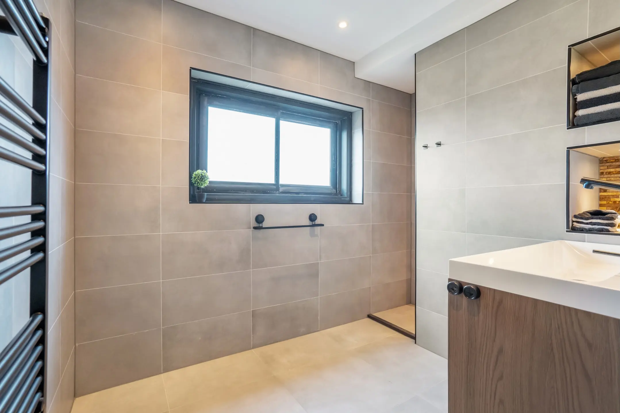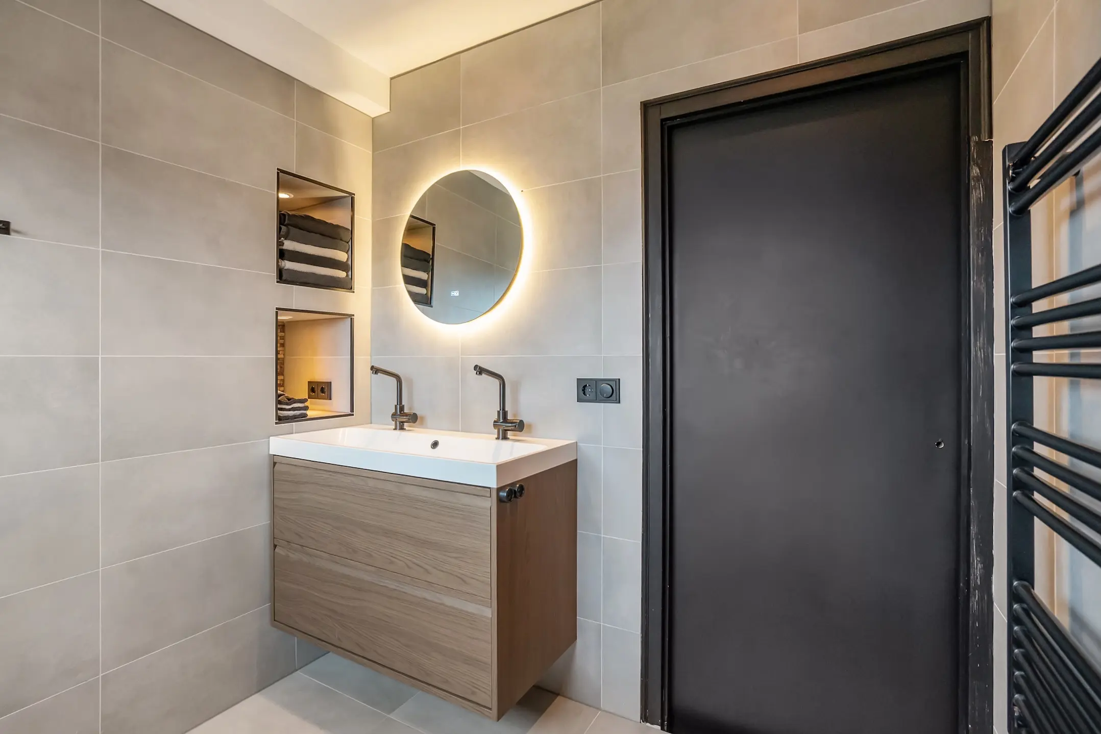 Luxueus, lichtgrijs uitgevoerde badkamer (2022) met een groot zijraam, een royale inloopdouche en een dubbel wastafelmeubel in houtlook met een ronde spiegel. Ook hier een eigentijdse look door fraaie zwarte kranen en accessoires. Separaat in dezelfde stijl uitgevoerd toilet met wancloset.