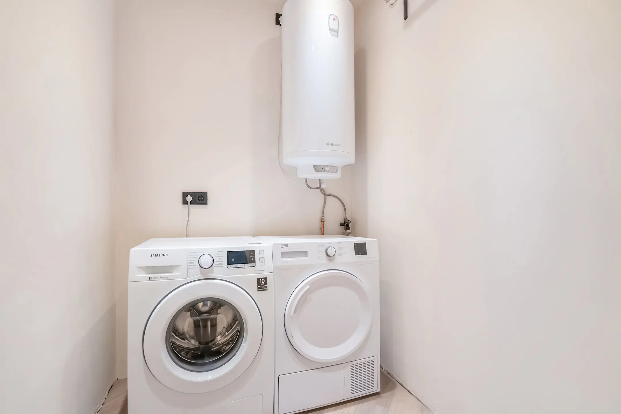 Ruime waskamer met de opstelplaats van de elektrische boiler alsmede de wasmachine en wasdroger.