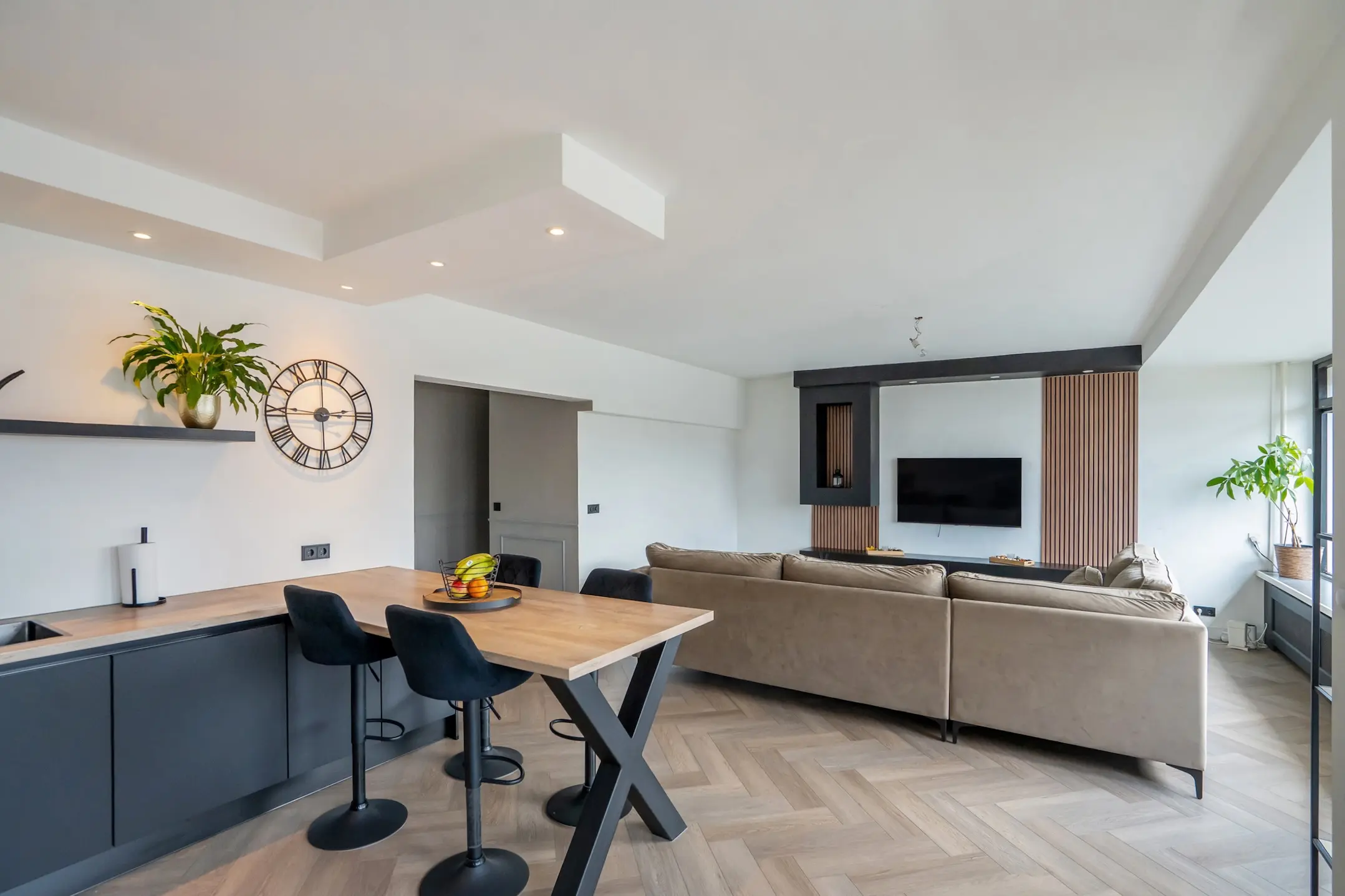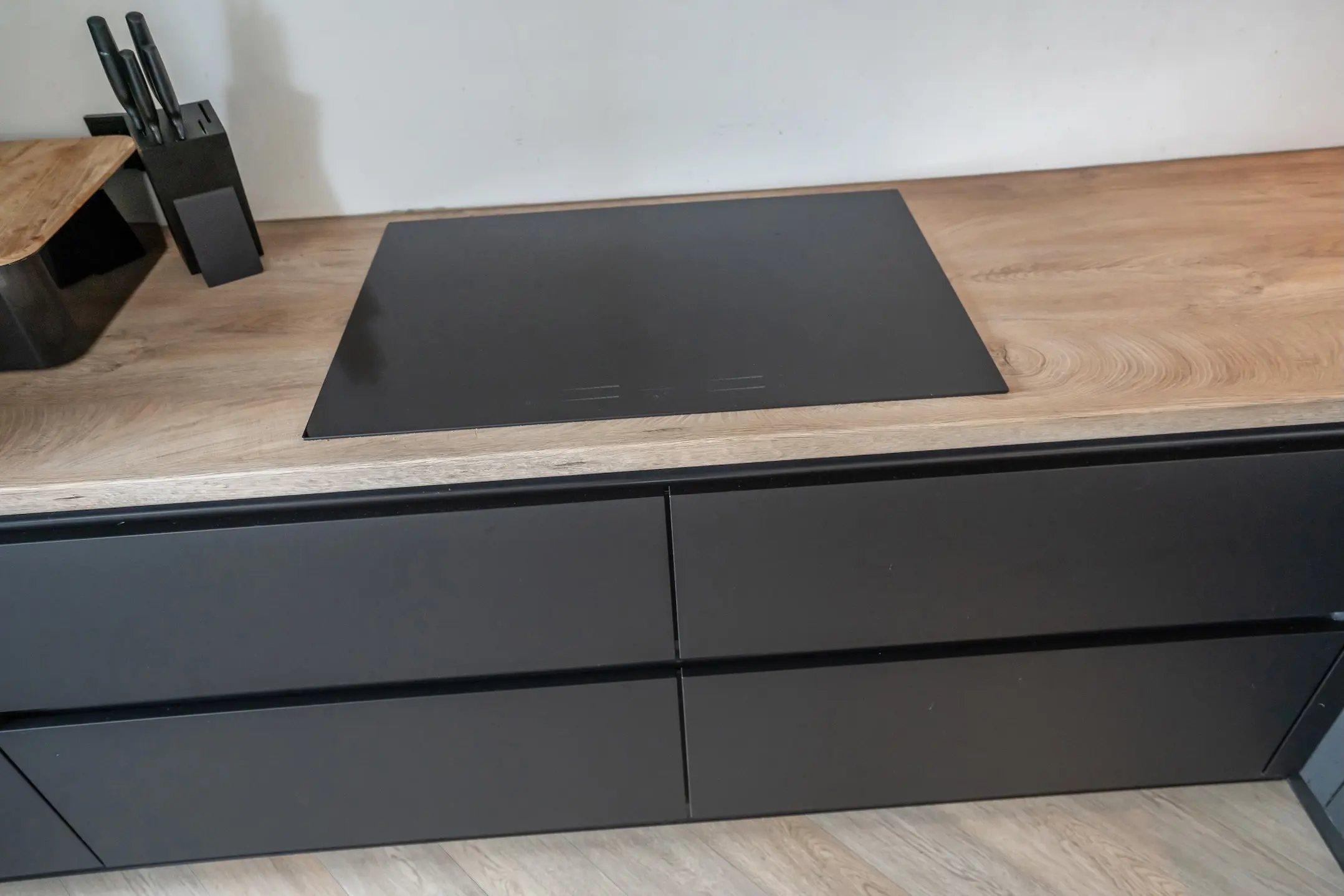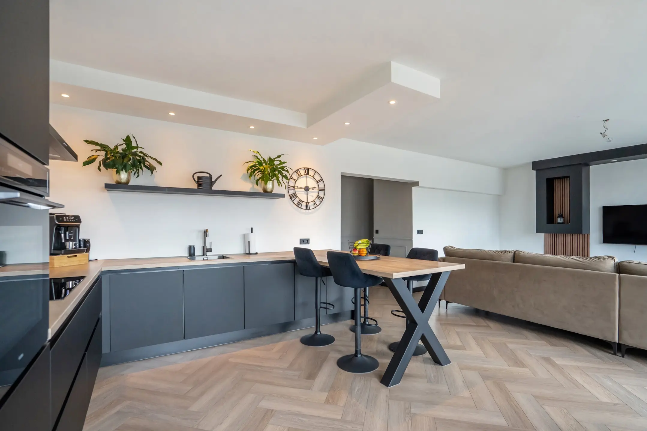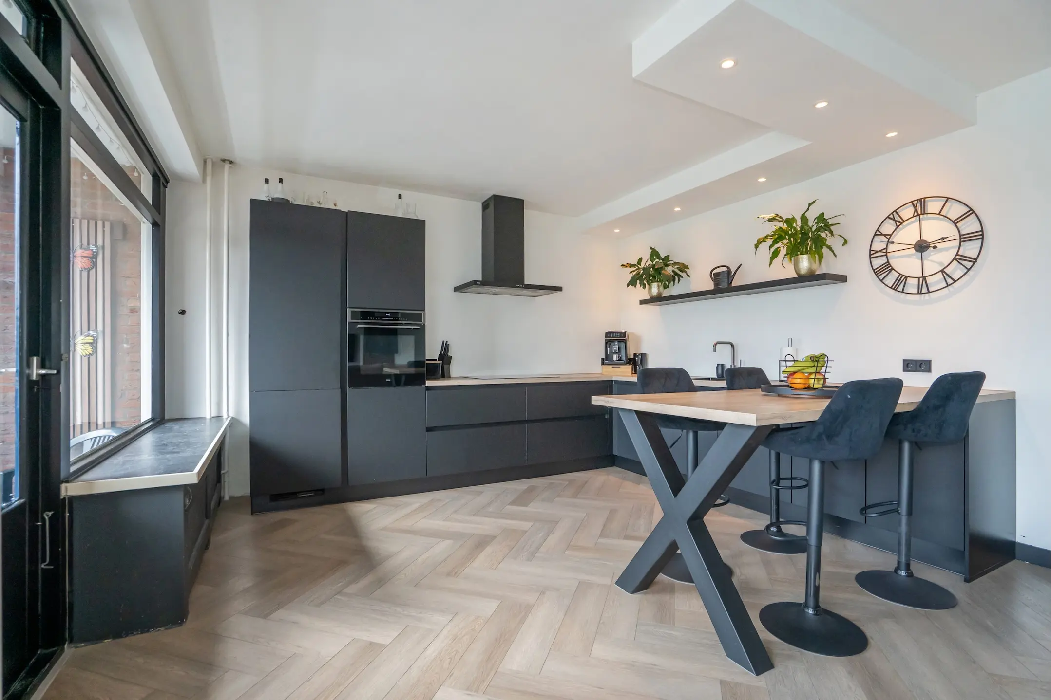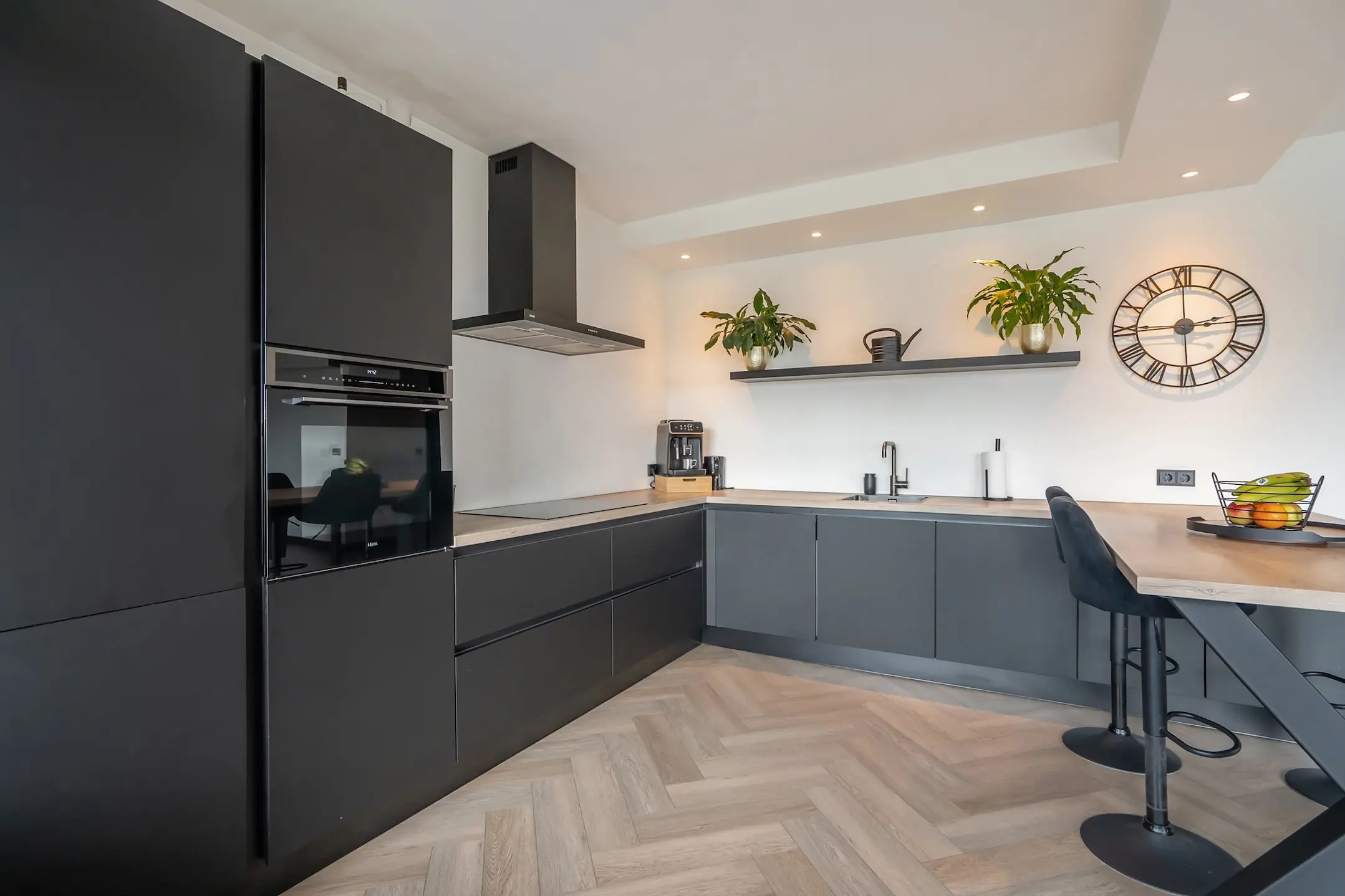 De keuken in in 2022 vernieuwd (in zwart uitgevoerd met houtkleurig werkblad) en is in een U-vorm opgesteld met een aangrenzende eettafel/breakfast bar. Veel kast- en werkruimte, geïntegreerde koelkast/vriezer, inductie kookplaat, afzuigkap, combi magnetron en vaatwasser. Door de zwarte accessoires is deze keuken helemaal af!