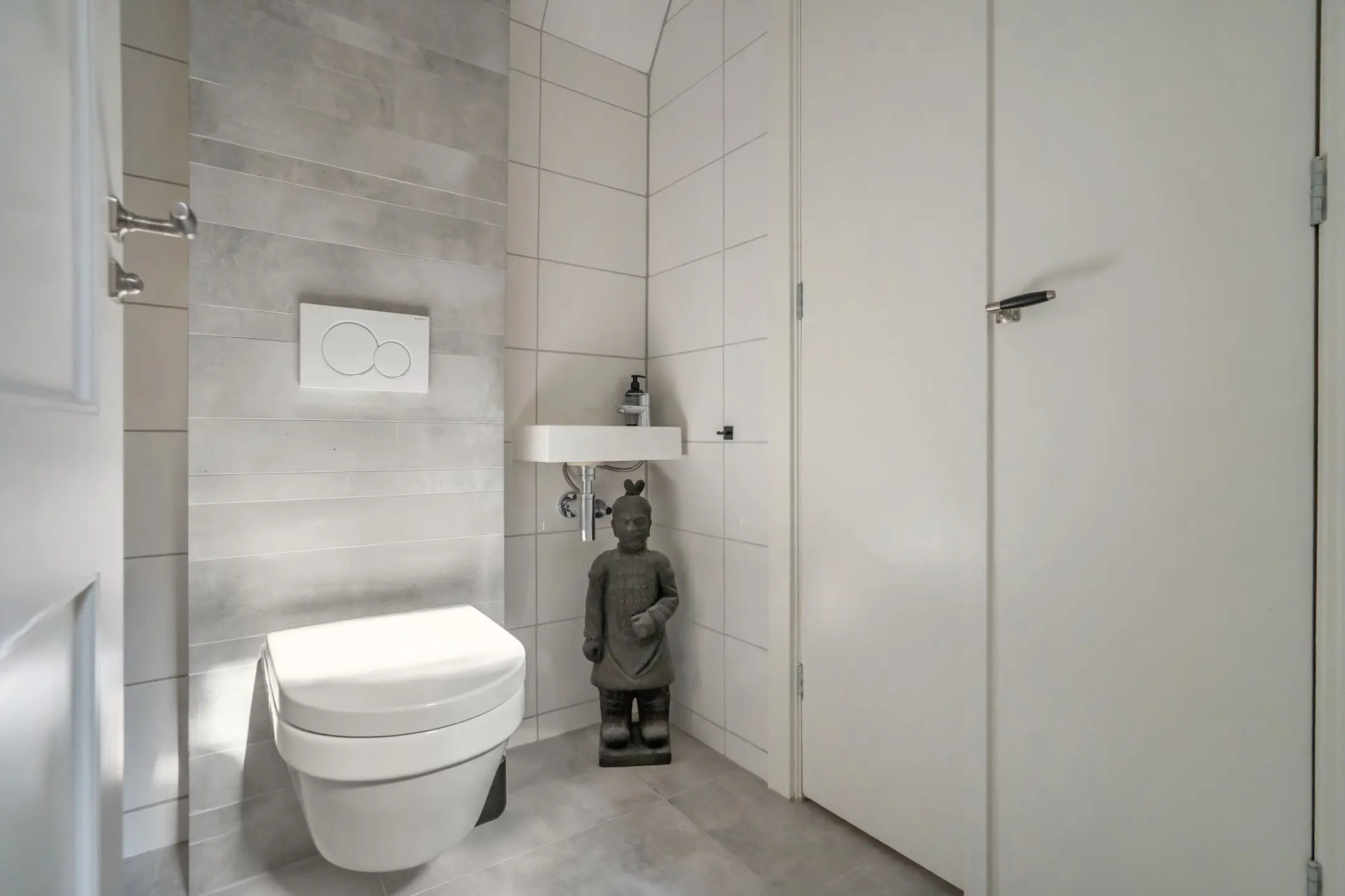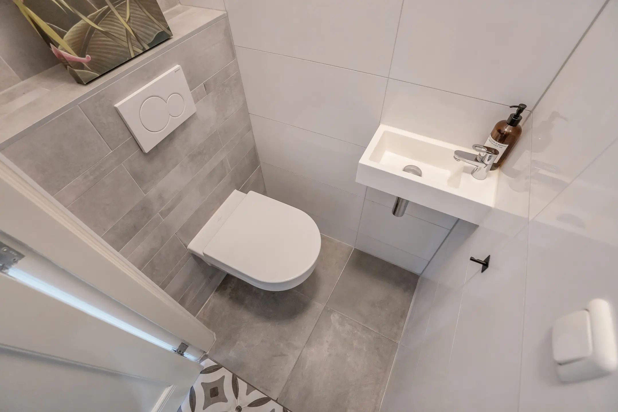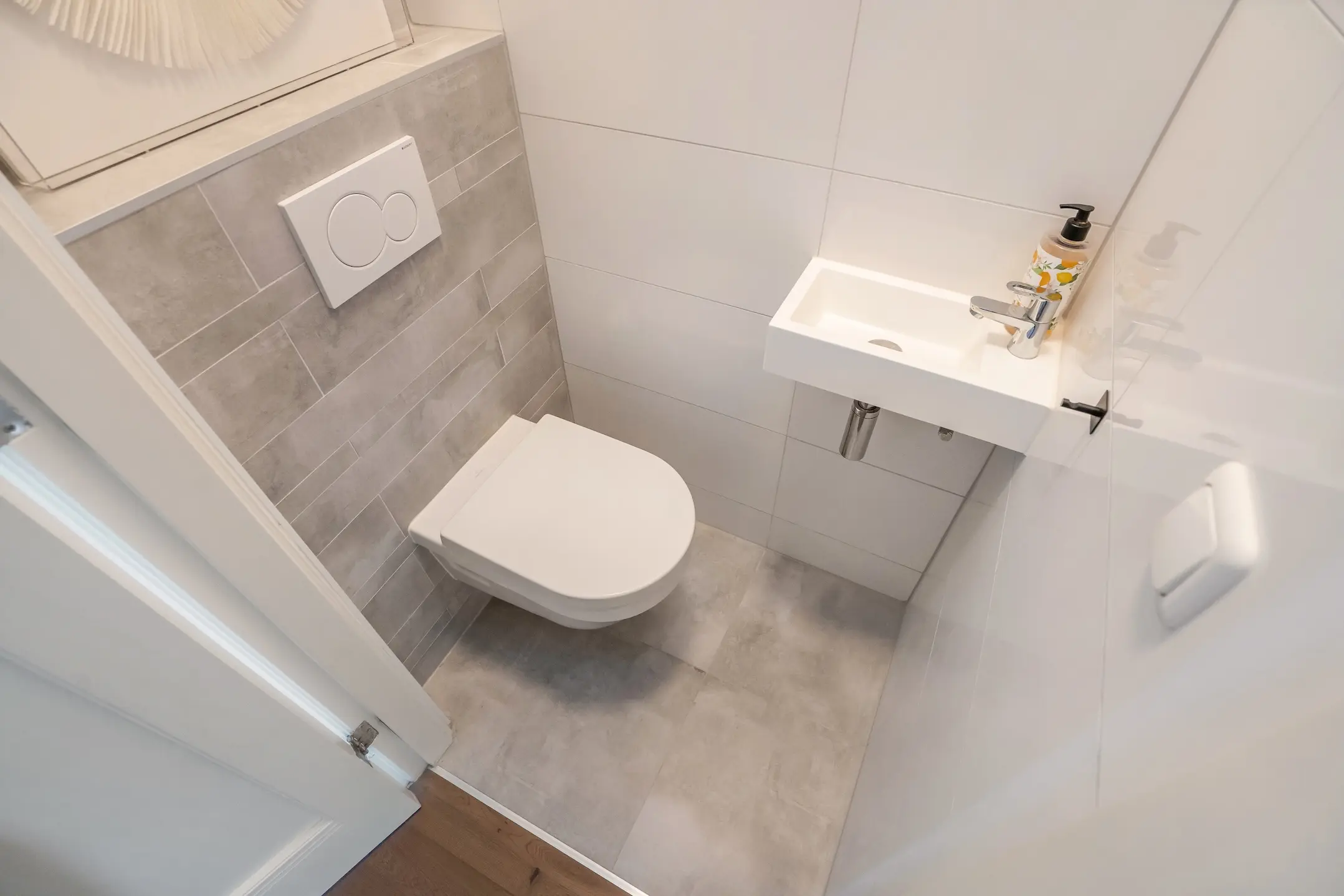 Separaat modern toilet voorzien van wandcloset en een fonteintje.