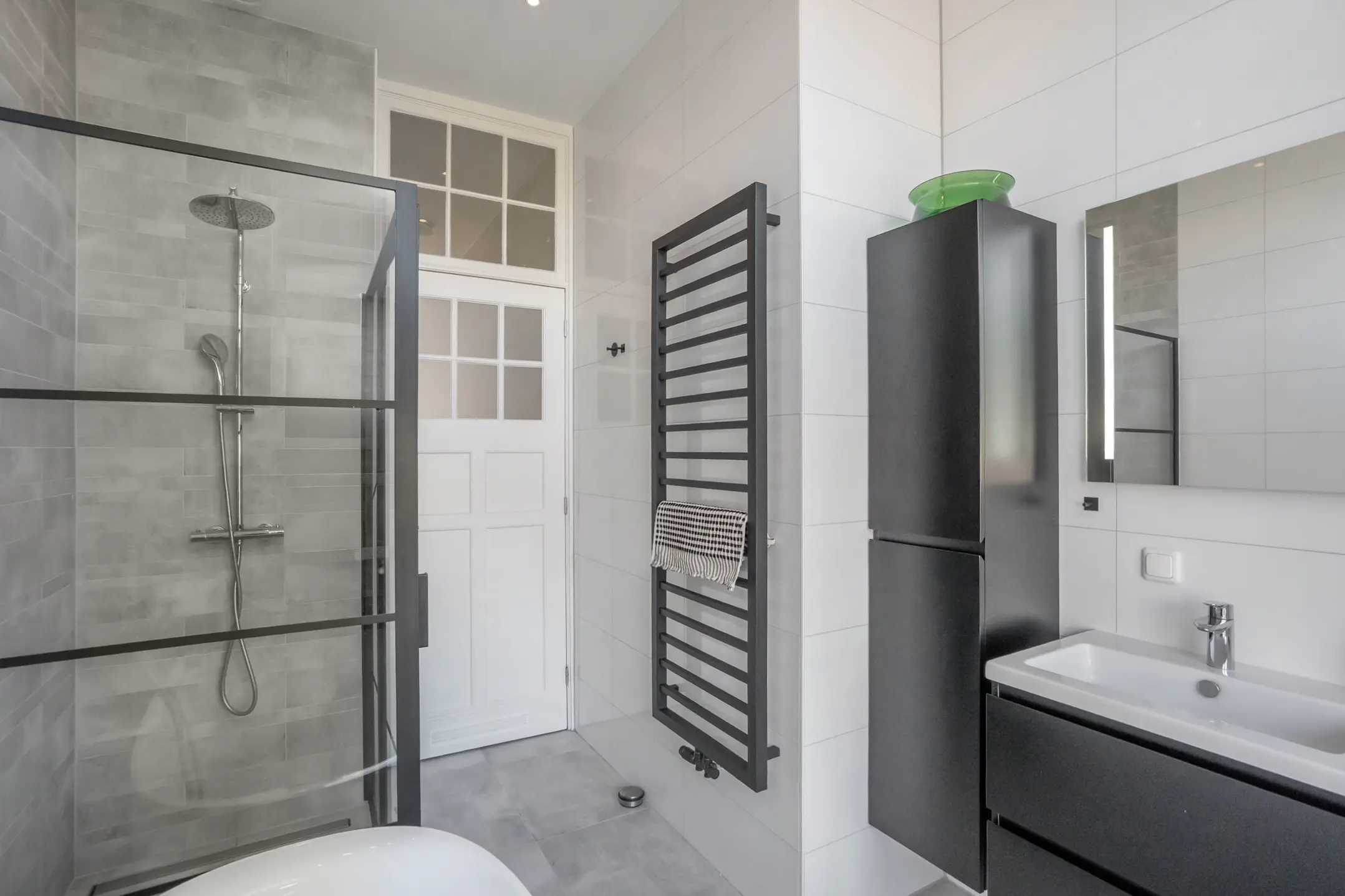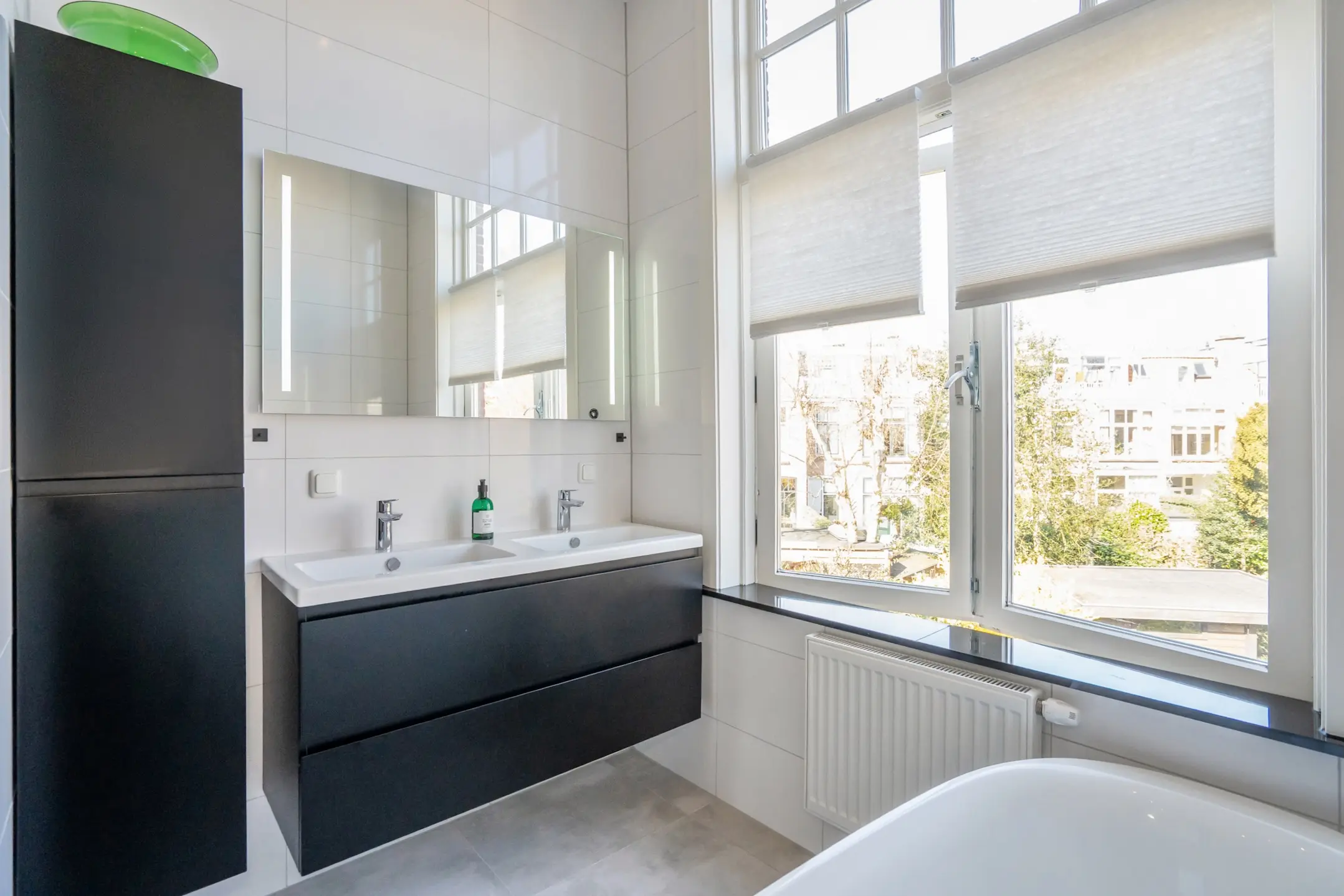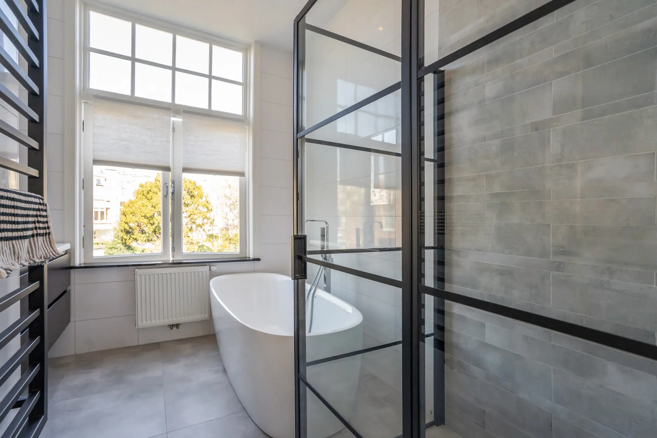 Side room with built-in closet. Beautifully finished bathroom with a freestanding bathtub, a spacious industrial-style walk-in shower with a rain shower, and a double washbasin unit. A large window provides plenty of natural light.