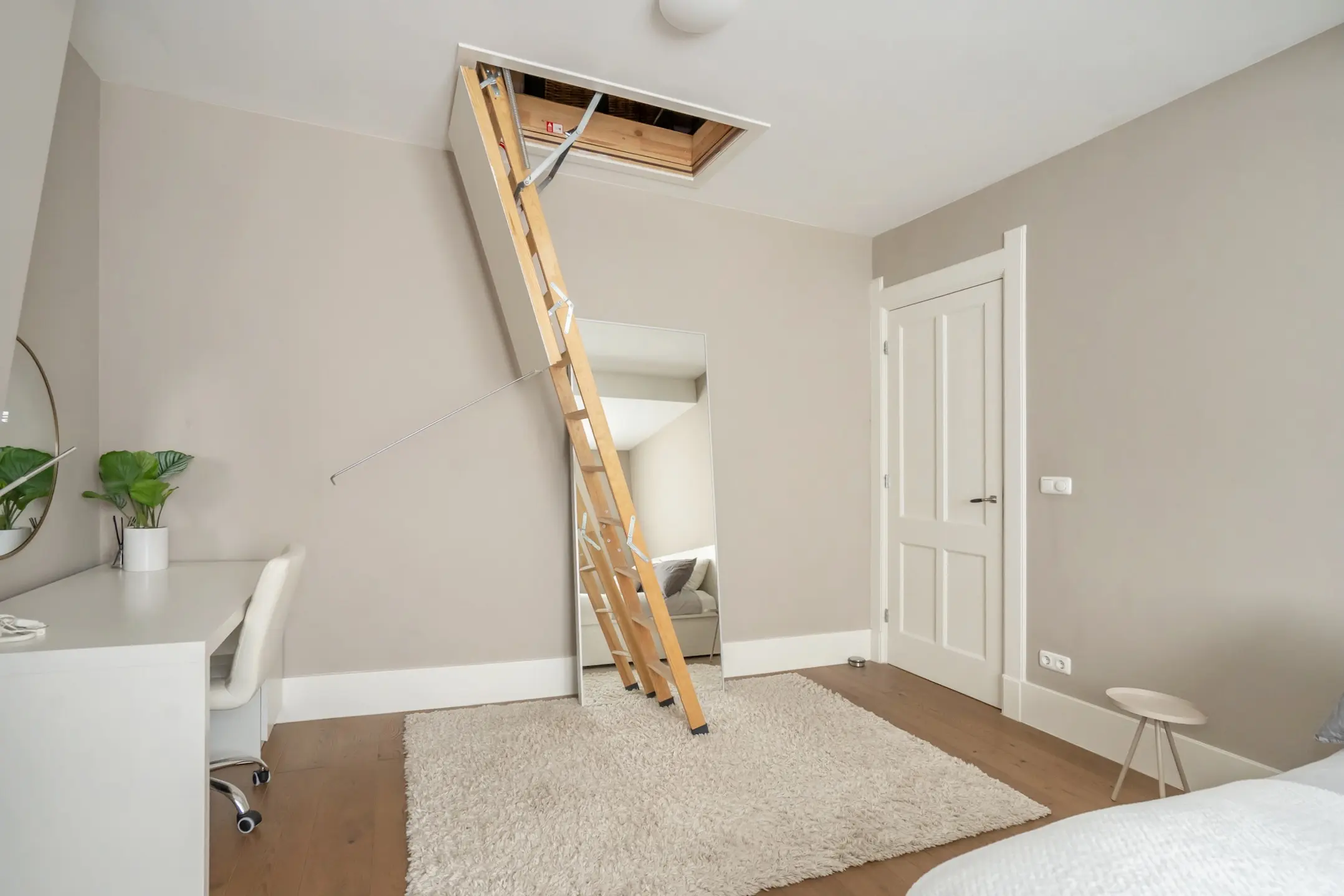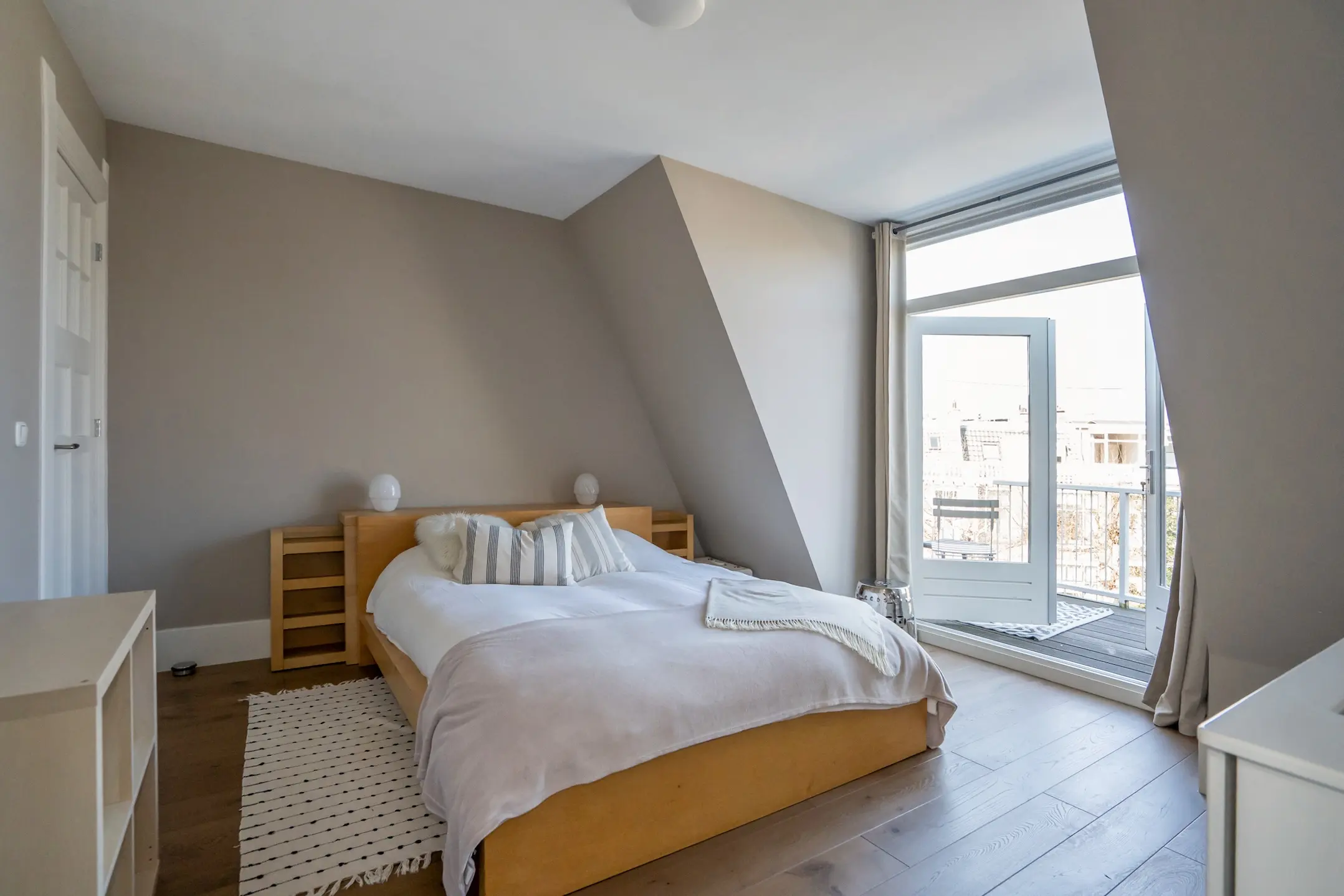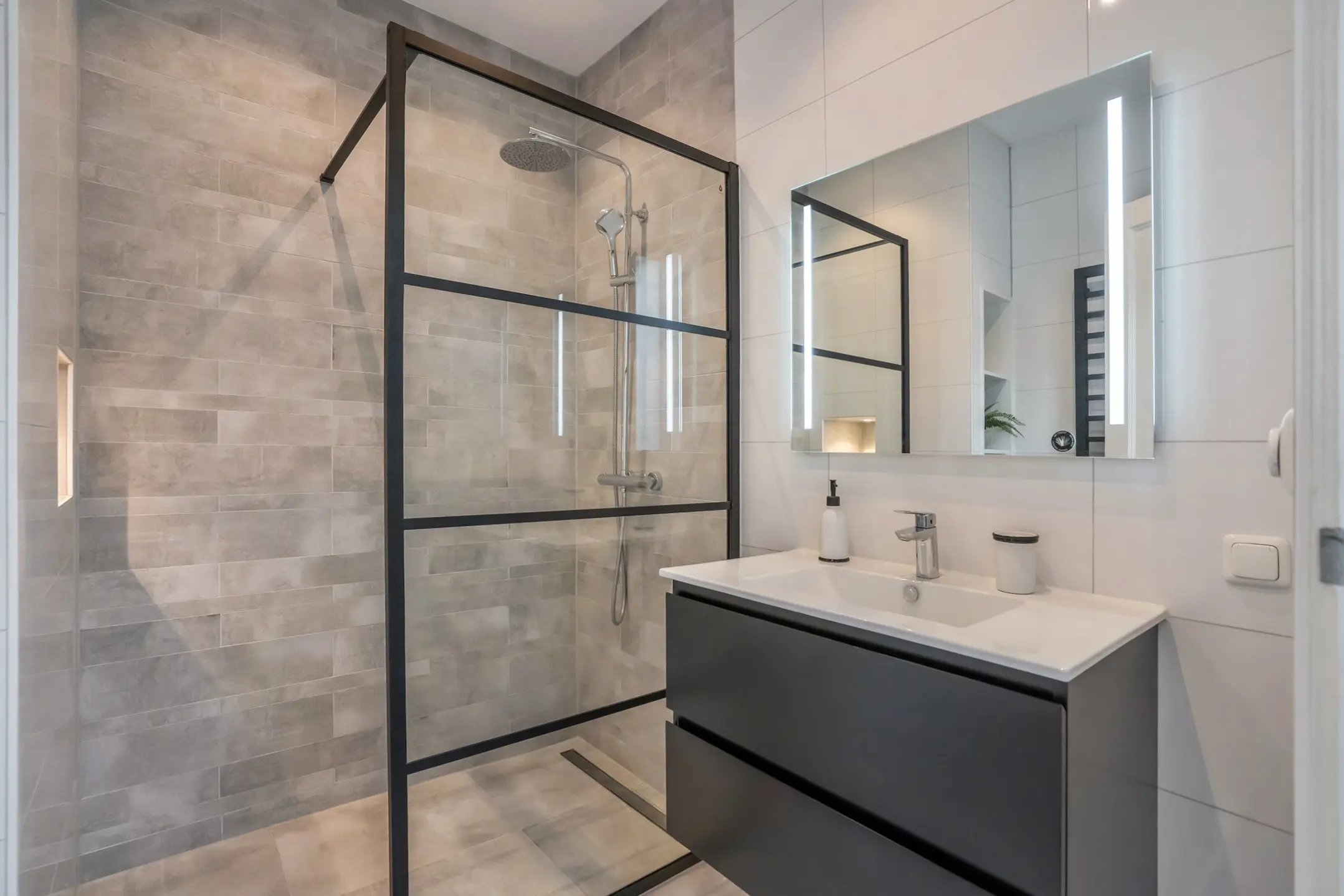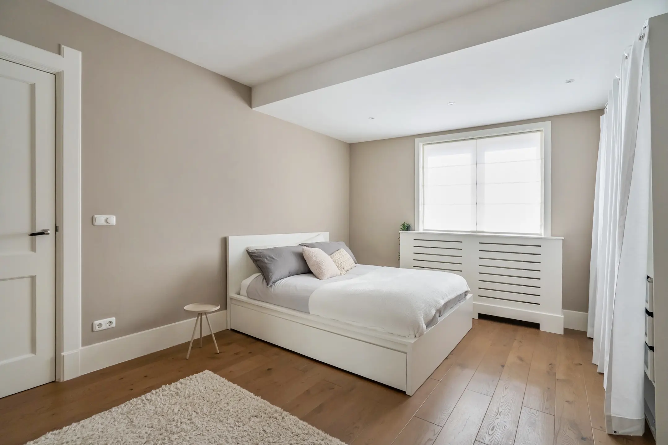 Side room with built-in closet. Beautifully finished bathroom with a freestanding bathtub, a spacious industrial-style walk-in shower with a rain shower, and a double washbasin unit. A large window provides plenty of natural light.