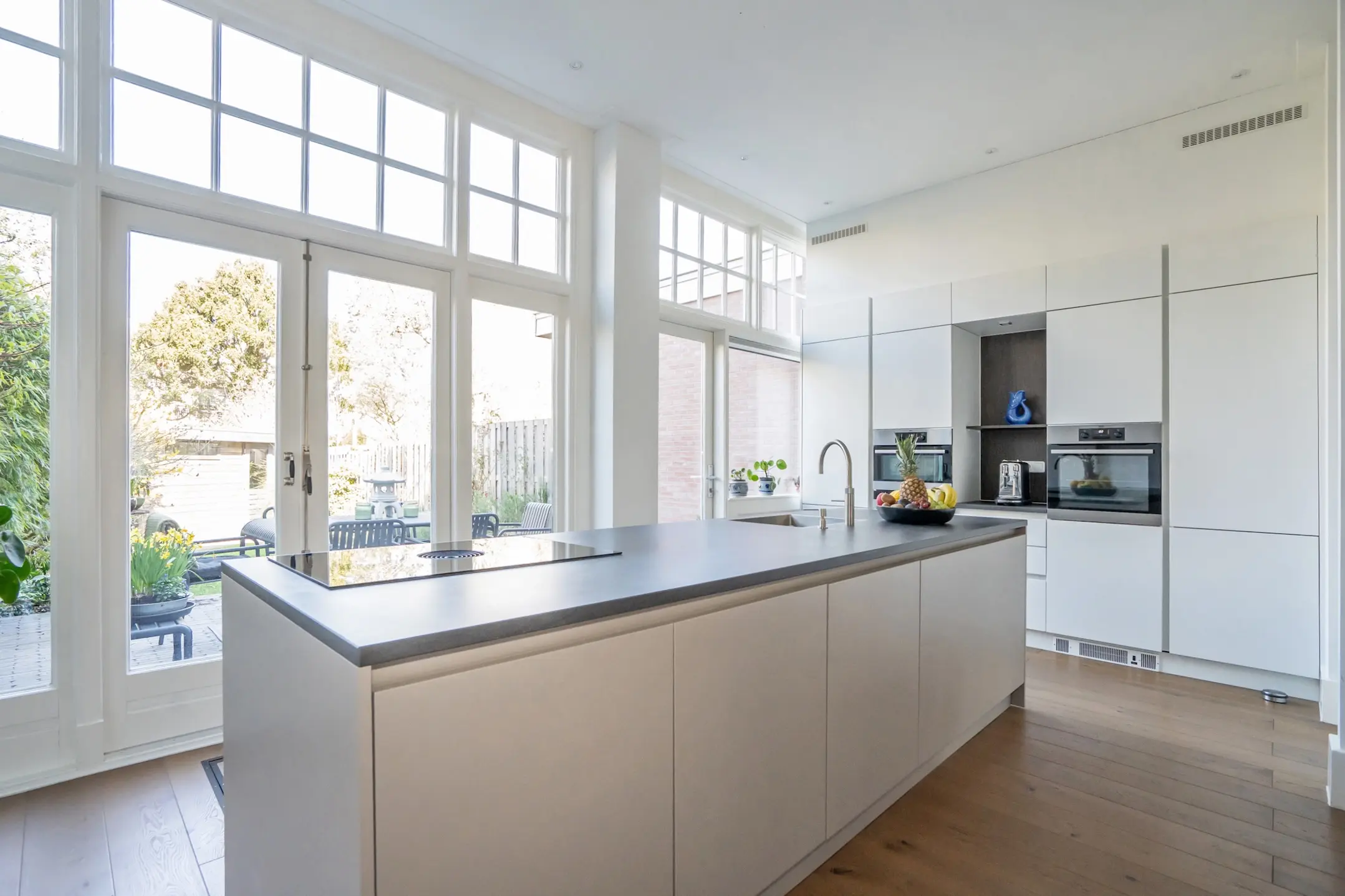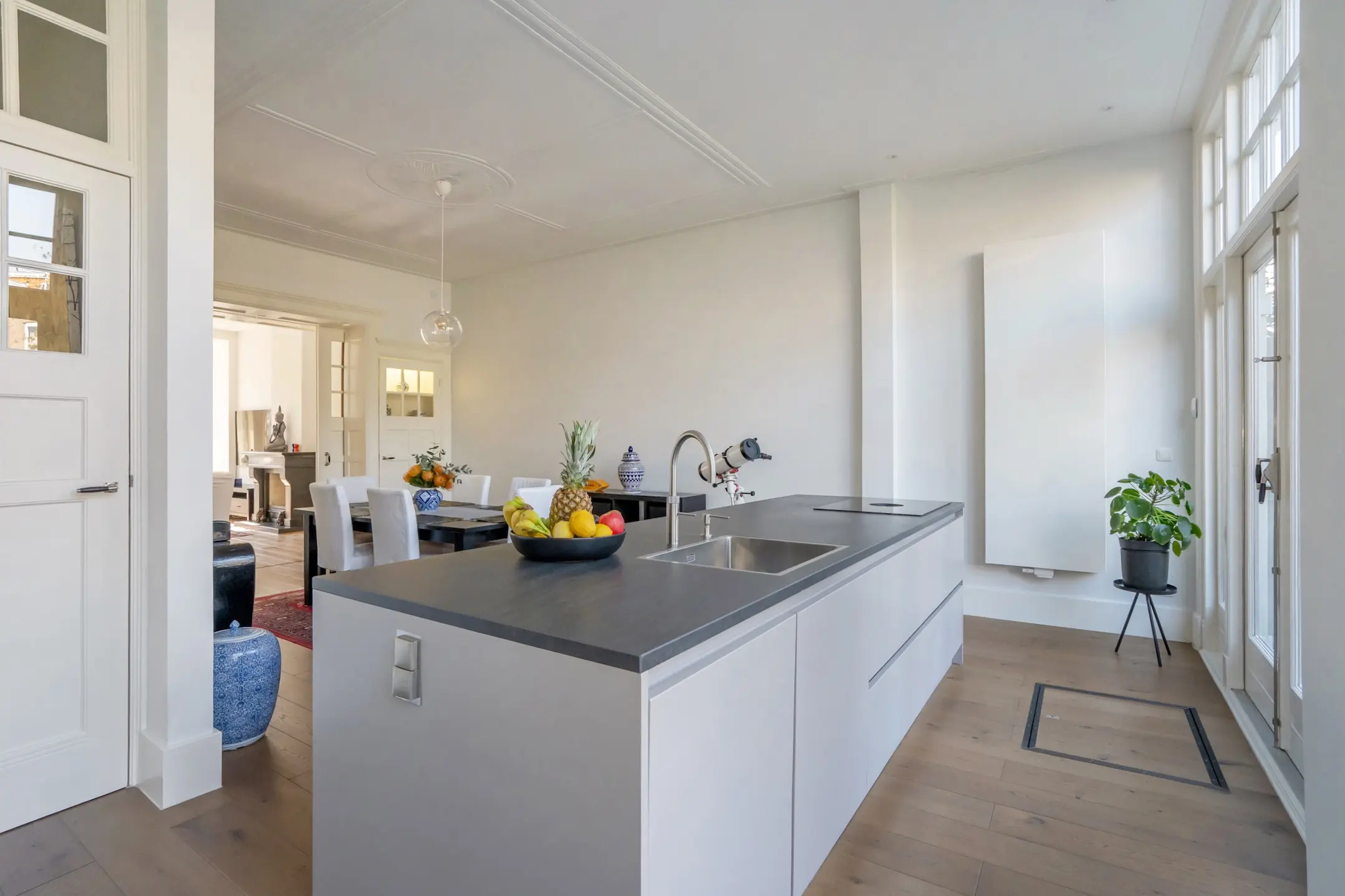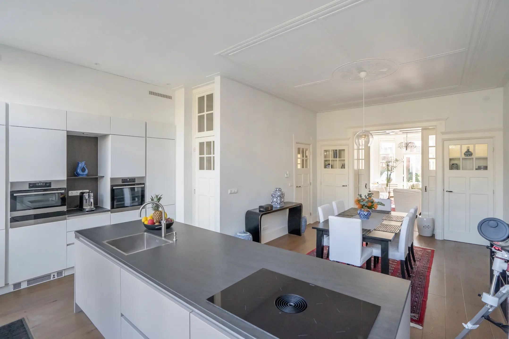 Ground floor: front garden with decorative fencing, entrance to the house, vestibule with draft door, spacious reception hall with a large built-in closet and a renovated toilet with a wall-mounted toilet and small sink. A truly stunning en-suite living room with sliding separation doors and four built-in cupboards, high ceilings with decorative moldings, built-in wardrobe in the front room, double doors to the front garden, and at the rear a contemporary kitchen with a large cooking/prep island equipped with a Quooker, dishwasher, Bora induction hob with integrated extraction, as well as an appliance wall with a fridge-freezer combination, combi oven/microwave, and a separate convection oven. Plenty of cupboard and workspace.