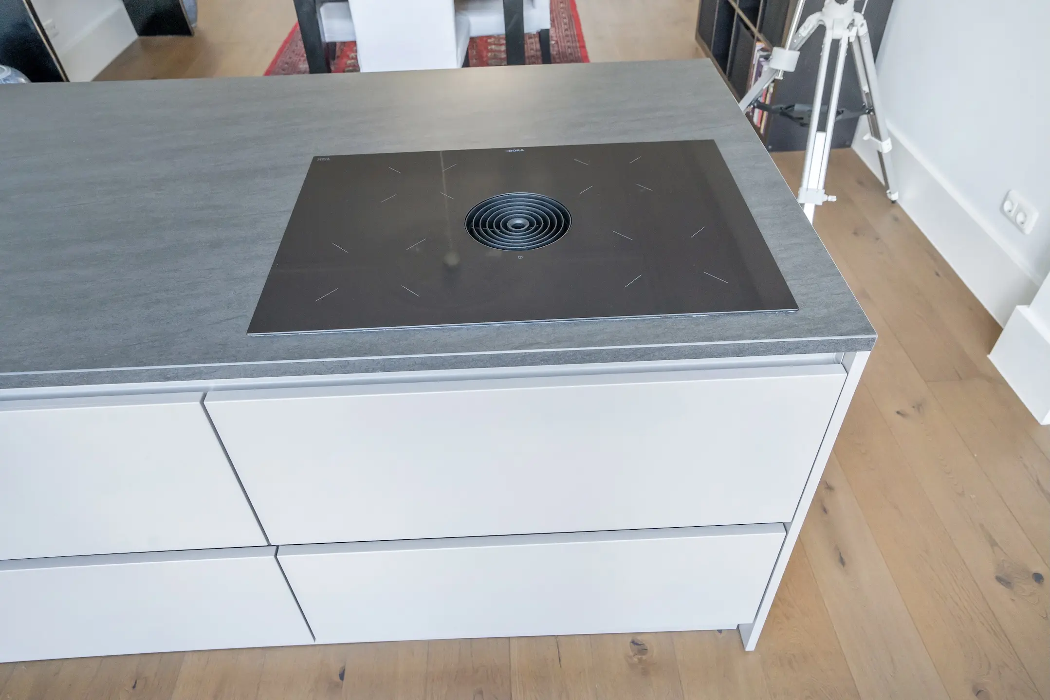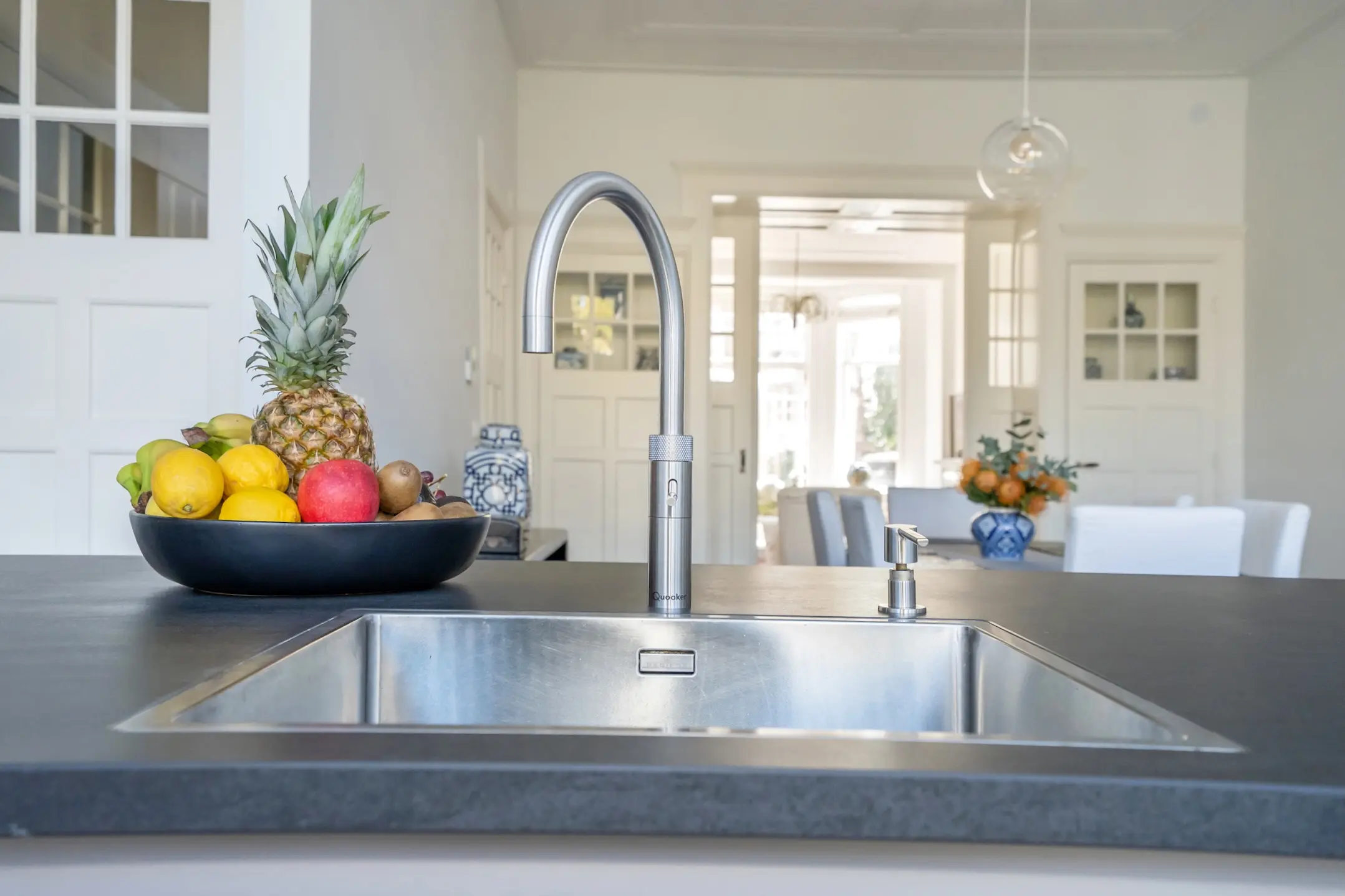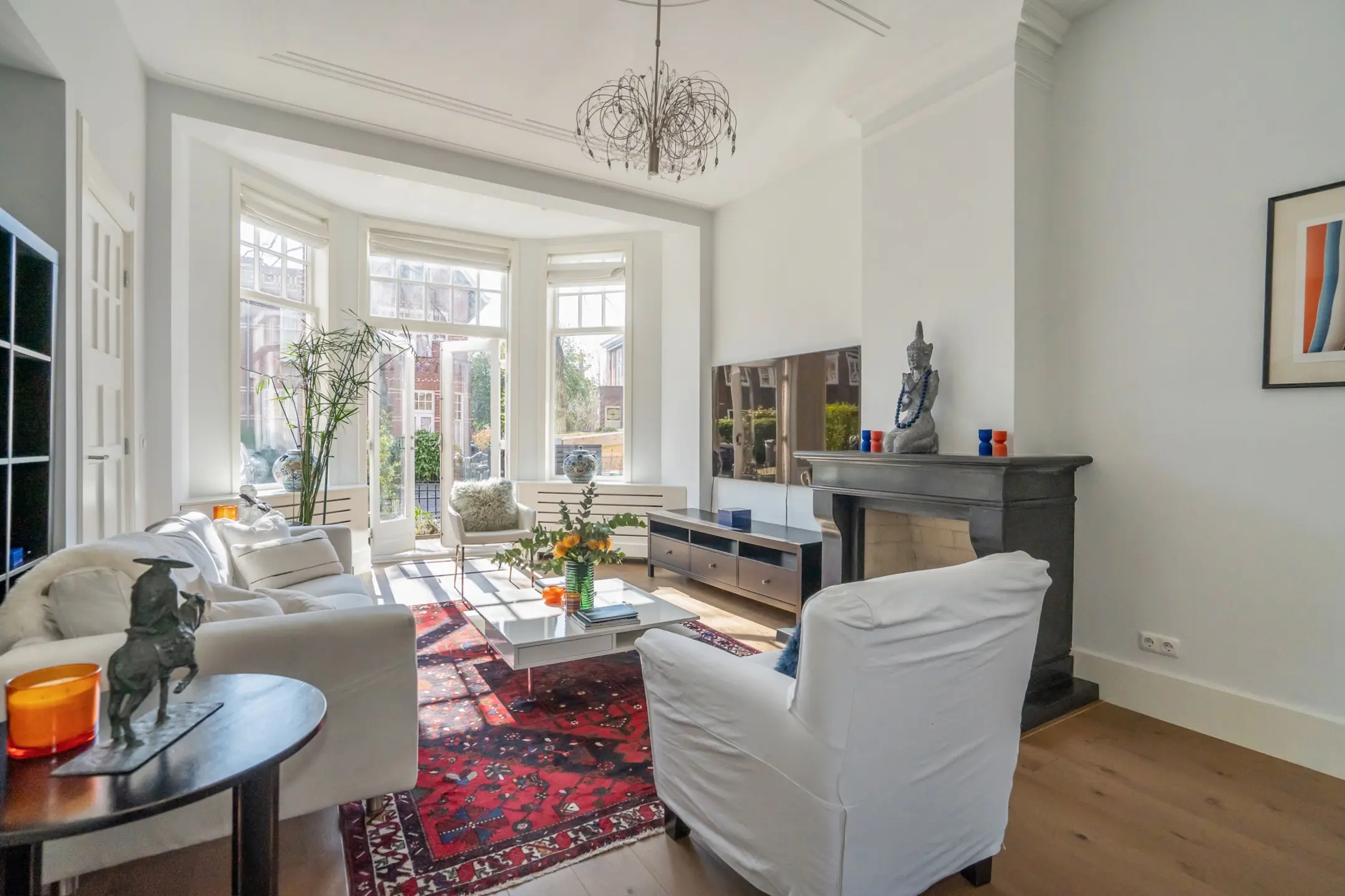 Ground floor: front garden with decorative fencing, entrance to the house, vestibule with draft door, spacious reception hall with a large built-in closet and a renovated toilet with a wall-mounted toilet and small sink. A truly stunning en-suite living room with sliding separation doors and four built-in cupboards, high ceilings with decorative moldings, built-in wardrobe in the front room, double doors to the front garden, and at the rear a contemporary kitchen with a large cooking/prep island equipped with a Quooker, dishwasher, Bora induction hob with integrated extraction, as well as an appliance wall with a fridge-freezer combination, combi oven/microwave, and a separate convection oven. Plenty of cupboard and workspace.