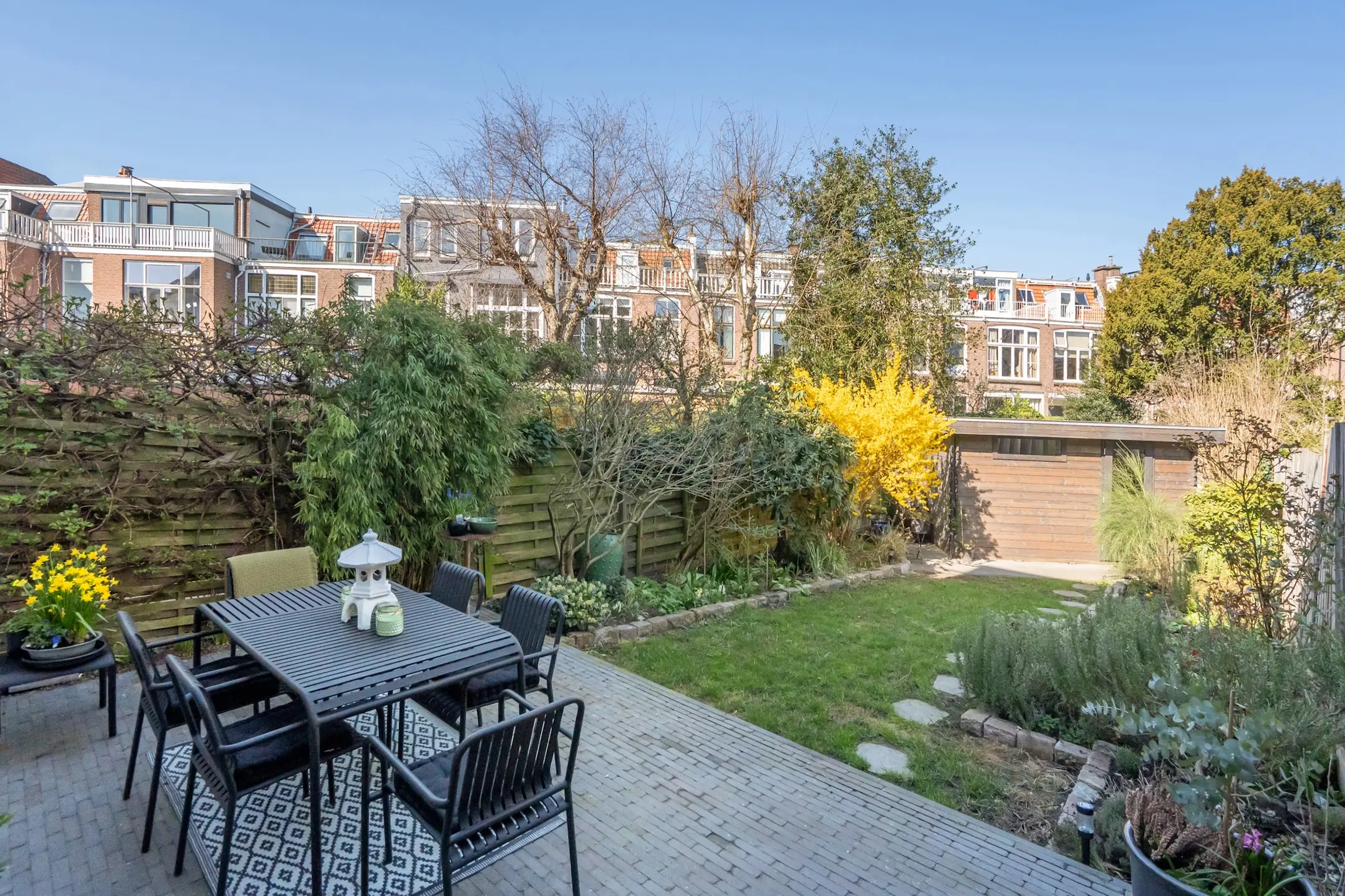 Diepe, goed aangelegde achtertuin met een grote, vernieuwde houten schuur. Elektrisch bedienbaar zonnescherm.