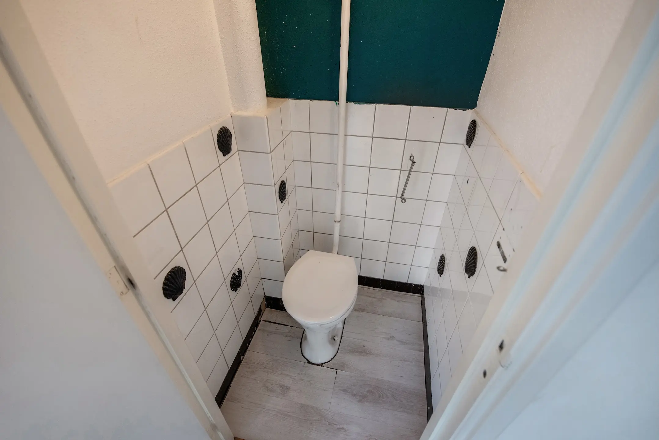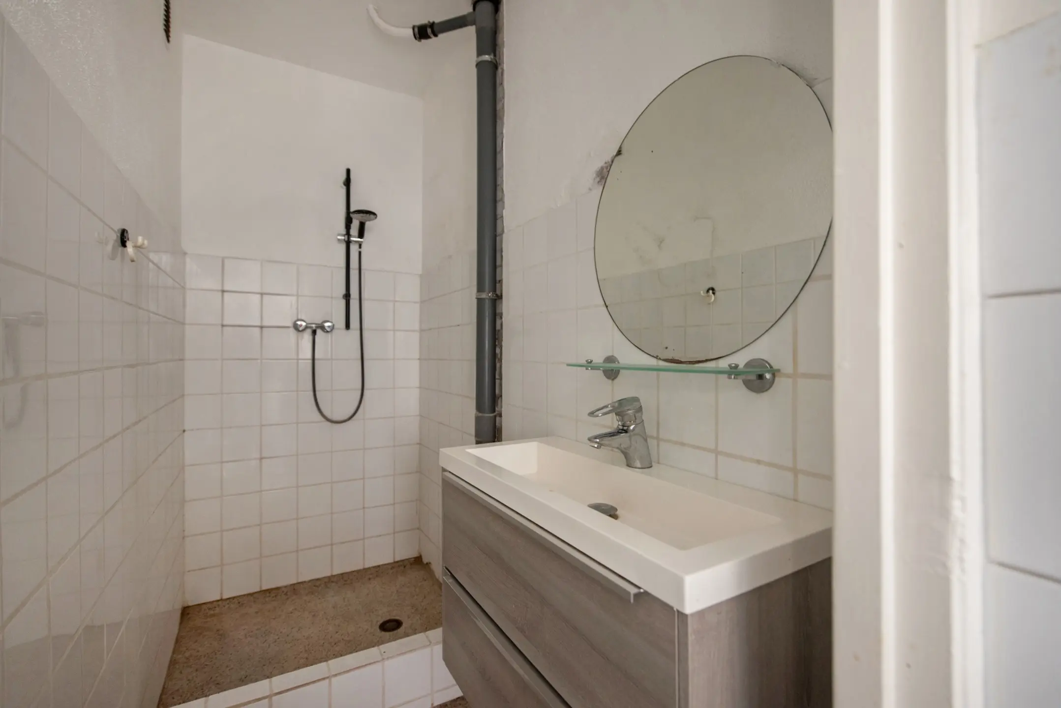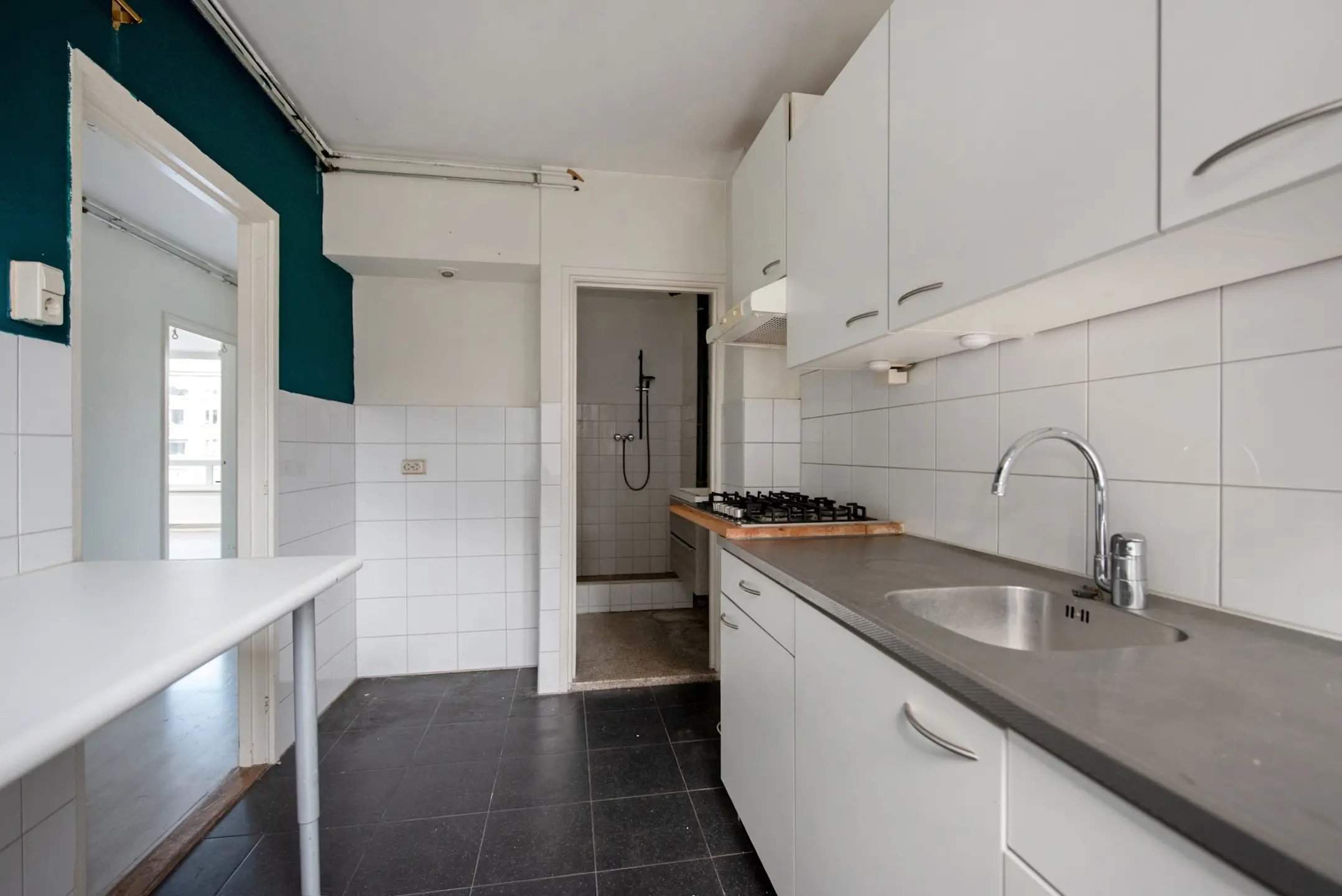 Vanuit de keuken toegang tot de eenvoudige, wit betegelde badkamer met granito vloer, wastafelmeubel en douchegelegenheid, separaat wit betegeld toilet met duoblok.