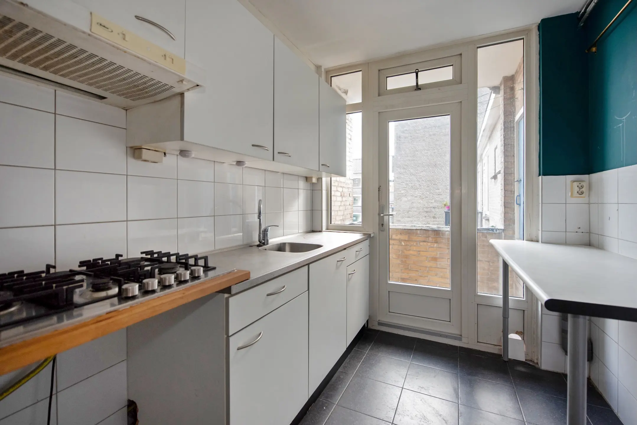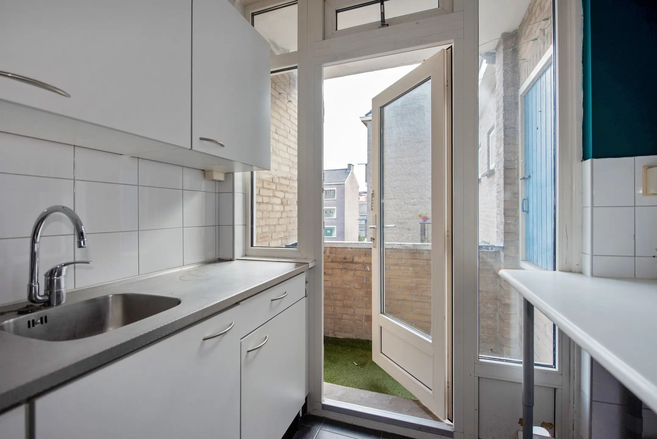Royale keuken met diverse onder- en bovenkasten en deur naar het balkon aan de achterzijde. In de balkonkast staat de HR cv-combi ketel (2016).