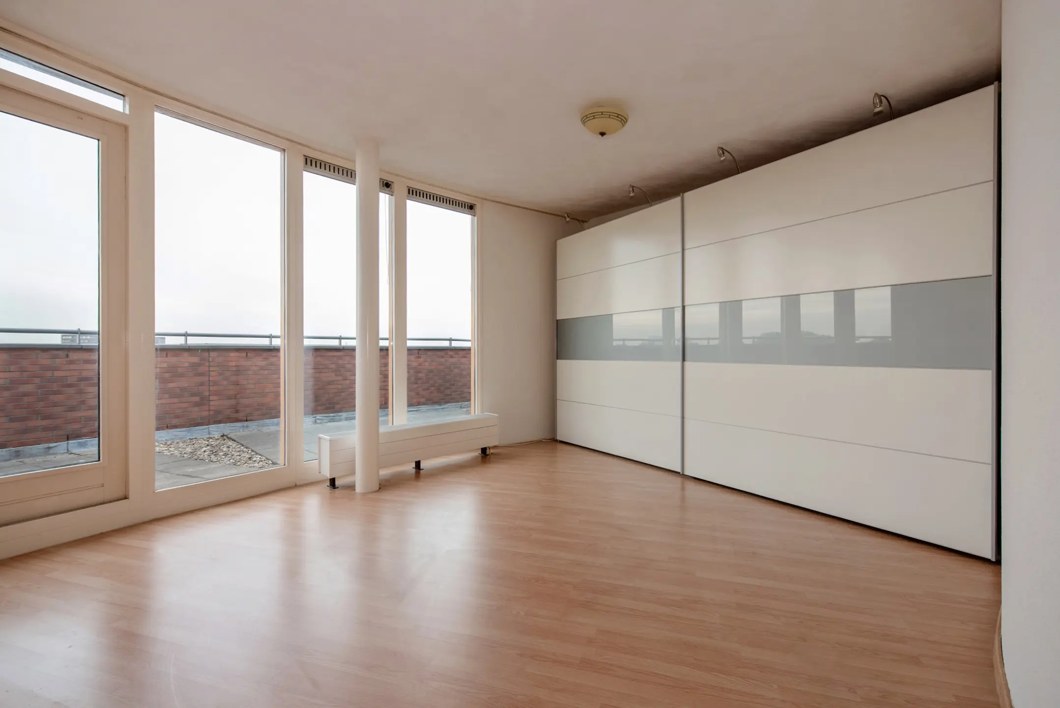 De hoofdslaapkamer is zeer royaal te noemen, de kastenwand blijft.