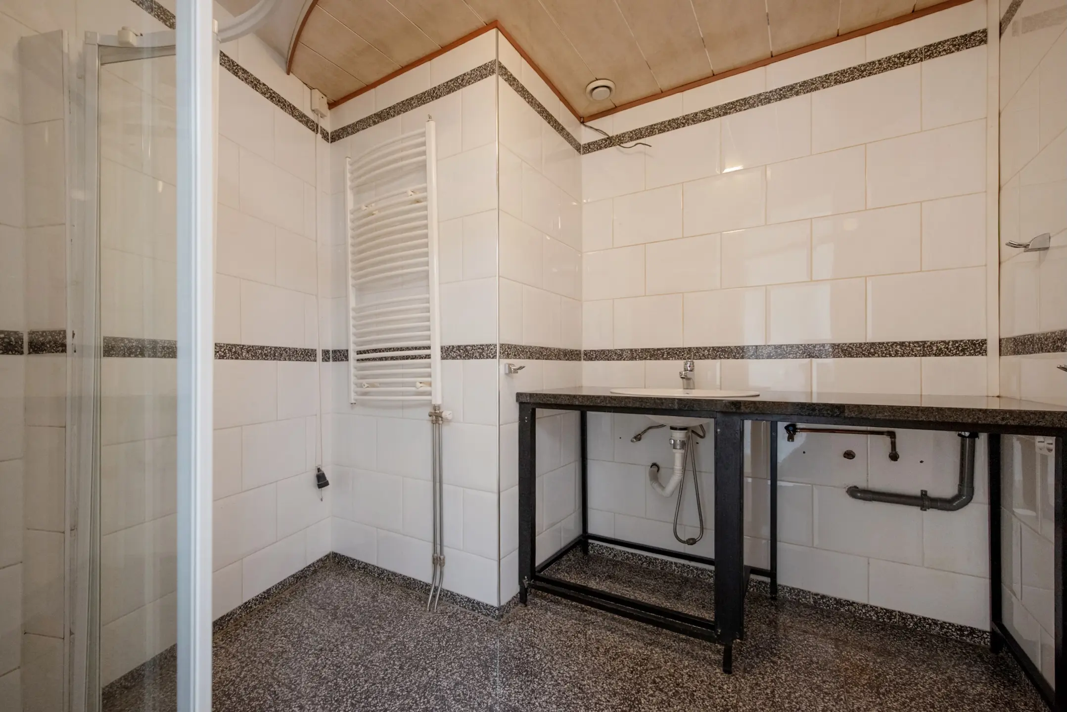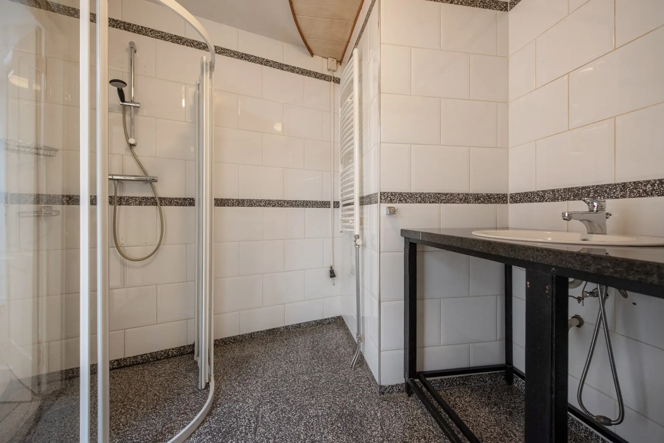 Grote badkamer met een kwartronde douchecabine, wastafel in een granieten blad, daaronder de aansluiting voor de wasmachine alsmede een handdoekenradiator.